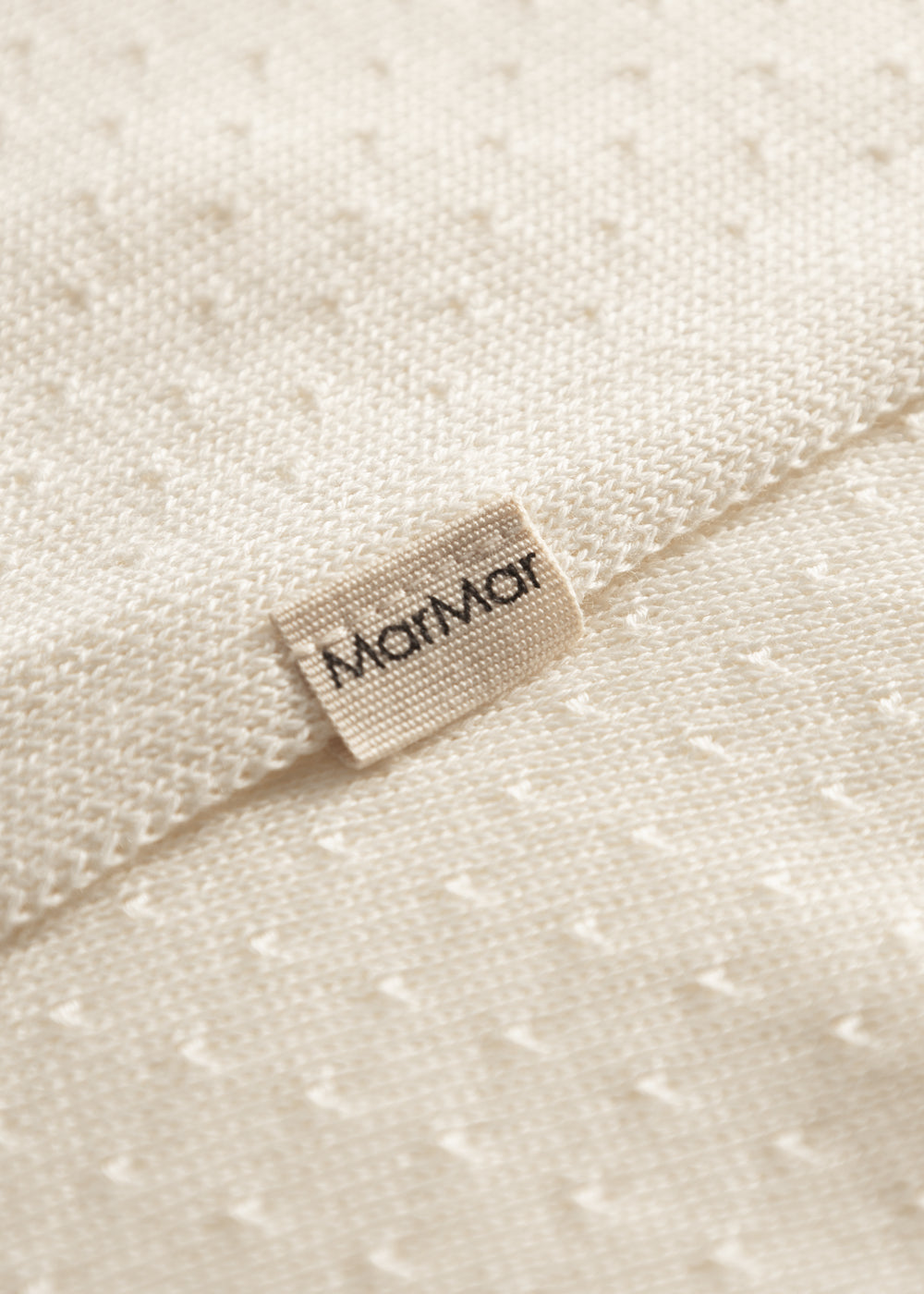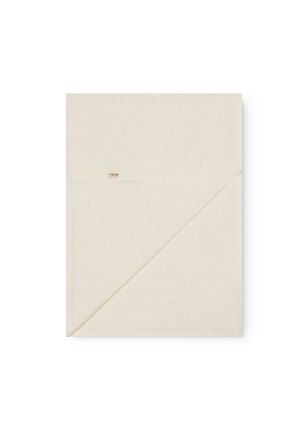 Striktæppe med fint hulmønster, måler 70cm x 100cm.