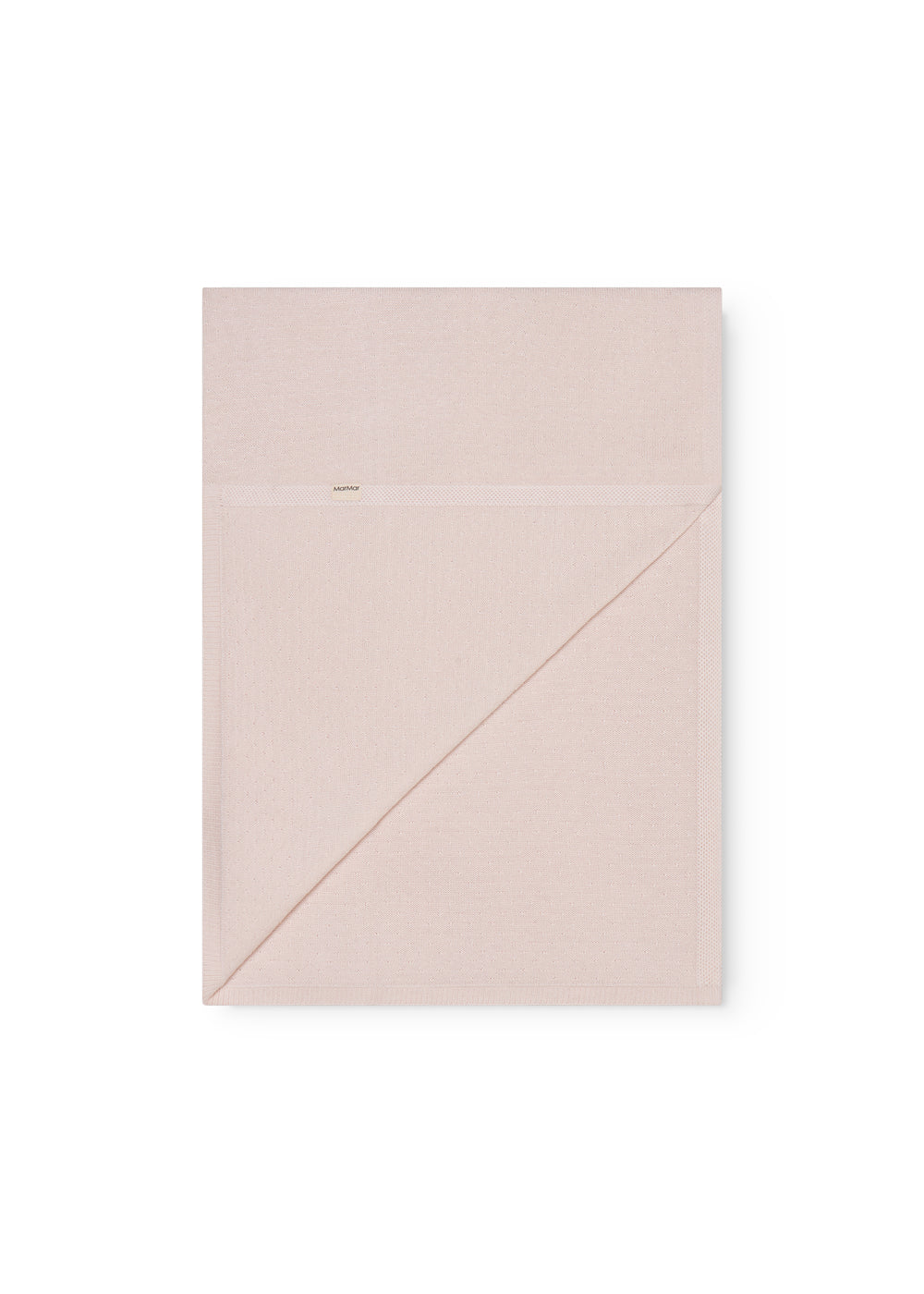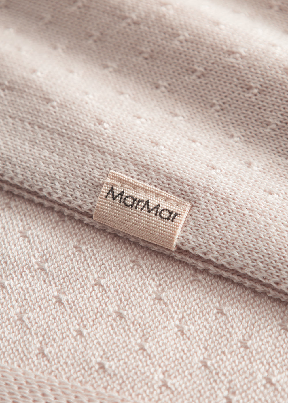 Striktæppe med fint hulmønster, måler 70cm x 100cm.