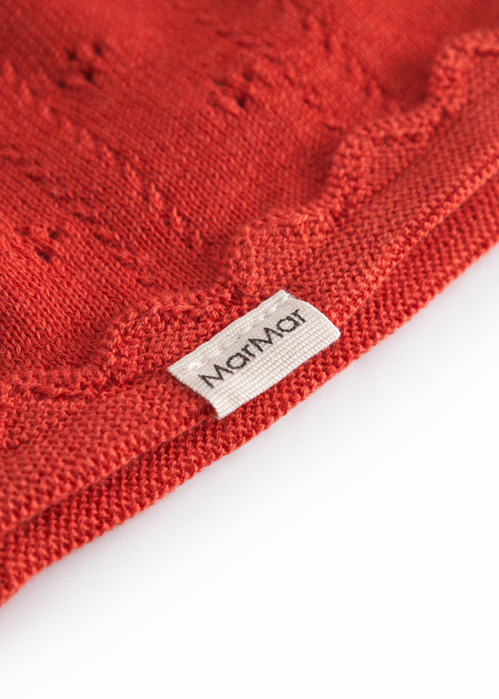 Strikket hue med bindebånd under hagen og fint hulmønster. Huen har bølget kant foran og ribkant i nakken for en blød og behagelig pasform.