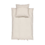 Sengetøj med betræk til dyne og hovedpude i bæk og bølge. Dynebetrækket lukkes med bindebånd i fodenden