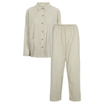 Pyjamassæt med skjorte og bukser i en løs pasform. Skjorten har knaplukning samt to lomme foran og bukserne har elastik i taljen