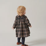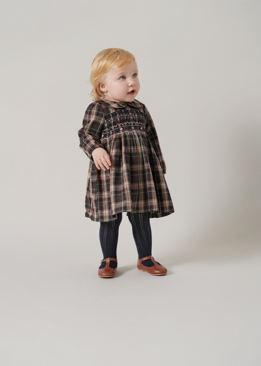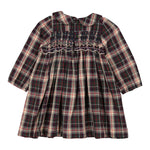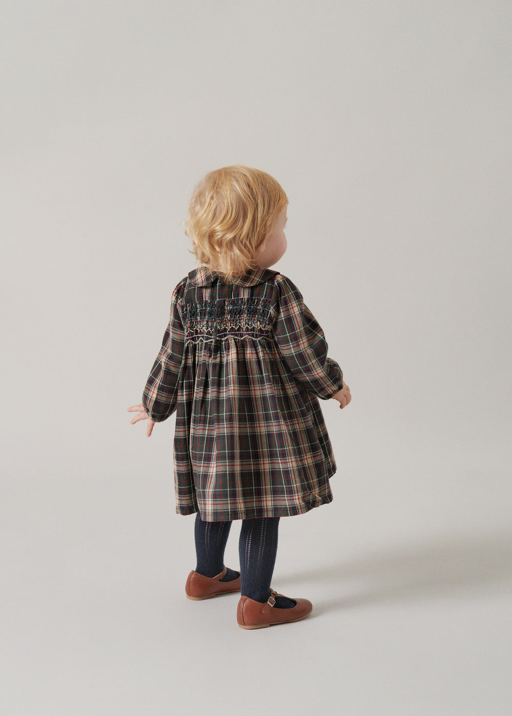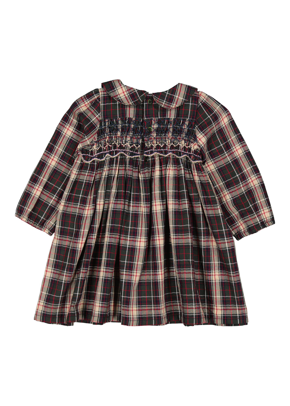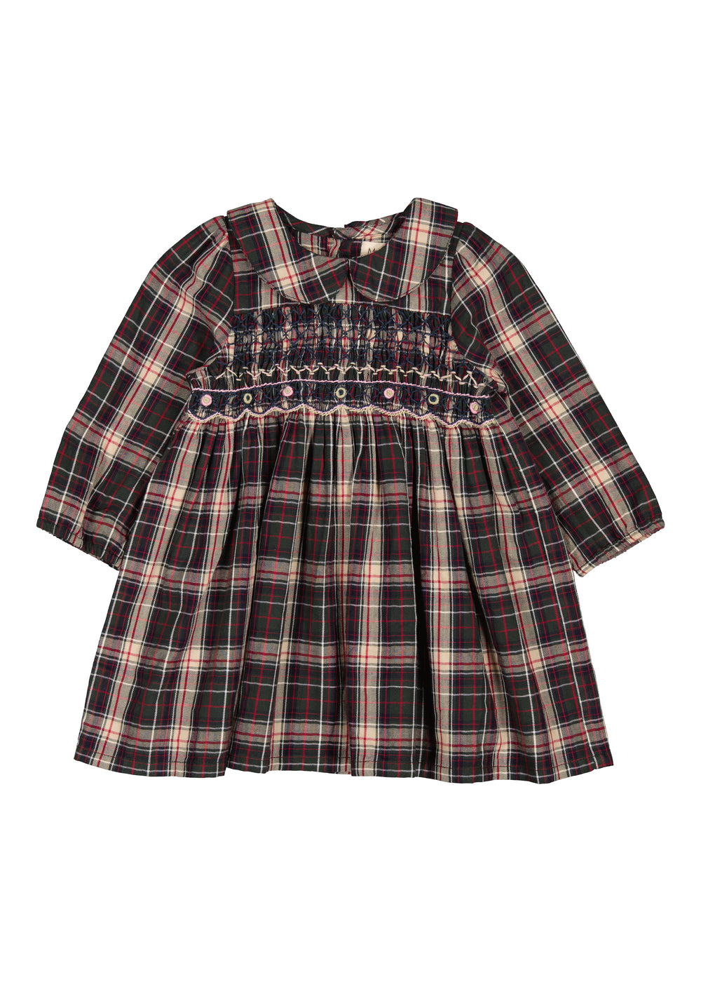 Langærmet kjole med krave og knaplukning bagpå. Kjolen har smock samt broderede detaljer foran og bagpå og kjolens længde går til over knæet