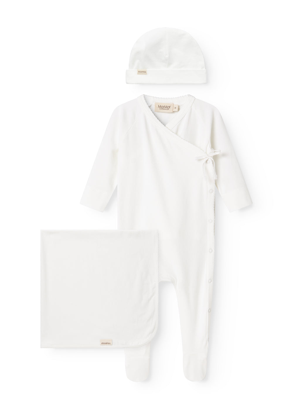 Gaveæske som indeholder et newborn sæt bestående af heldragt, hue og babytæppe.