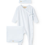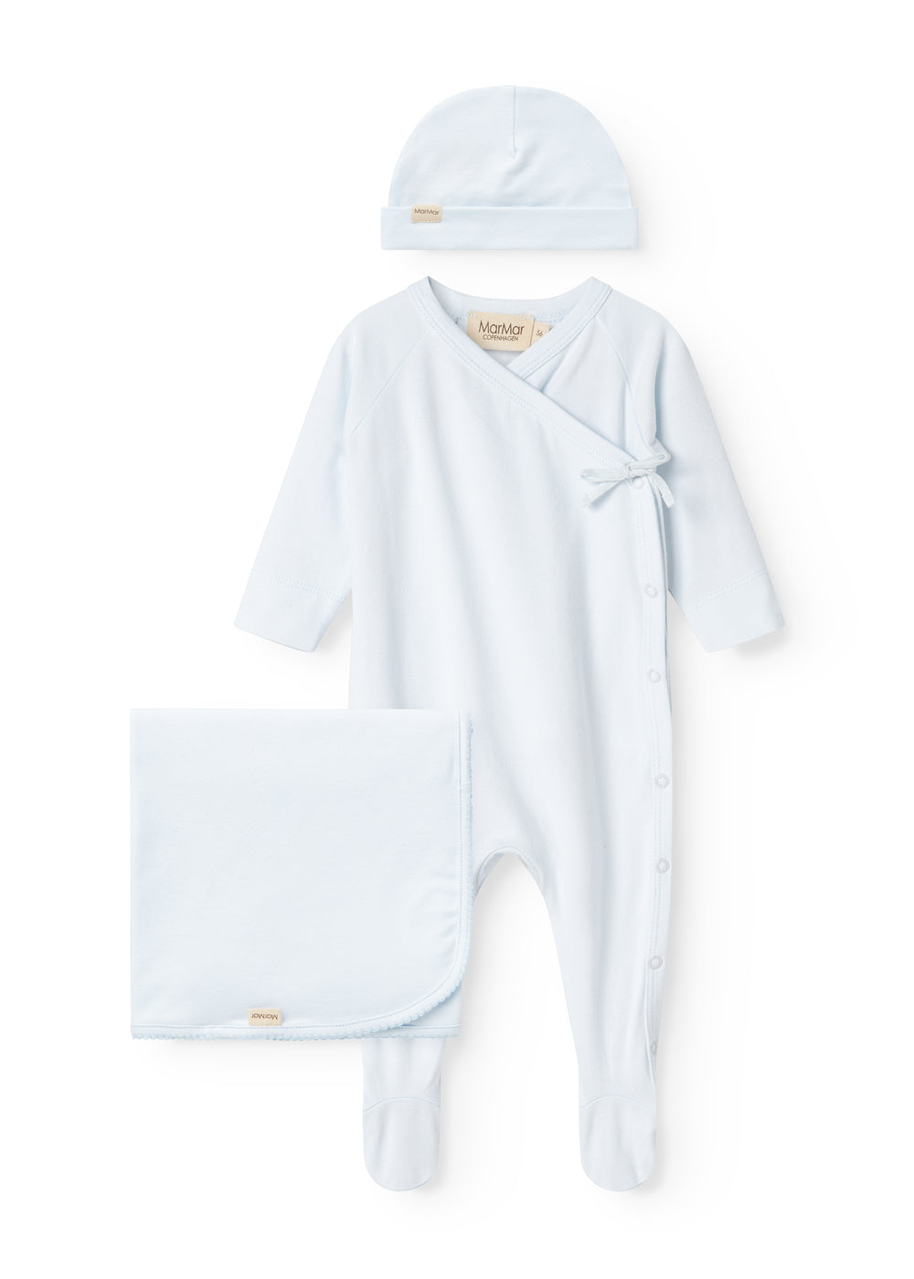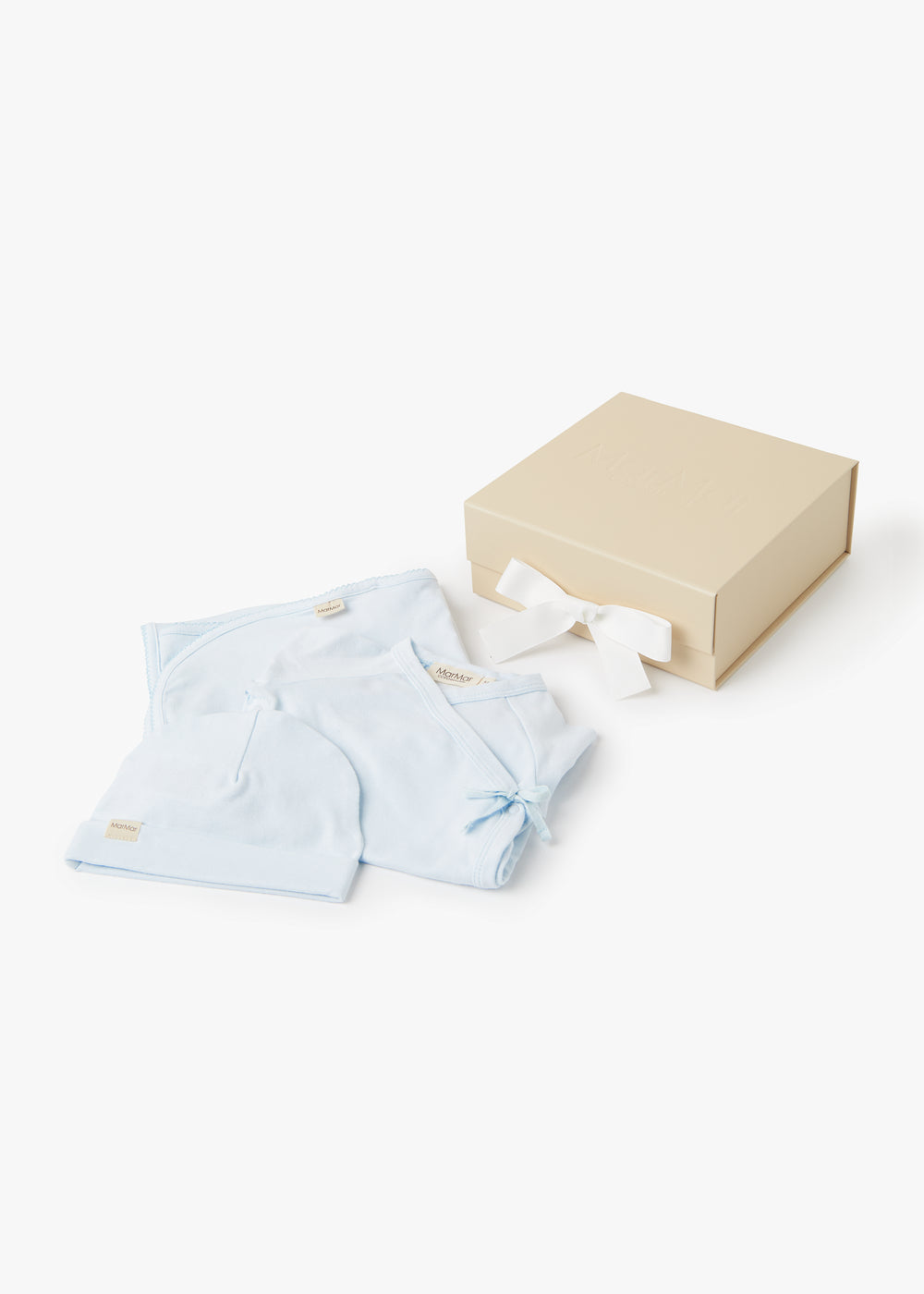 Gaveæske som indeholder et newborn sæt bestående af heldragt, hue og babytæppe.