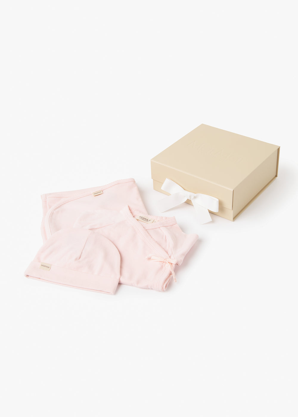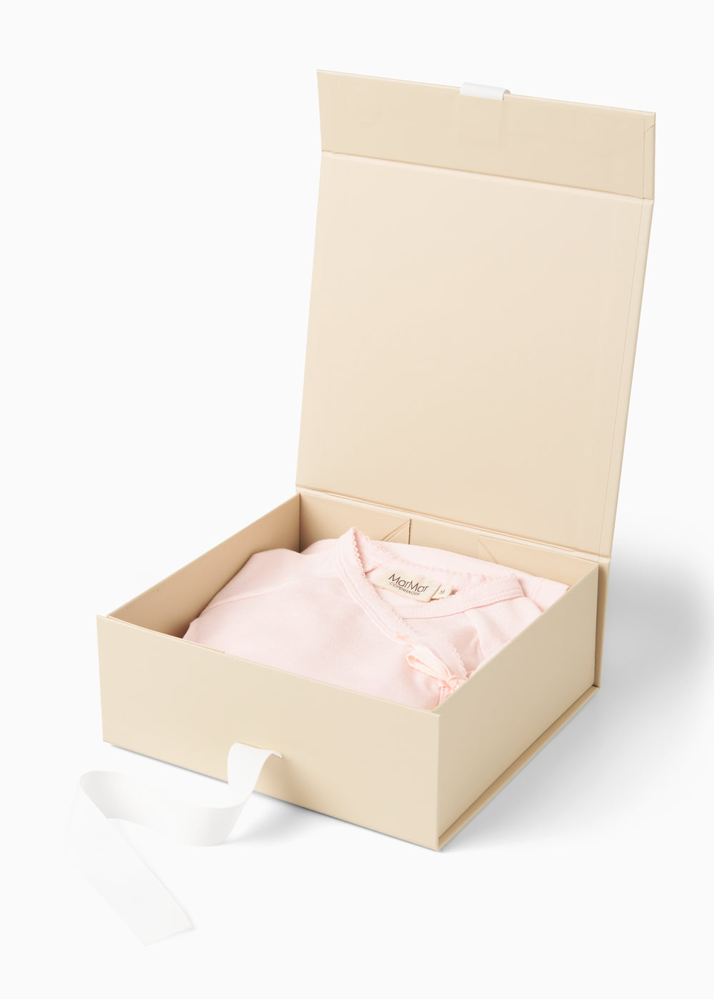 Gaveæske som indeholder et newborn sæt bestående af heldragt, hue og babytæppe.