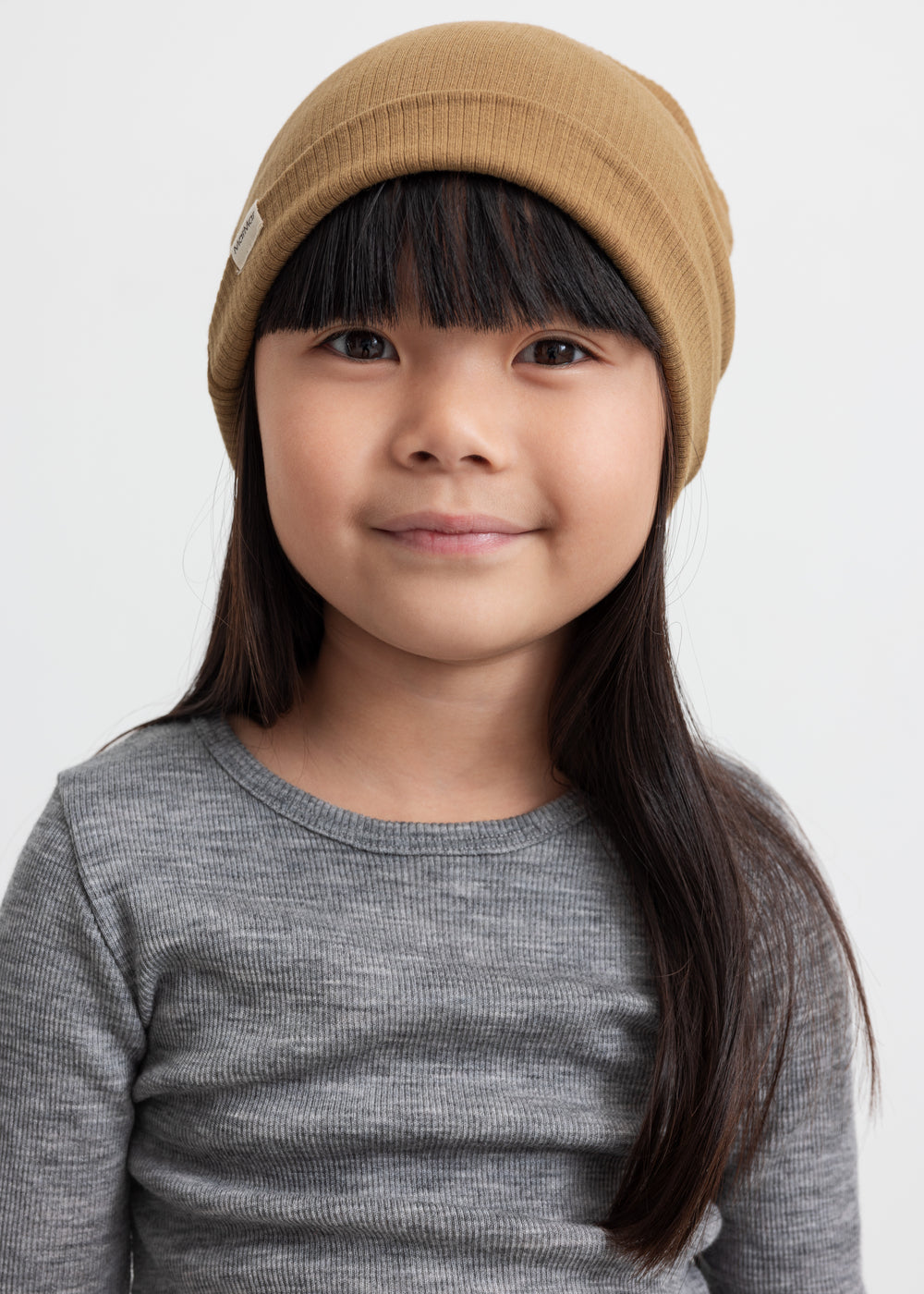 Enkel og sød modal hue til børn. Huen er både ribstrikket, blød, strækbar og behagelig at have på.