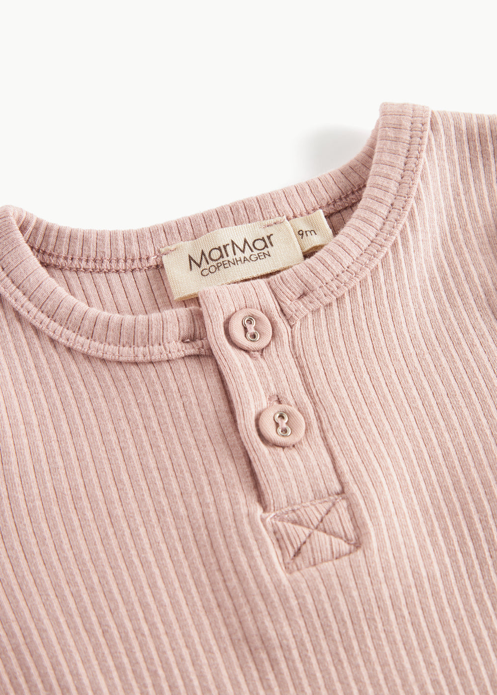 Langærmet baby modal bodystocking med stolpe knaplukning, der bliver lukket med trykknapper mellem benene for nem bleskiftning. Bodystockingen er både ribstrikket, blød, holder form og farve og har elastan i sig som gør den strækbar og behagelig at have på.