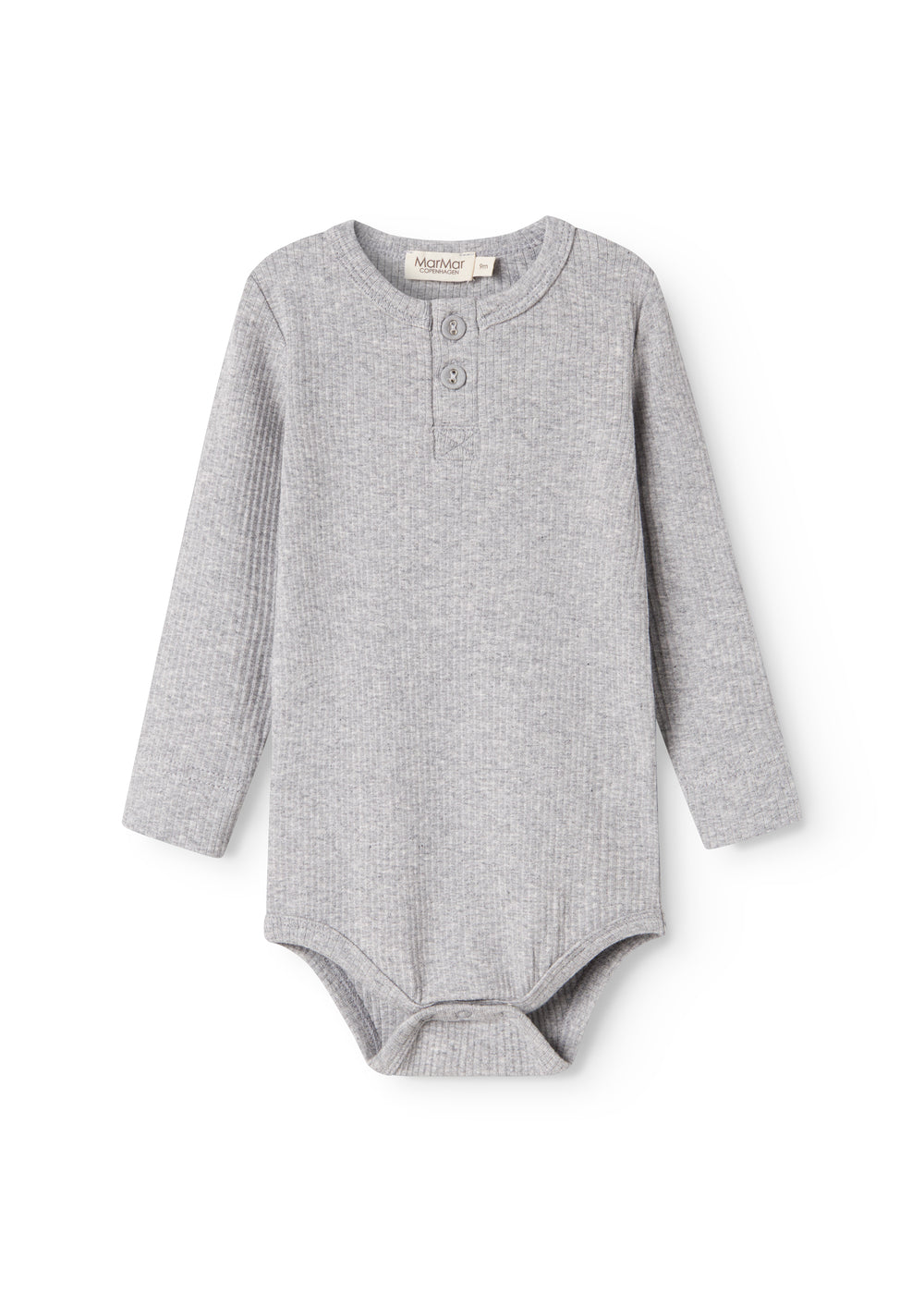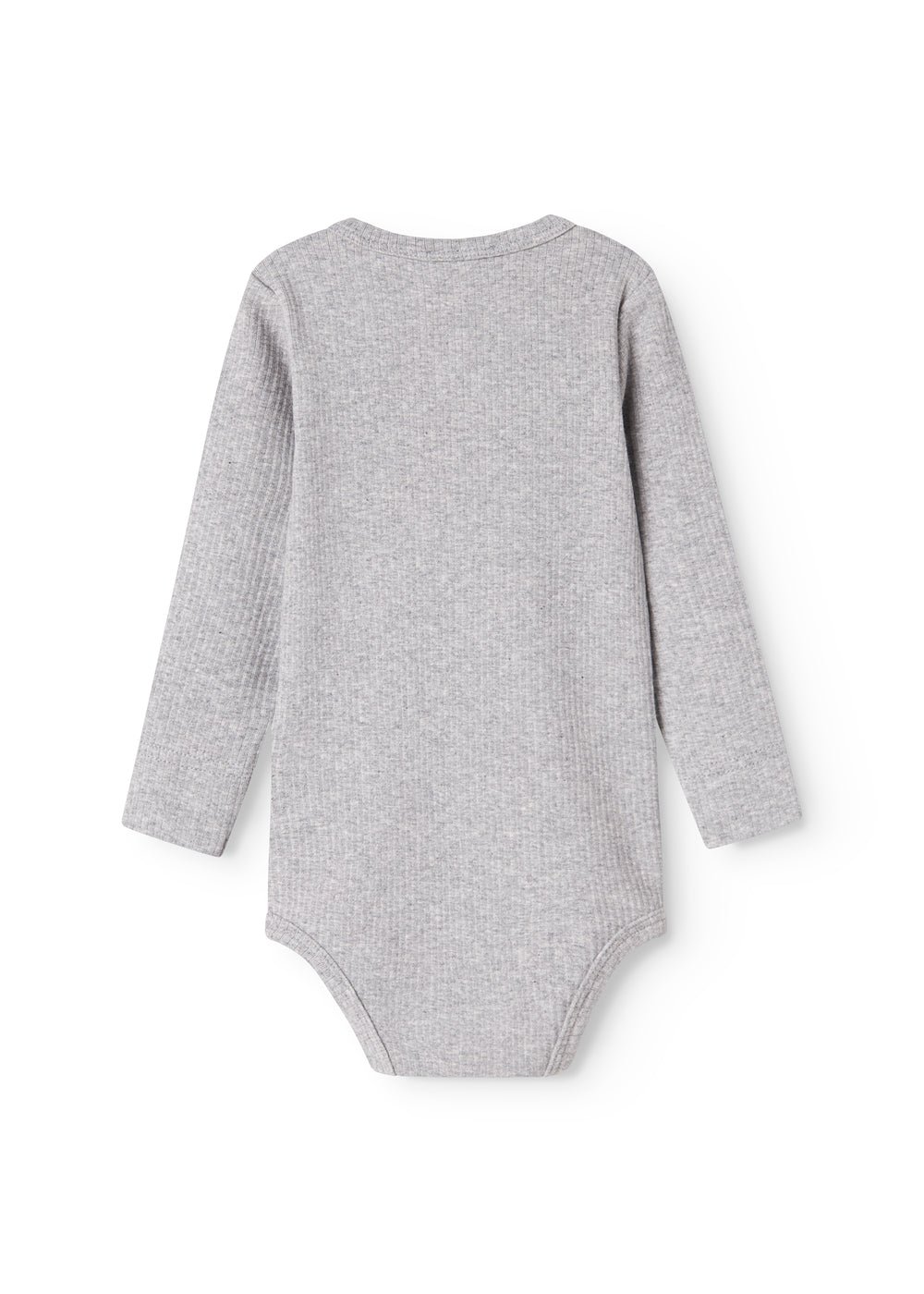 Langærmet baby modal bodystocking med stolpe knaplukning, der bliver lukket med trykknapper mellem benene for nem bleskiftning.