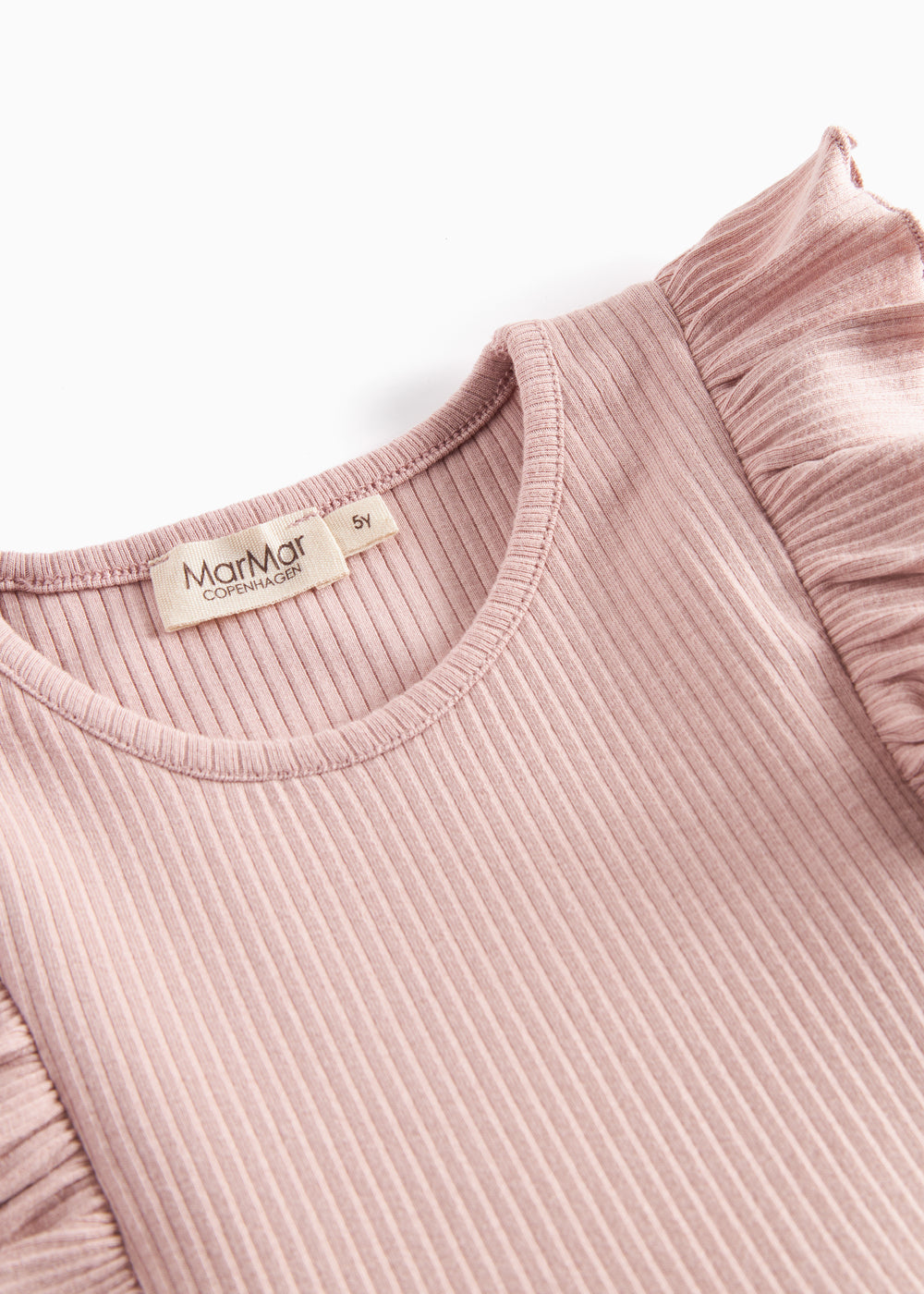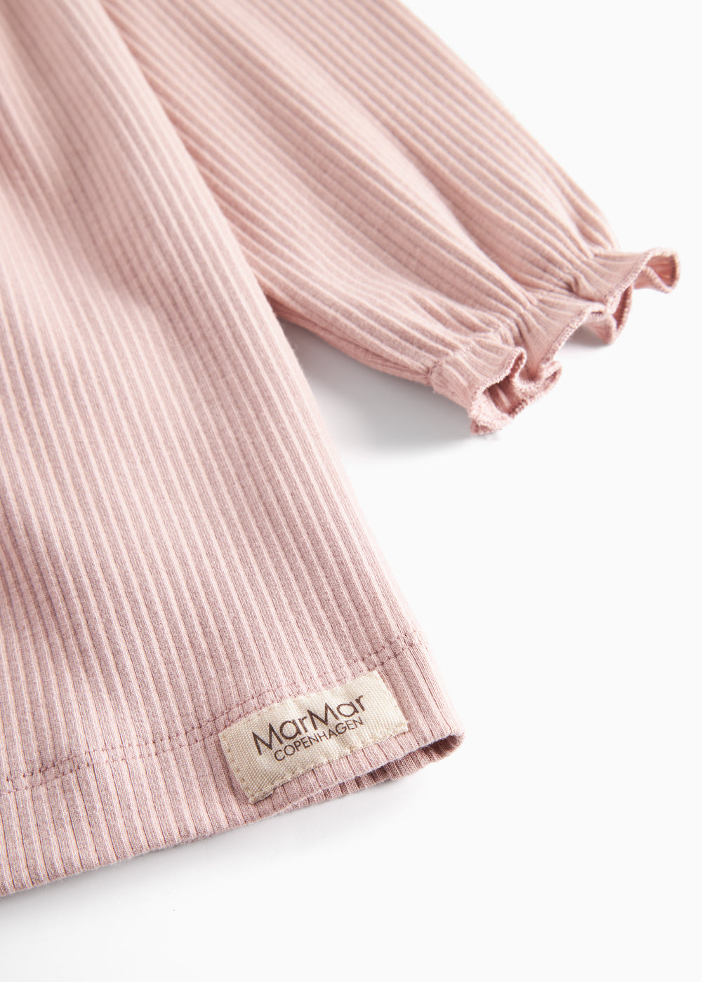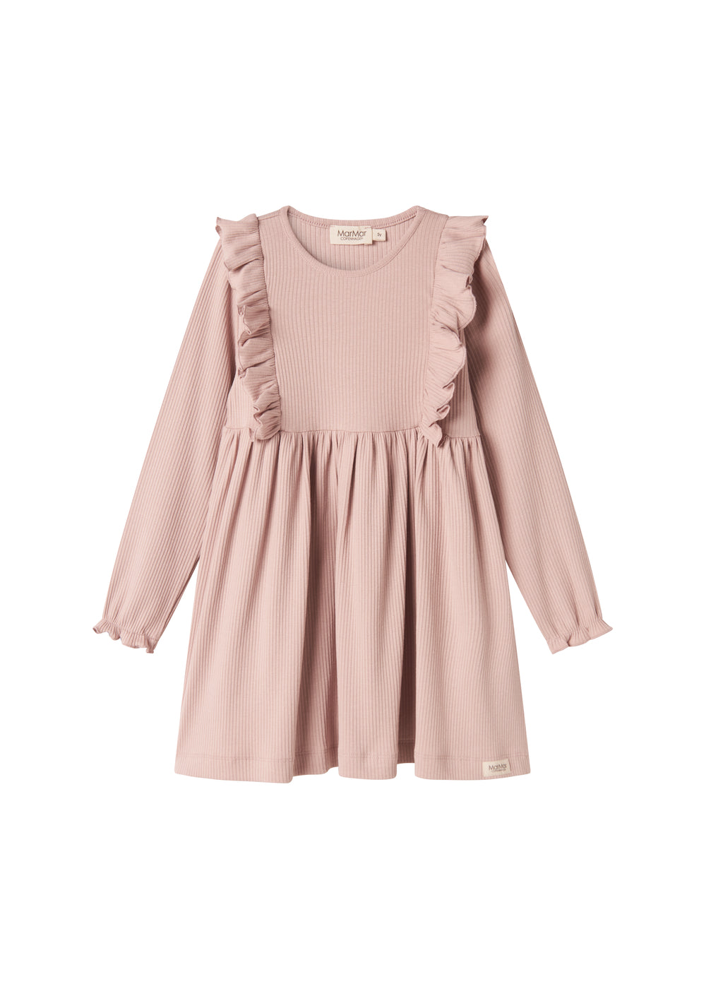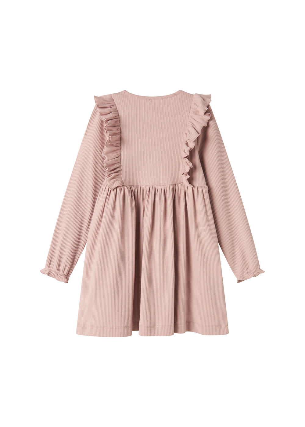 Langærmet kjole med flæsedetaljer. Kjolens længde går til over knæet. Kjolen er ribstrikket, blød, strækbar og behagelig at have på.