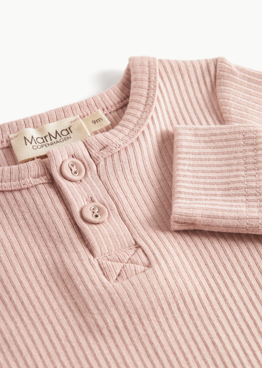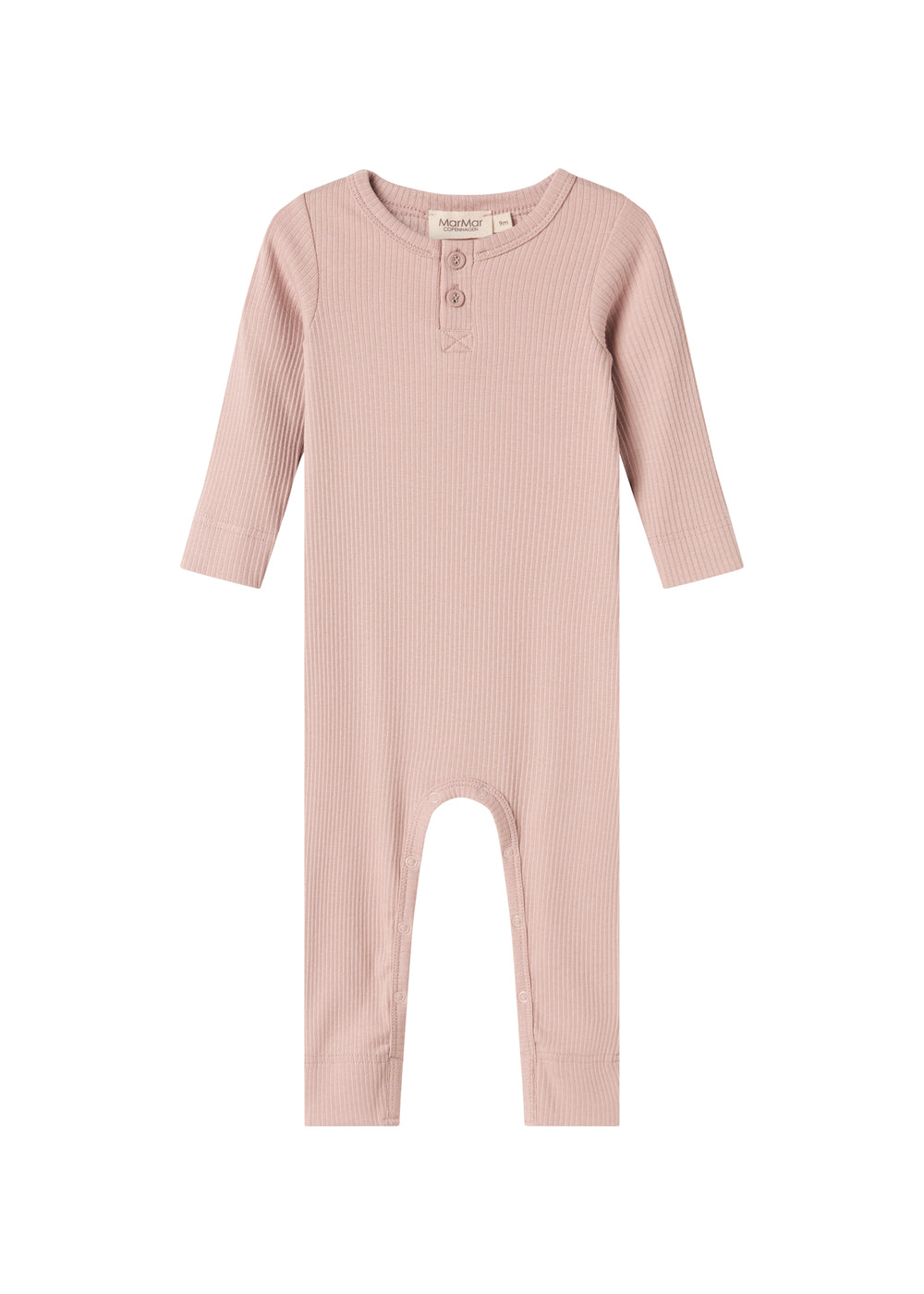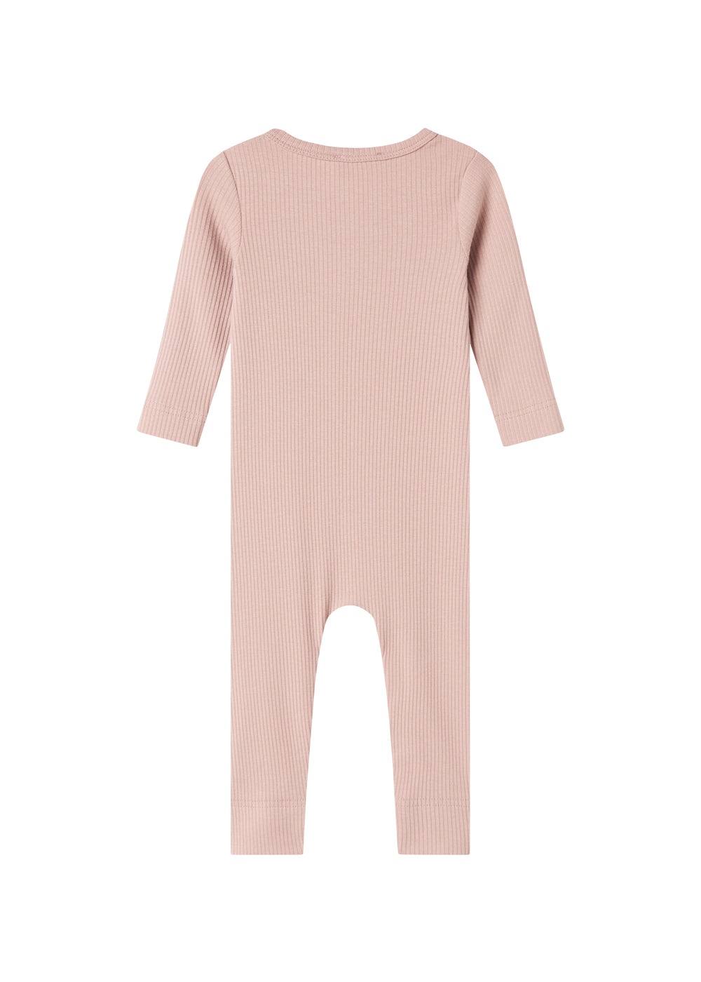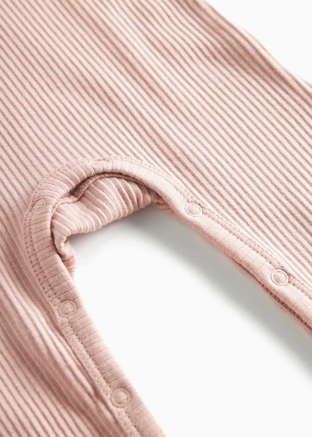 Heldragt til baby med stolpe knaplukning, der bliver lukket med trykknapper mellem benene for nem bleskiftning. Heldragten er ribstrikket, blød, strækbar og behagelig at have på.