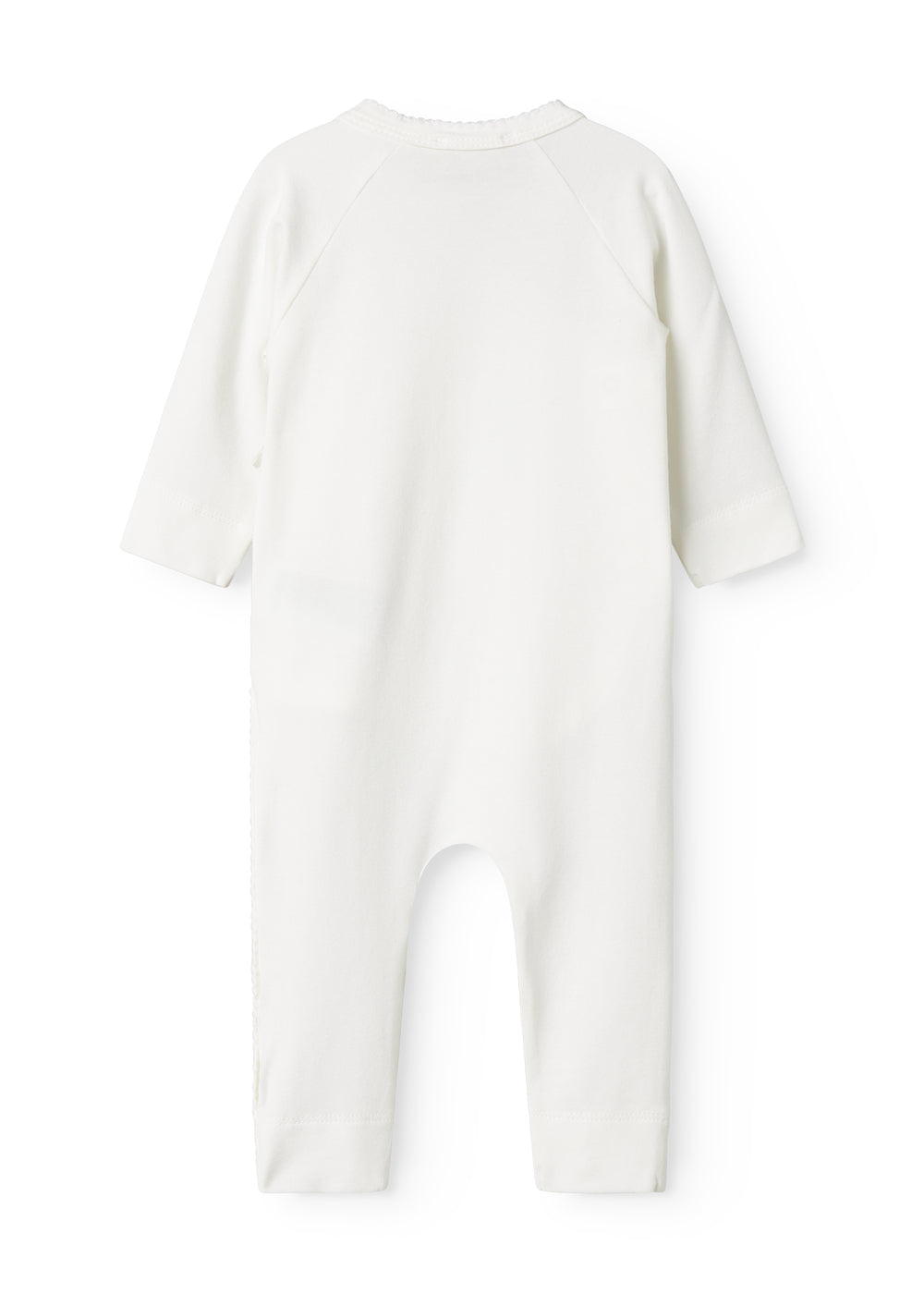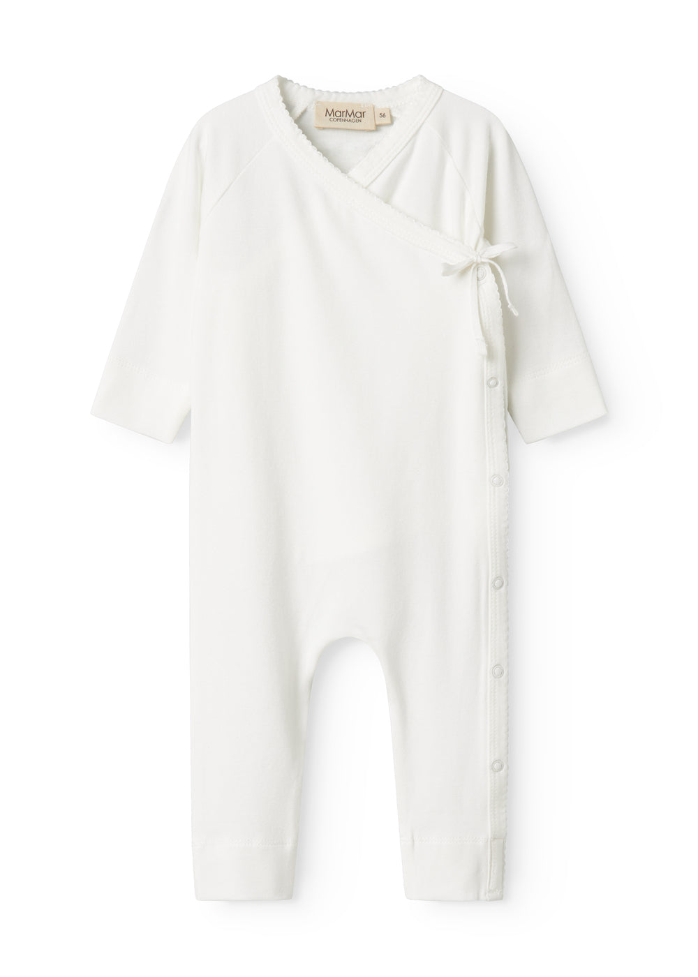 Langærmet heldragt med slå-om-lukning, heldragten lukkes med trykknapper og bindebånd fra halsen og ned langs det ene ben.