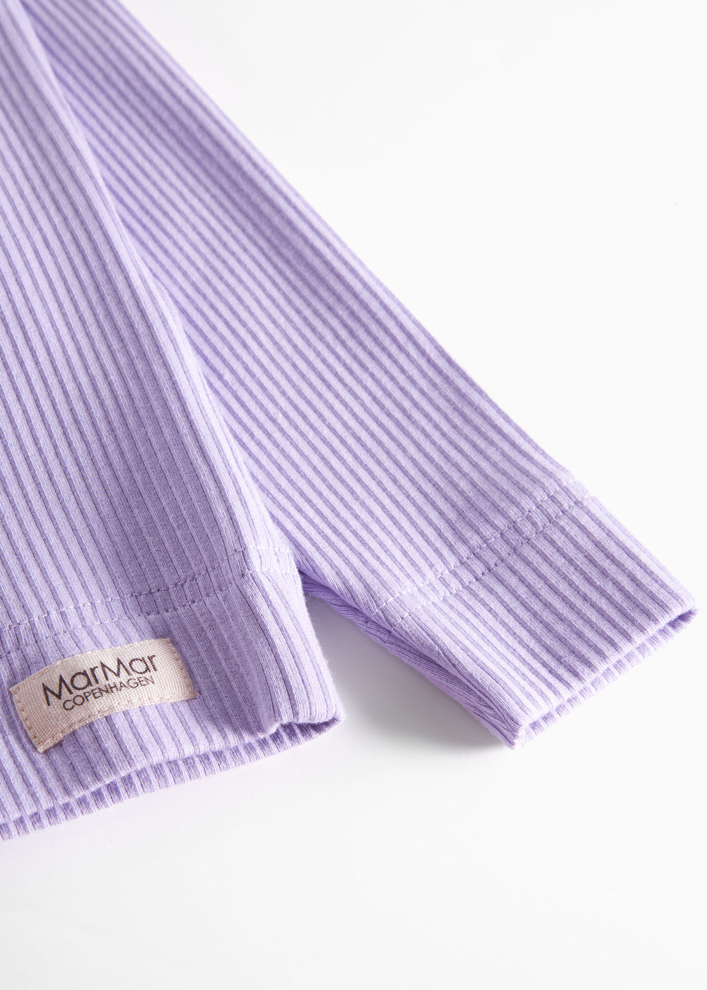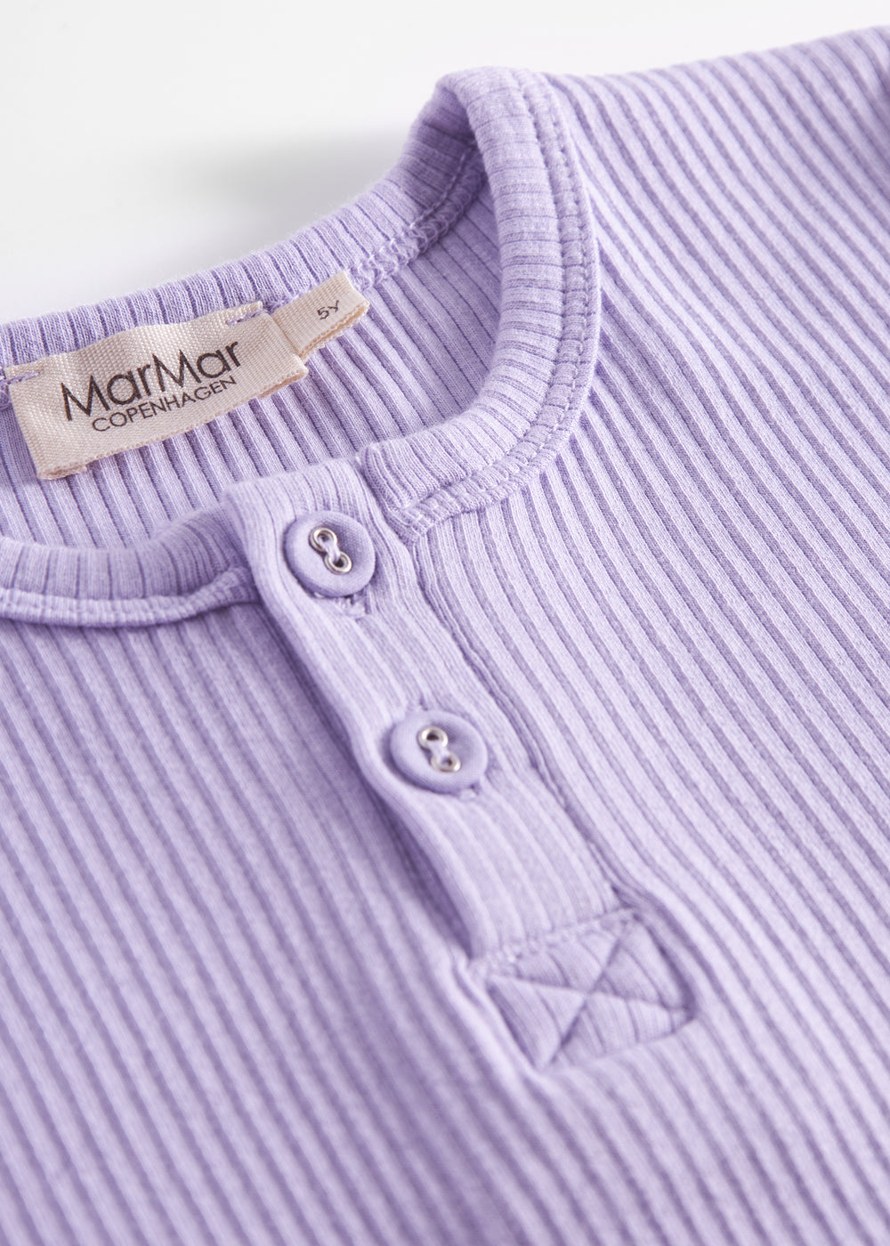 Langærmet t-shirt til børn med stolpe knaplukning. T-shirten er ribstrikket, blød, strækbar og behagelig at have på.