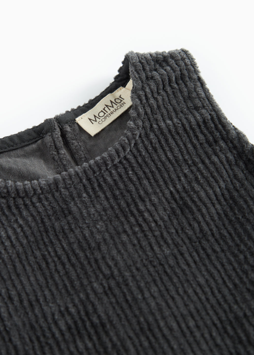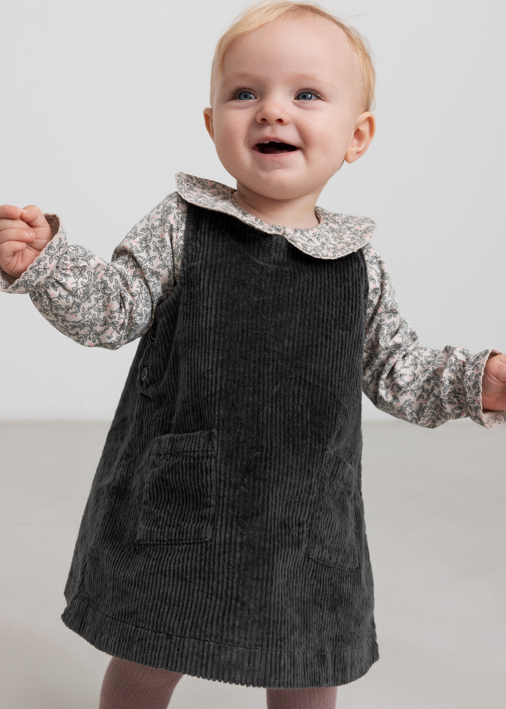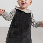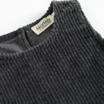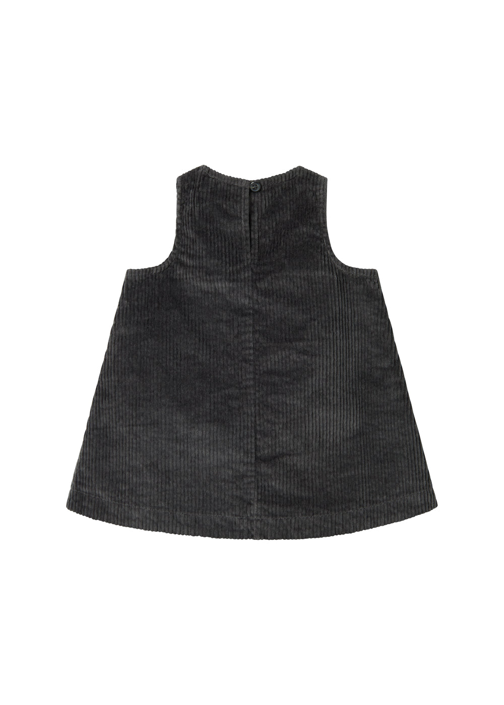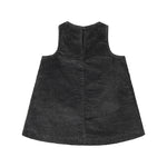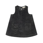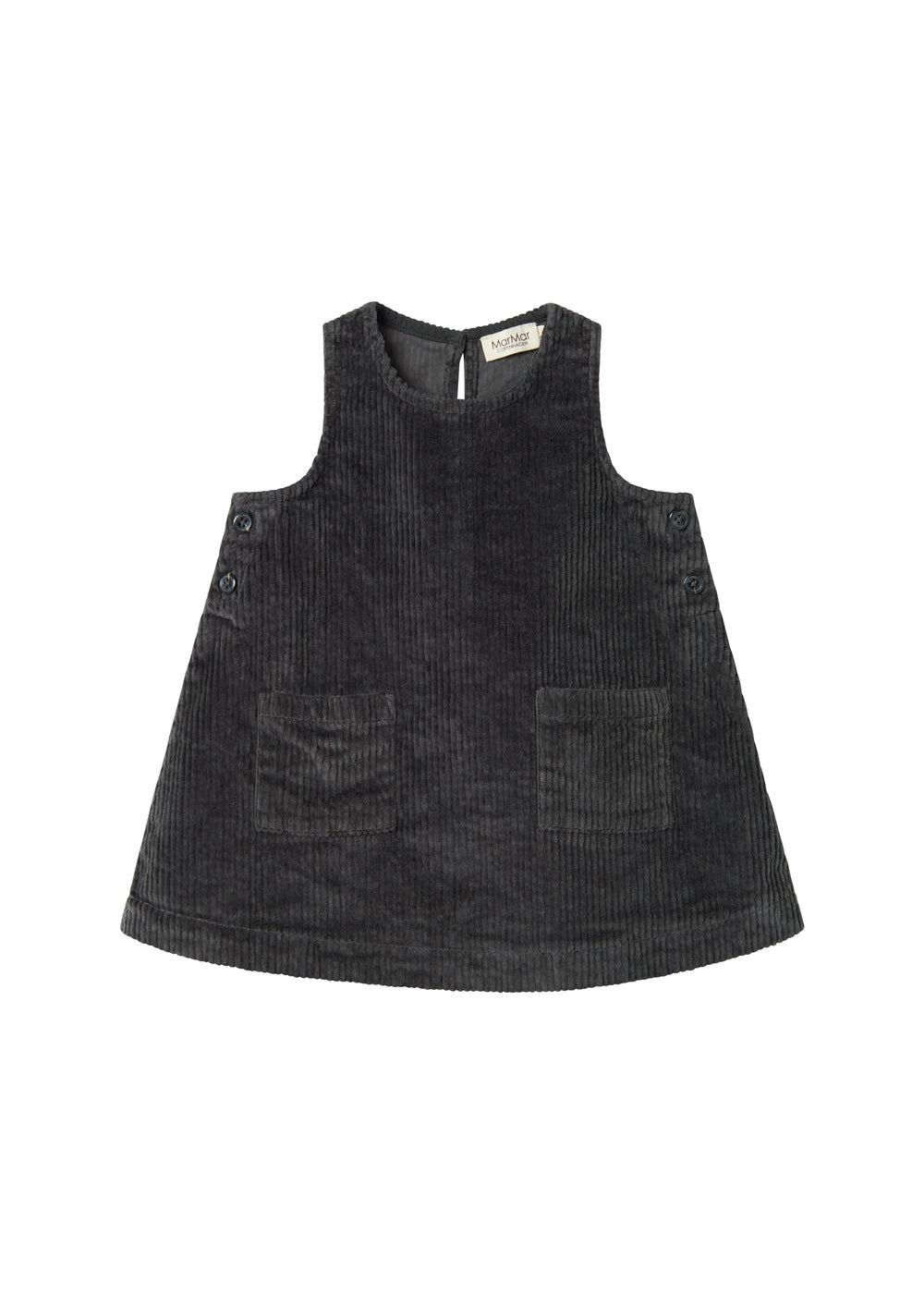 Løstsiddende ærmeløs fløjlskjole til baby med to lommer foran og knaplukning i siderne samt bagpå, hvilket gør det nemt at tage kjolen af og på.