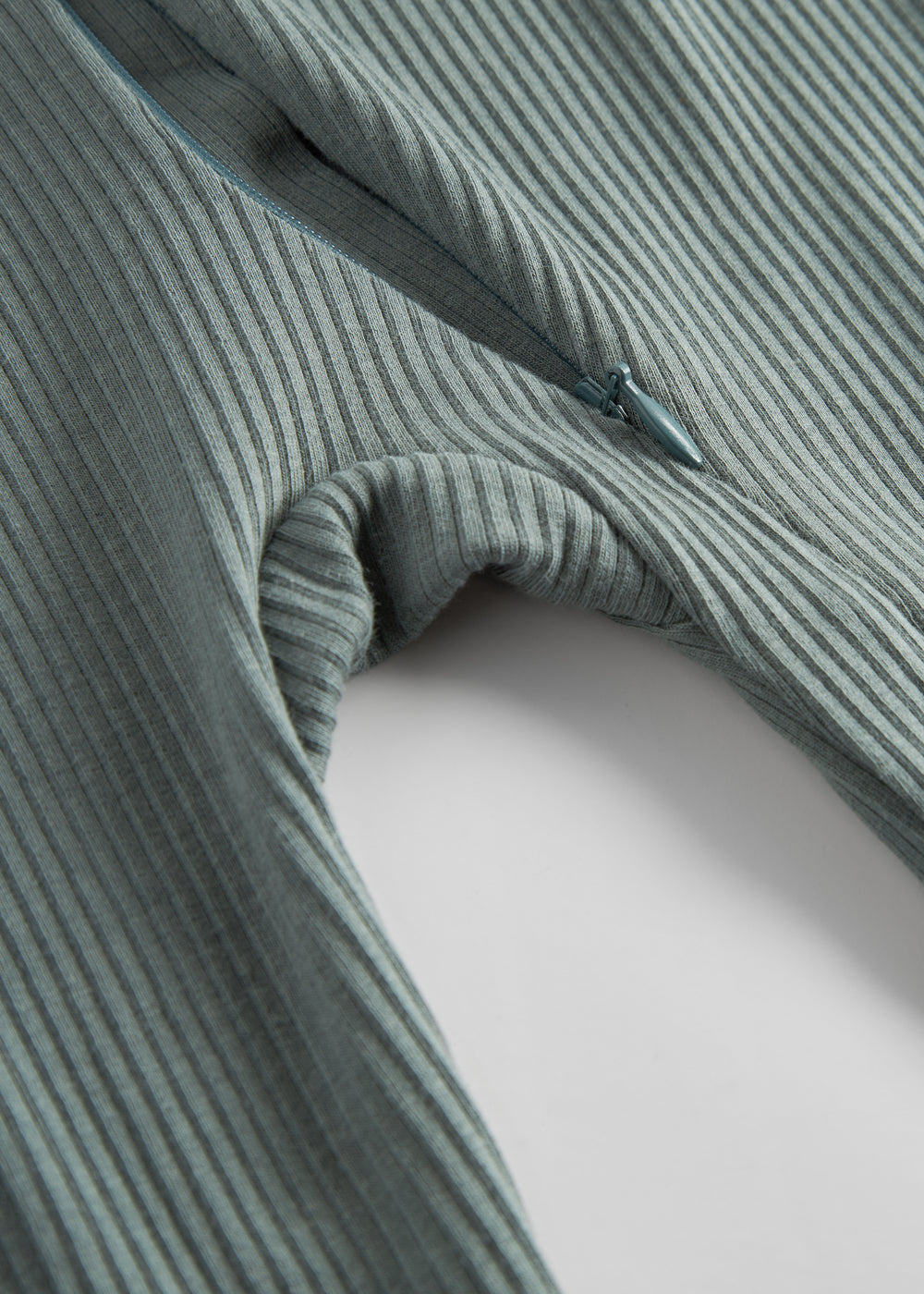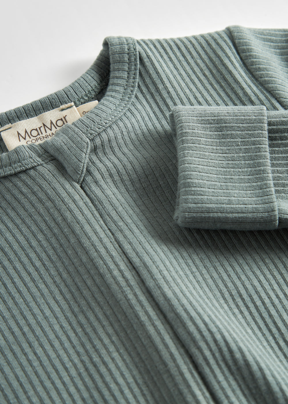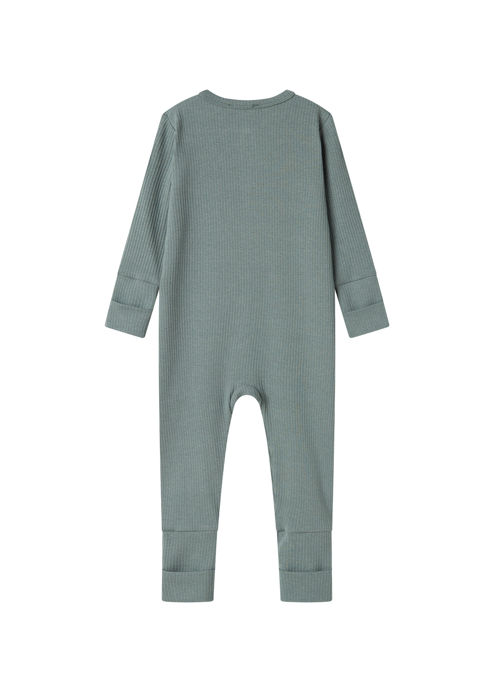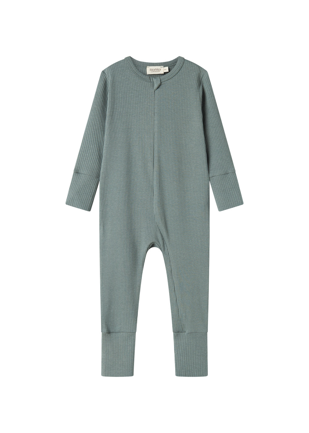 Enkel langærmet heldragt der kan lynes helt fra hals og ned langs det ene ben med lynlås for nem bleskiftning. Heldragten har ombuk ved både ærmer og ben, som kan justeres i takt med barnets vækst. Heldragten har ydermere foldbar vante/strømpe funktion fra str. 2-4M. Heldragten er ribstrikket, blød, strækbar og behagelig at have på.