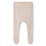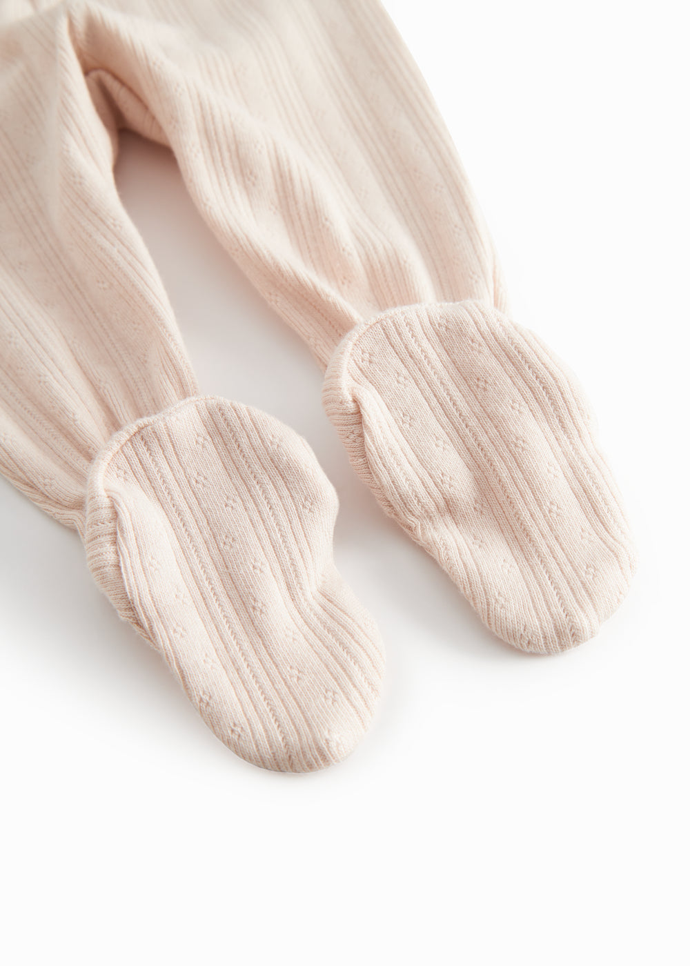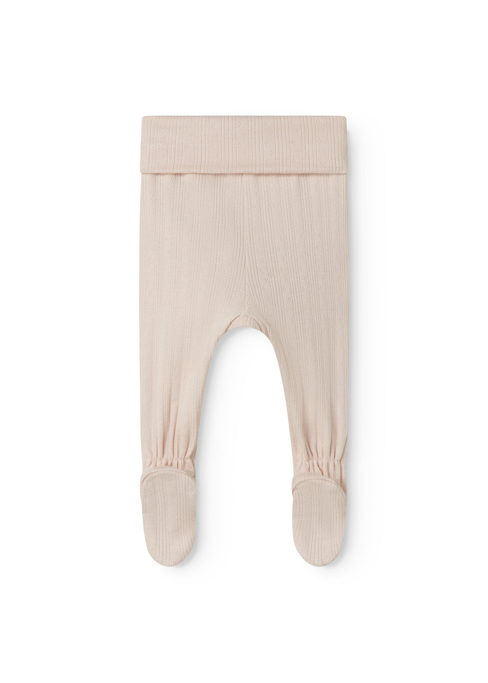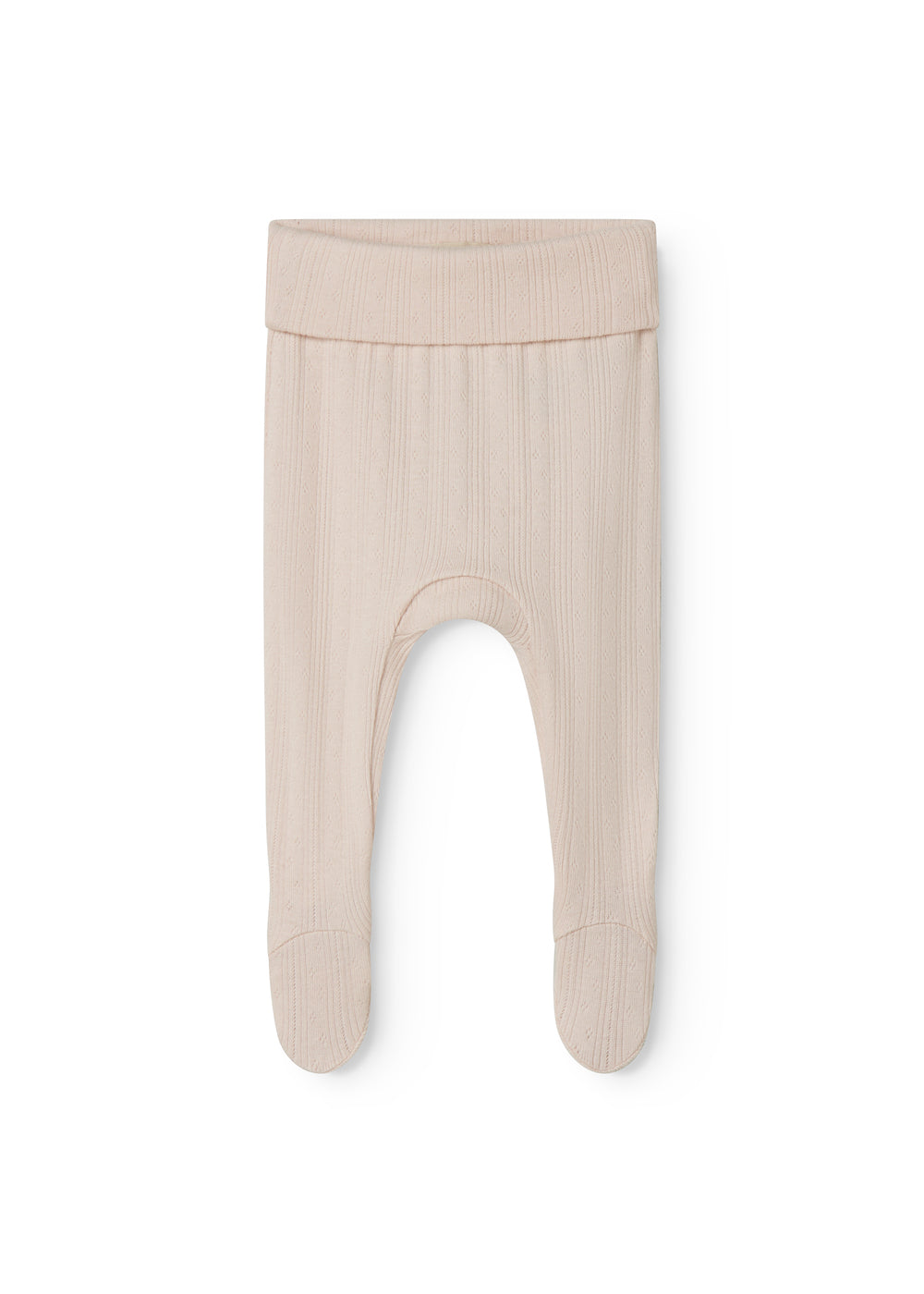 Behagelige pointelle bukser med fødder til de nyfødte. Bukserne er bløde, strækbare og behagelige at have på.