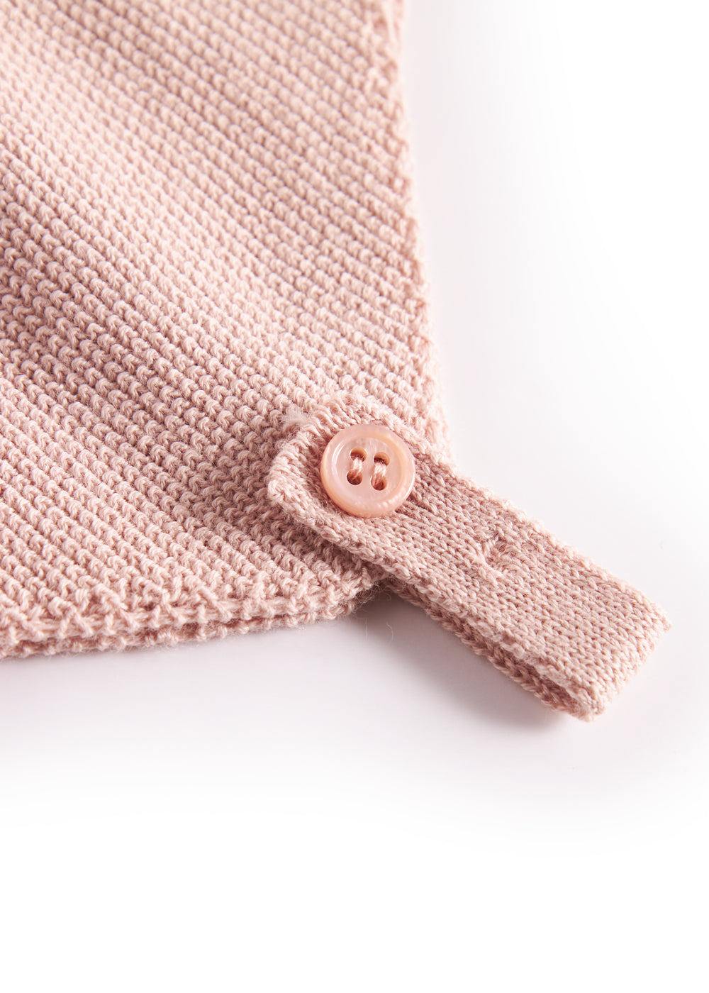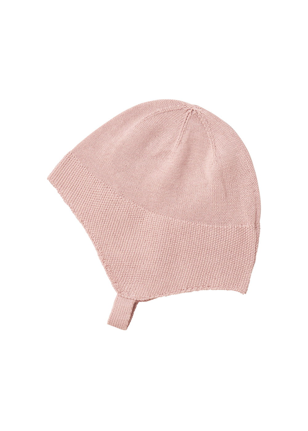 Hue i perlestrik til baby der går ned over ørene, med en rem under hagen der lukkes med knap i to længder. Huen er både blød, varm og behagelig at have på.