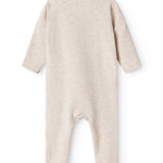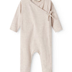 Langærmet heldragt med slå-om-lukning, heldragten lukkes med trykknapper og bindebånd fra halsen og ned langs det ene ben.