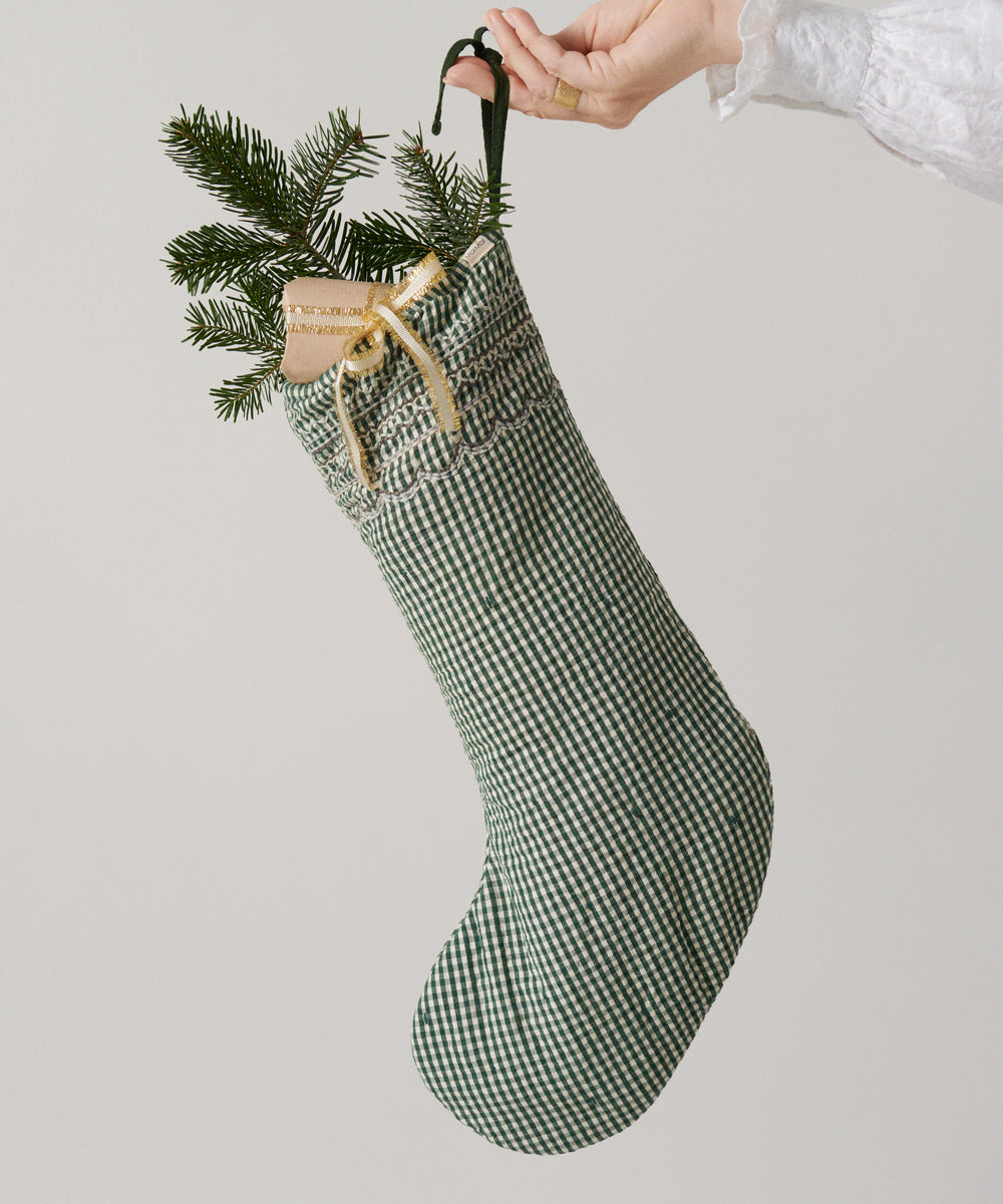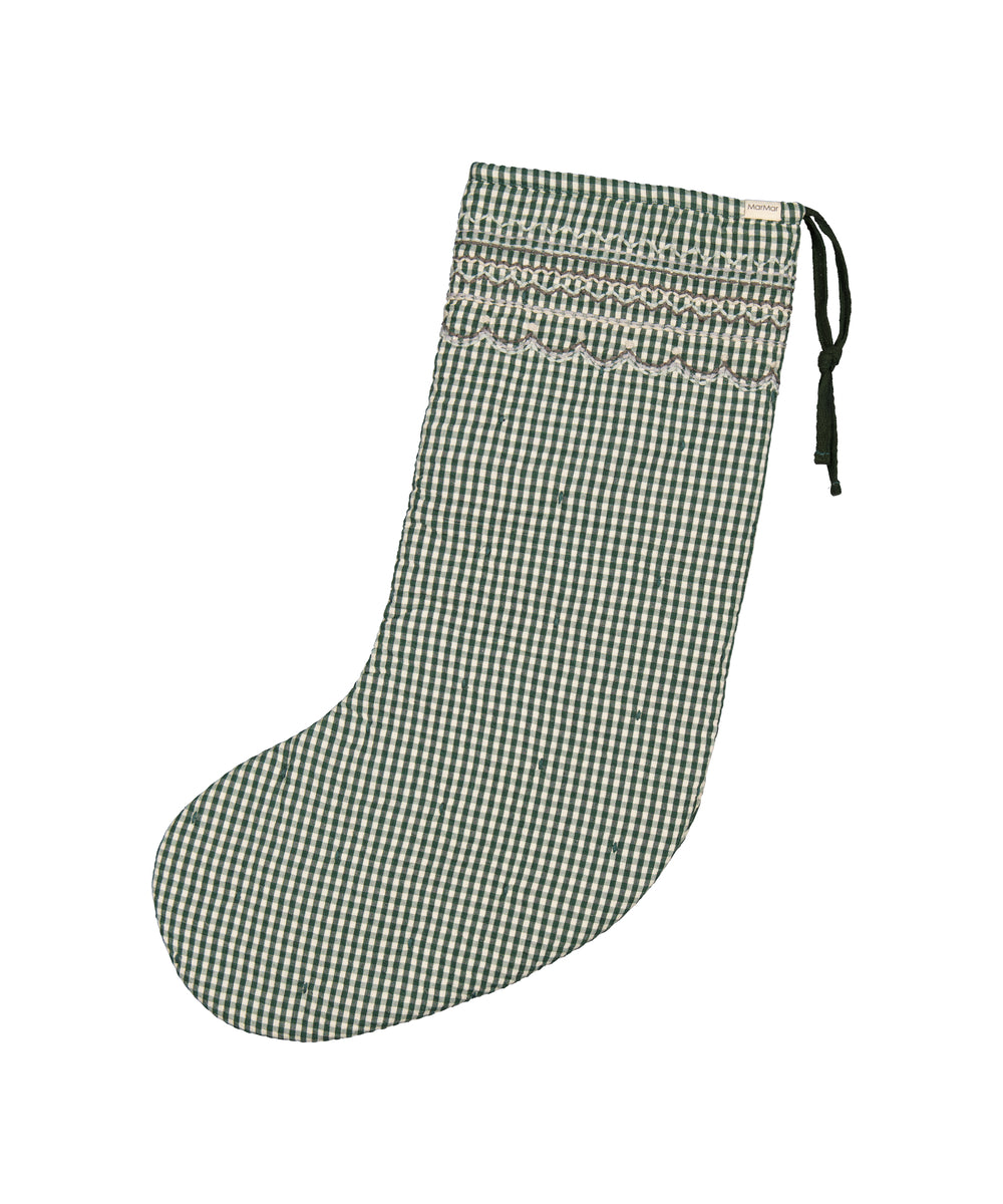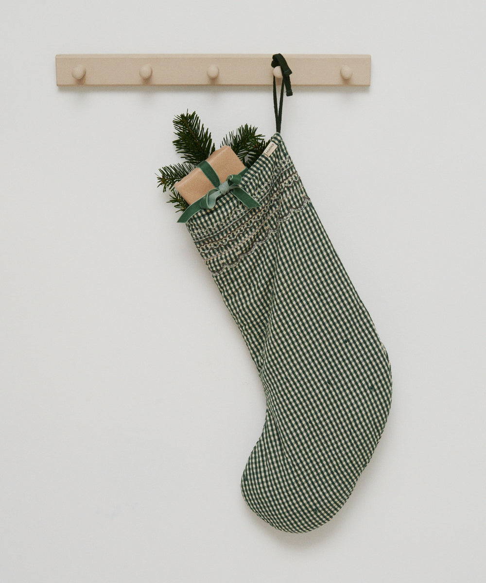 Pige iført ternet julekjole og cremefarvede strømpebukser til børn