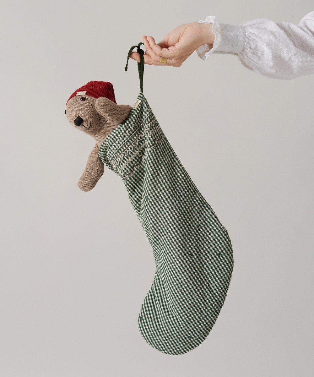 Lille pige iført cremefarvede ribstrikkede strømpebukser og ternet julekjole
