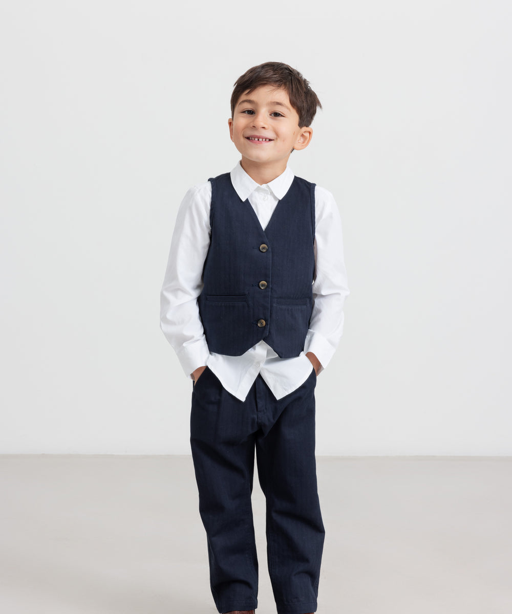 Dreng iført festtøj - mørkeblå bukser, hvid skjorte og vest til børn