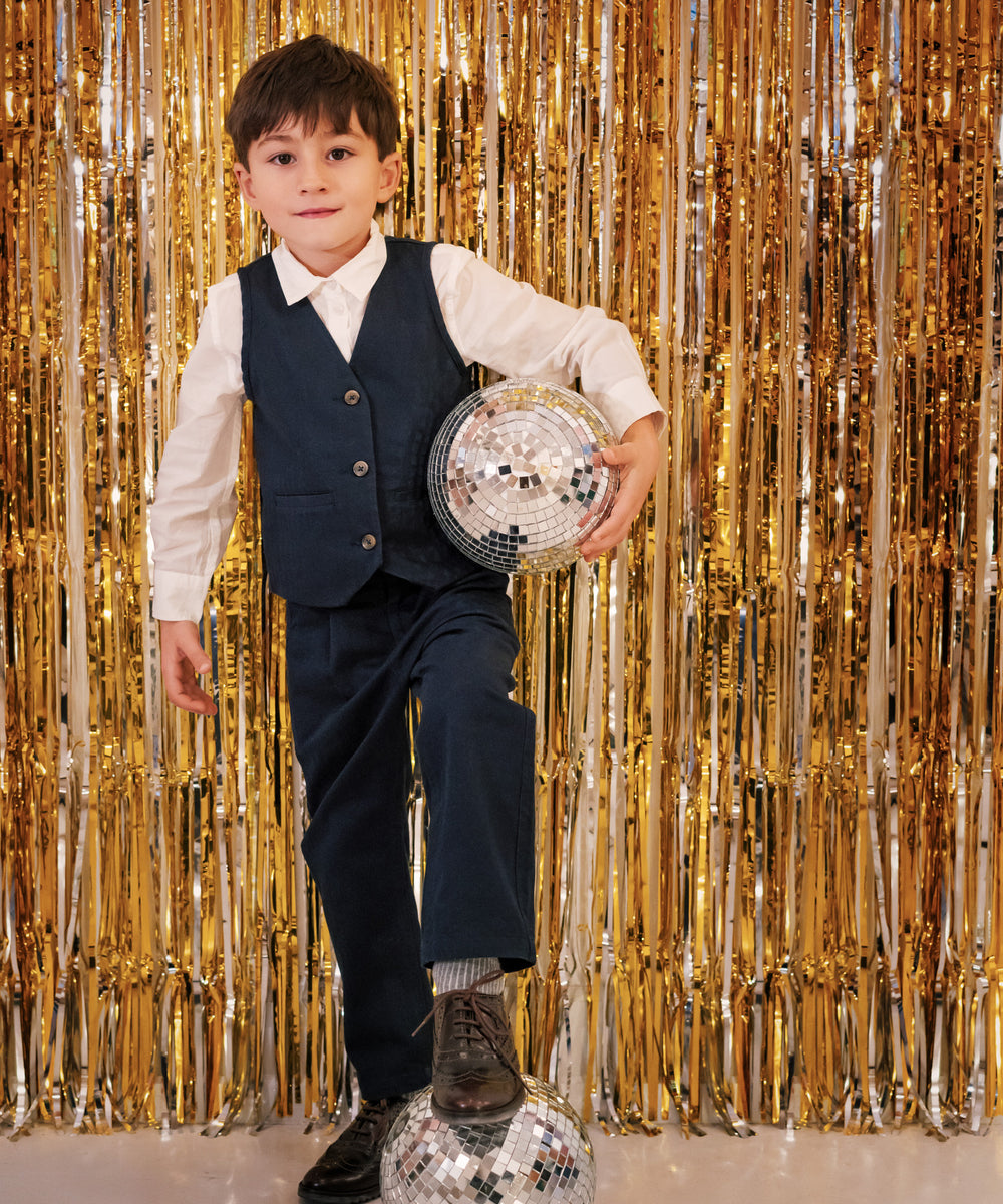Dreng iført festtøj til børn mørkeblå bukser og hvid skjorte står foran gyldent festgardin med discokugle