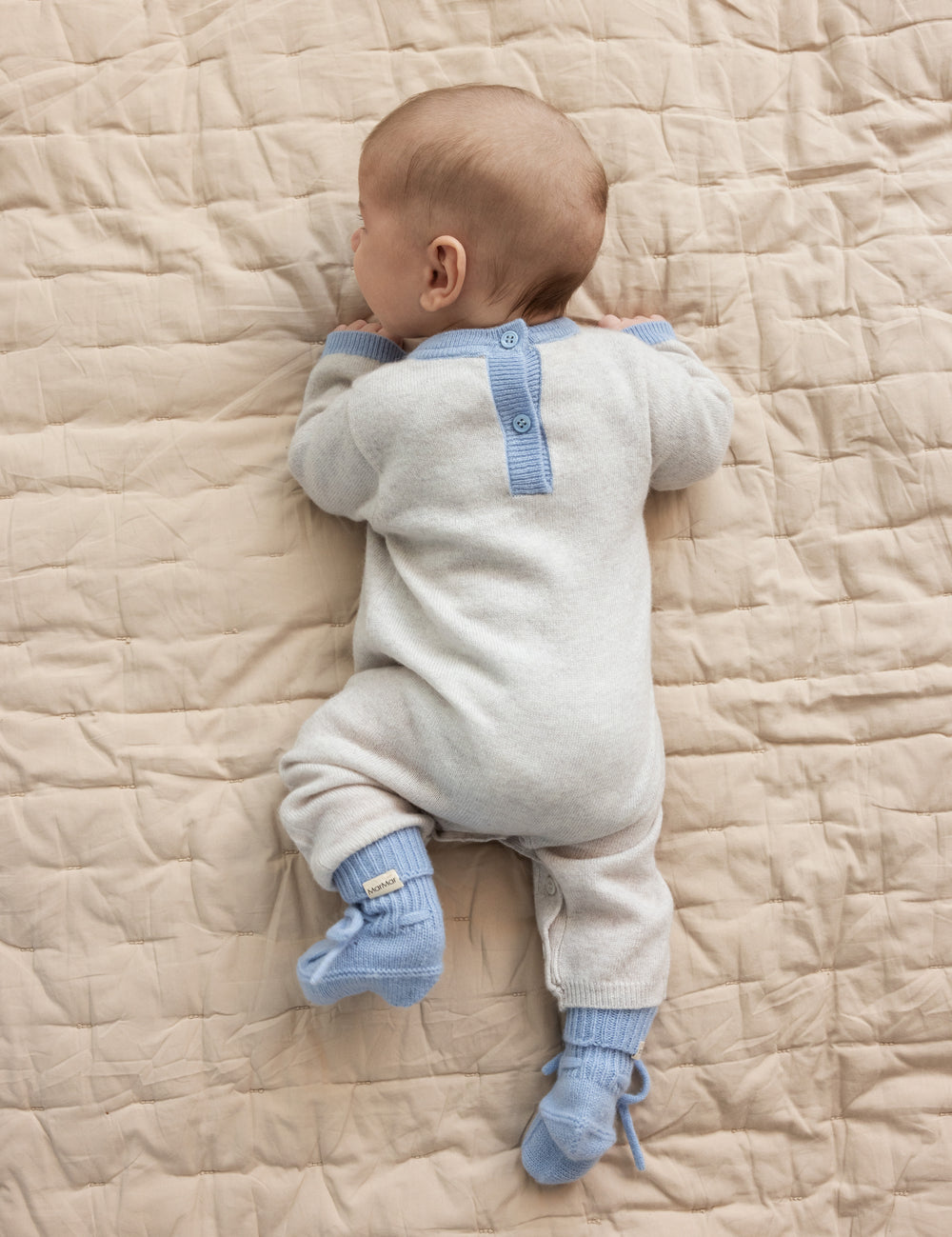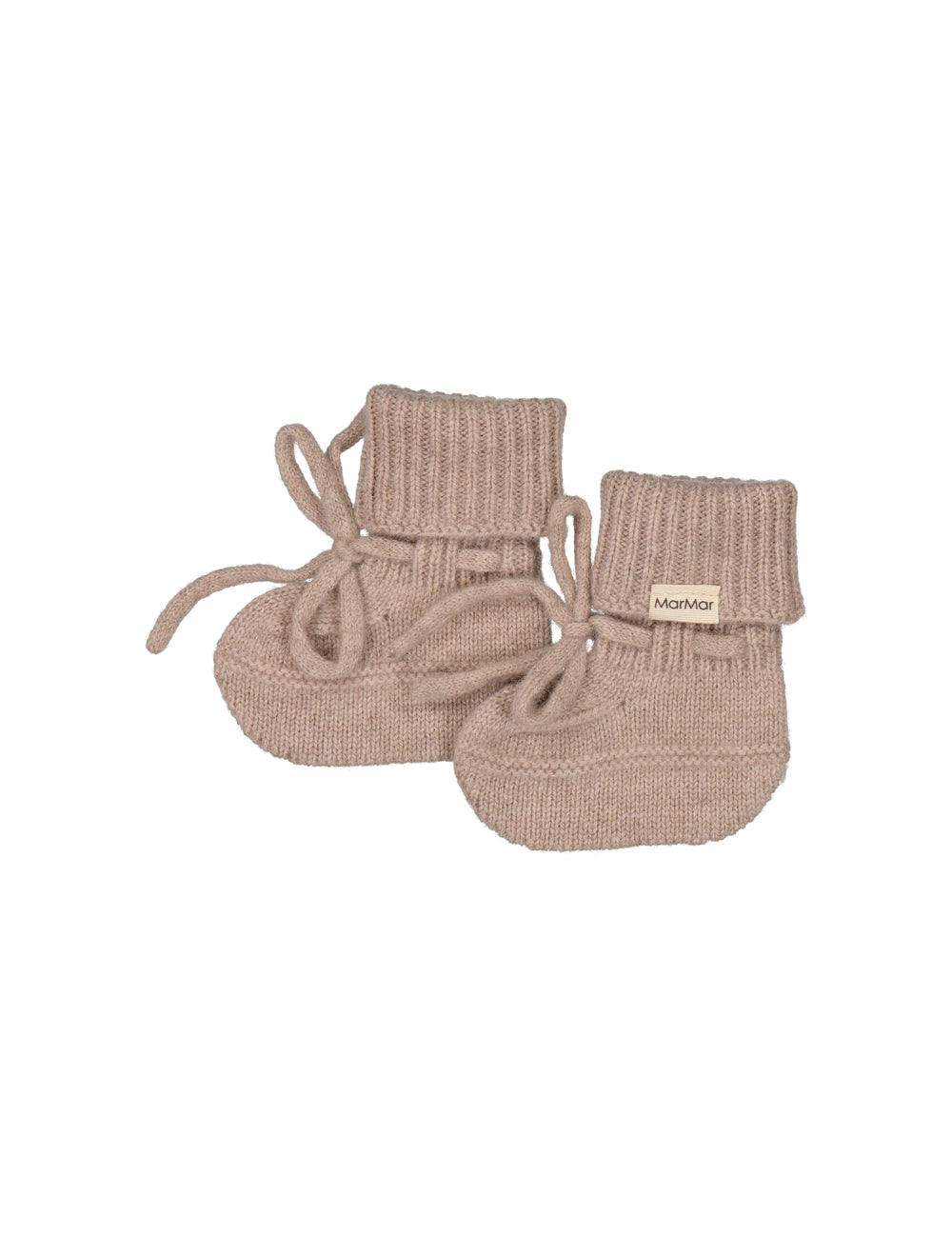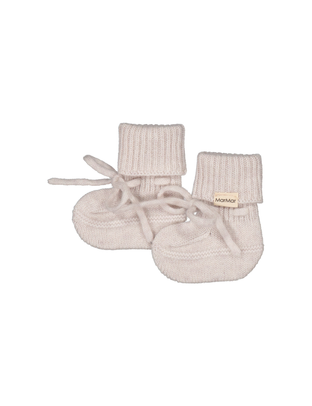 Barn iført uldstrømper i beige med grøn rib, orange hæl og blå tå