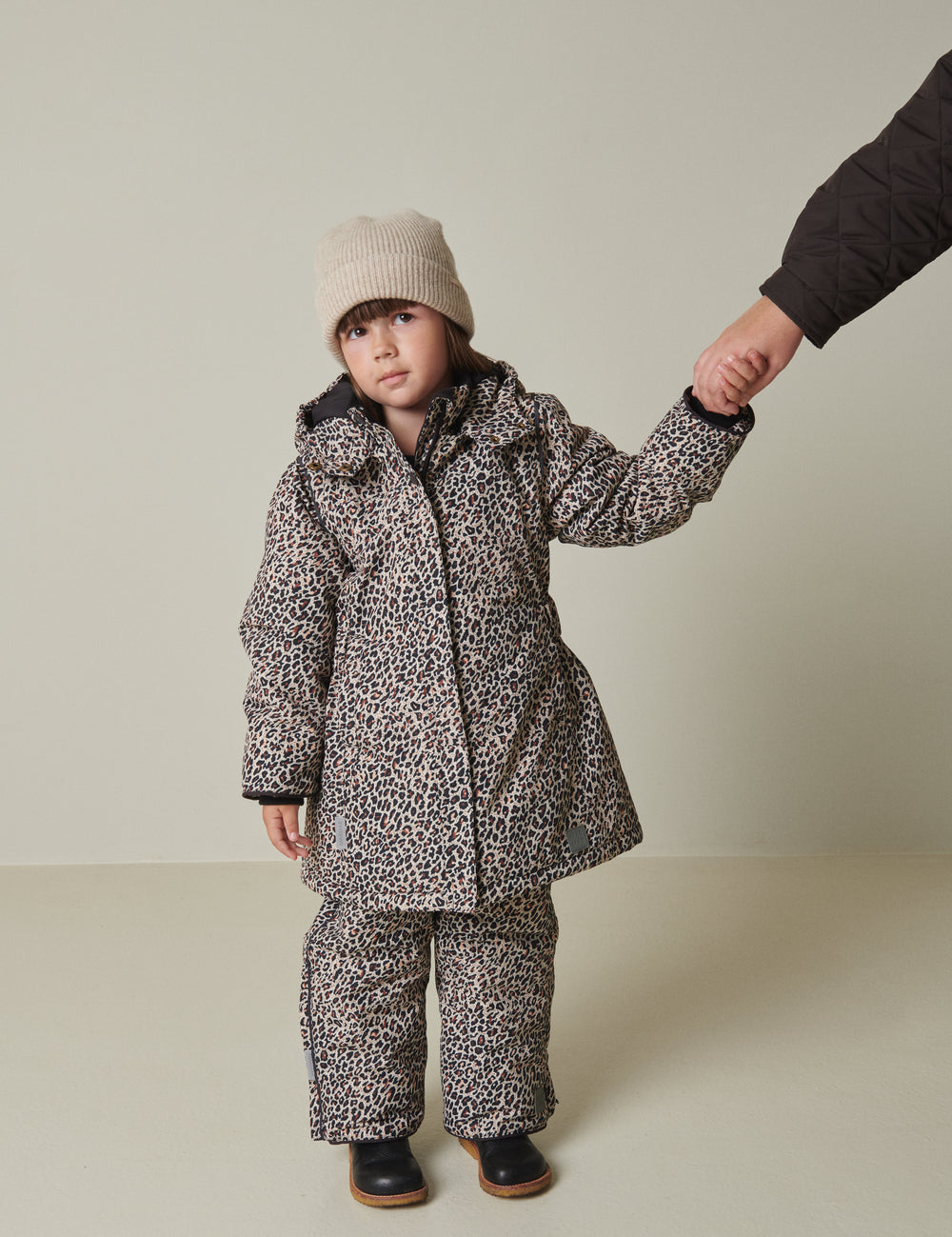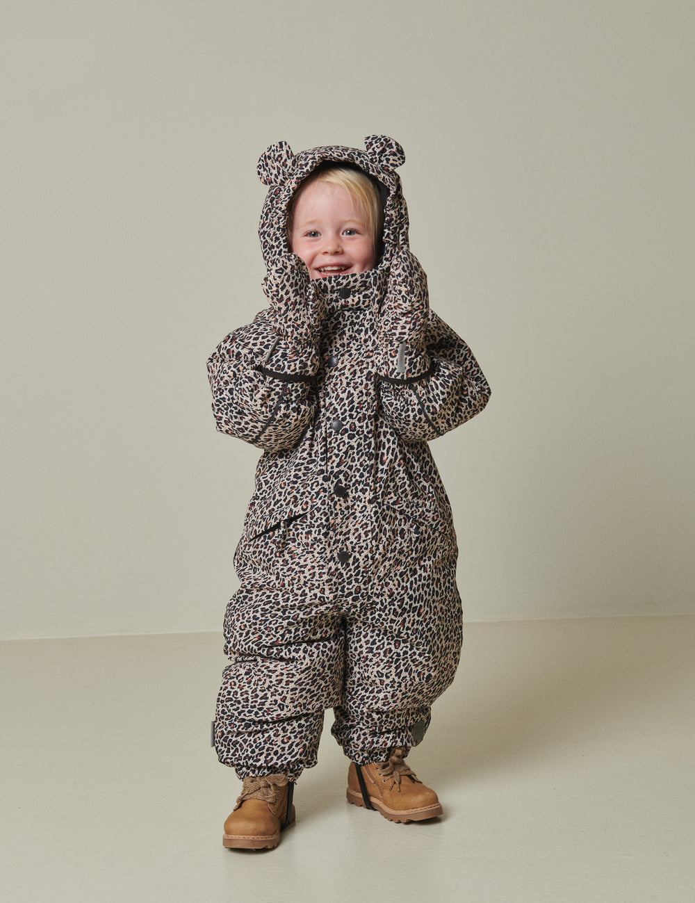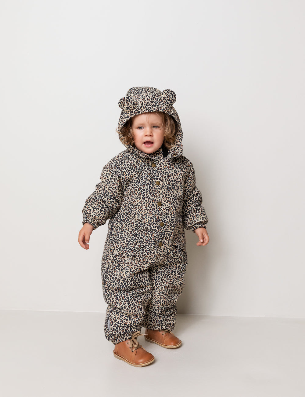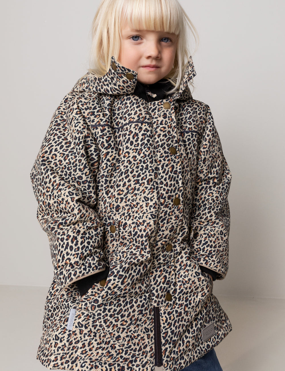 Barn iført leopardmønstret regnfrakke og regnhat.