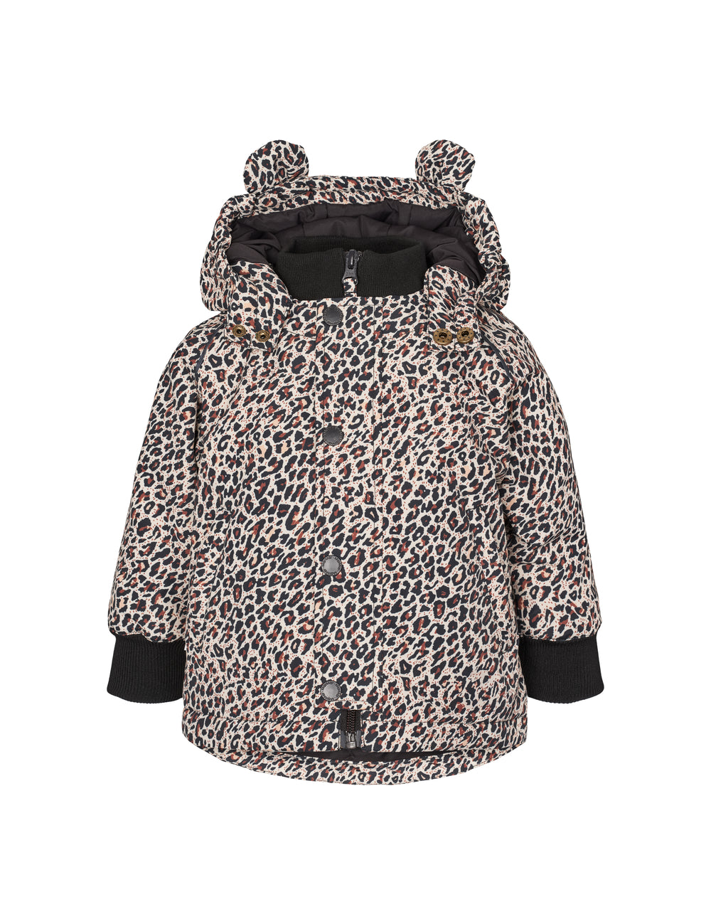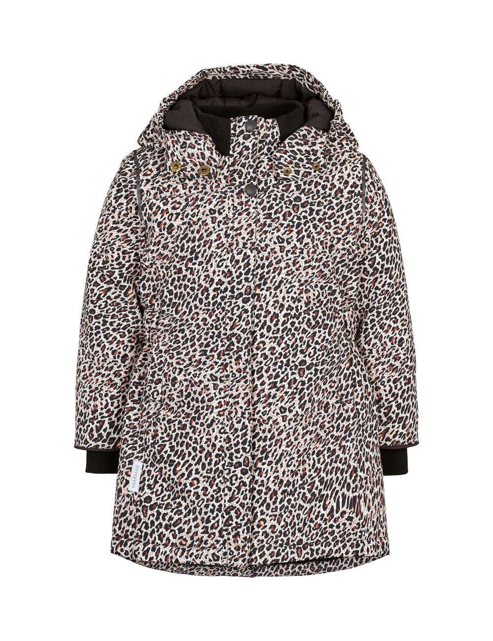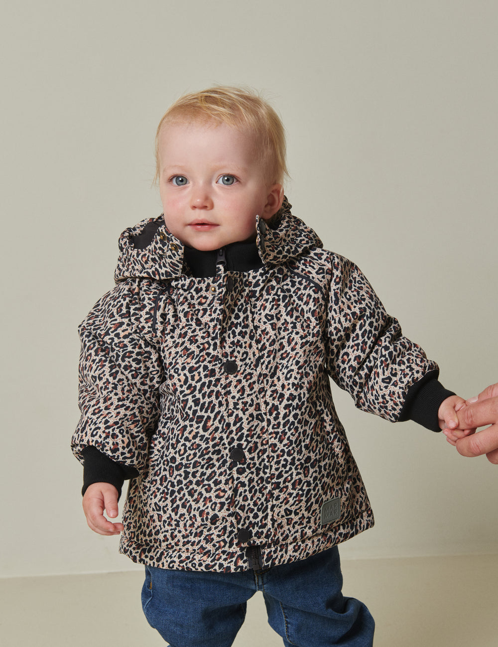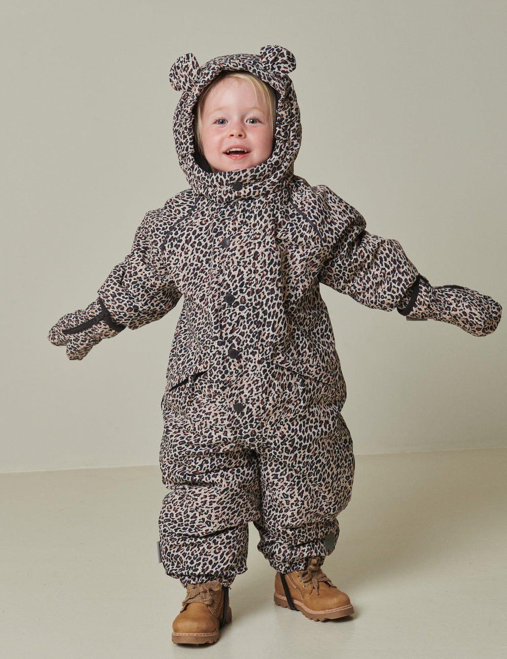 Barn iført leopardmønstret regnfrakke og regnhat.