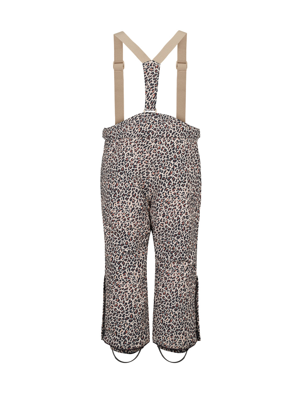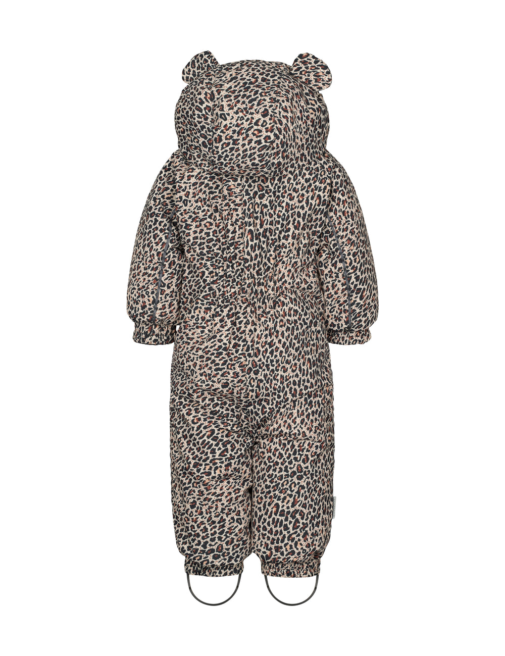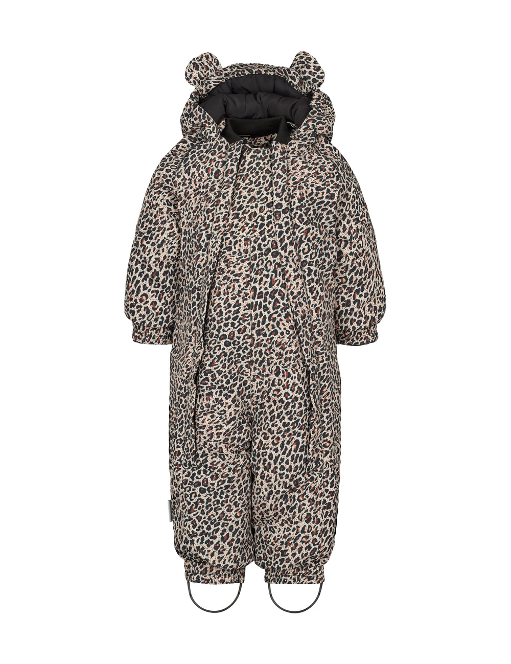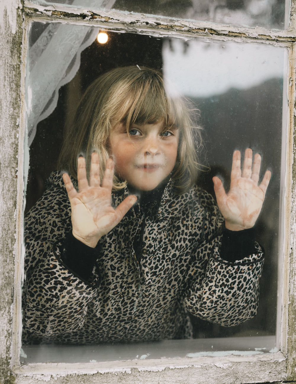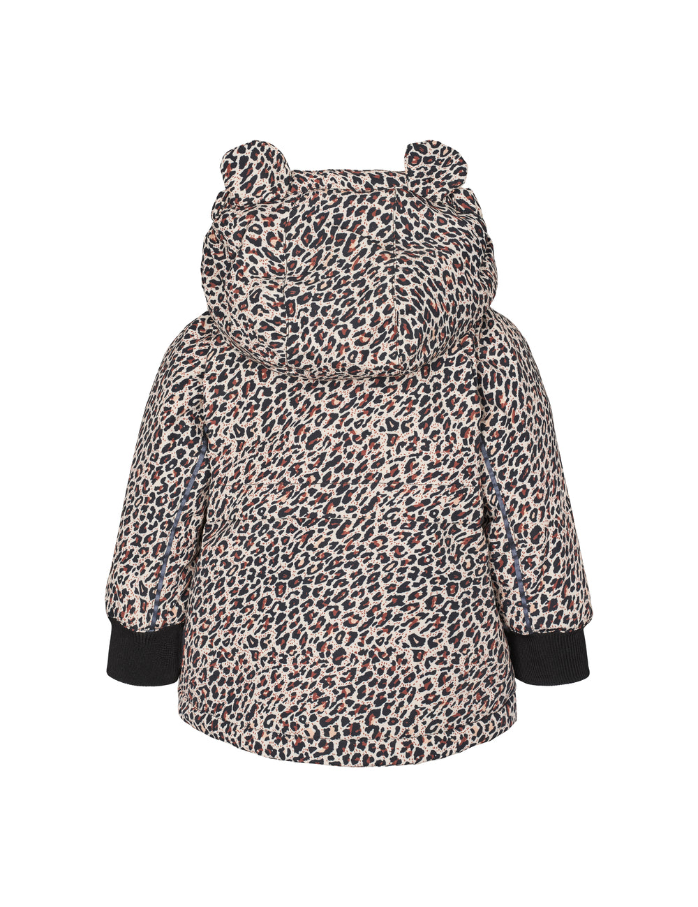 Barn iført leopardmønstret regnfrakke og regnhat.