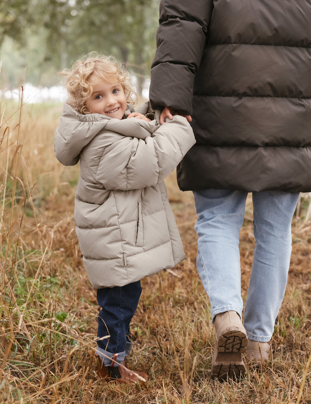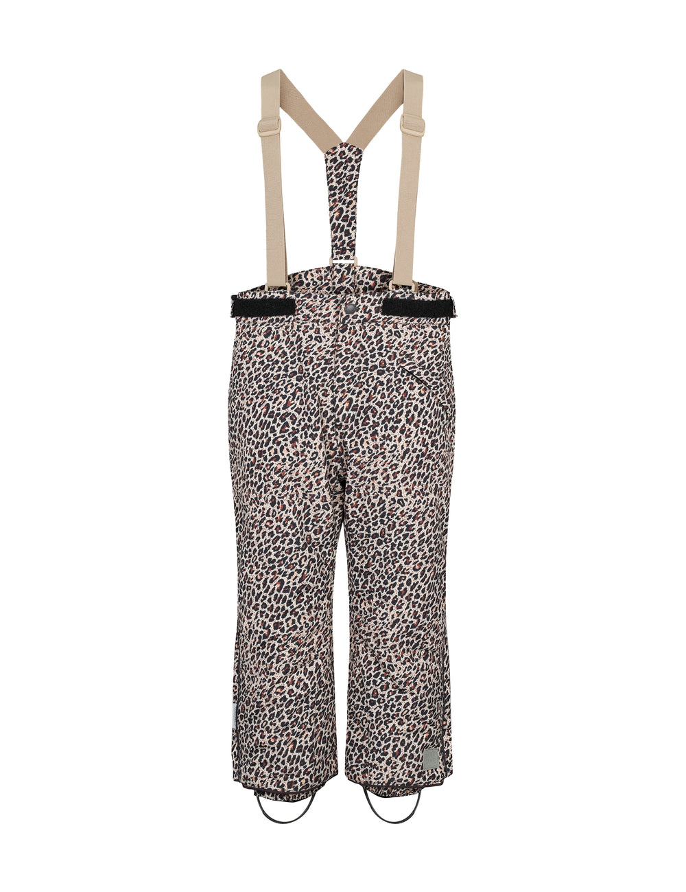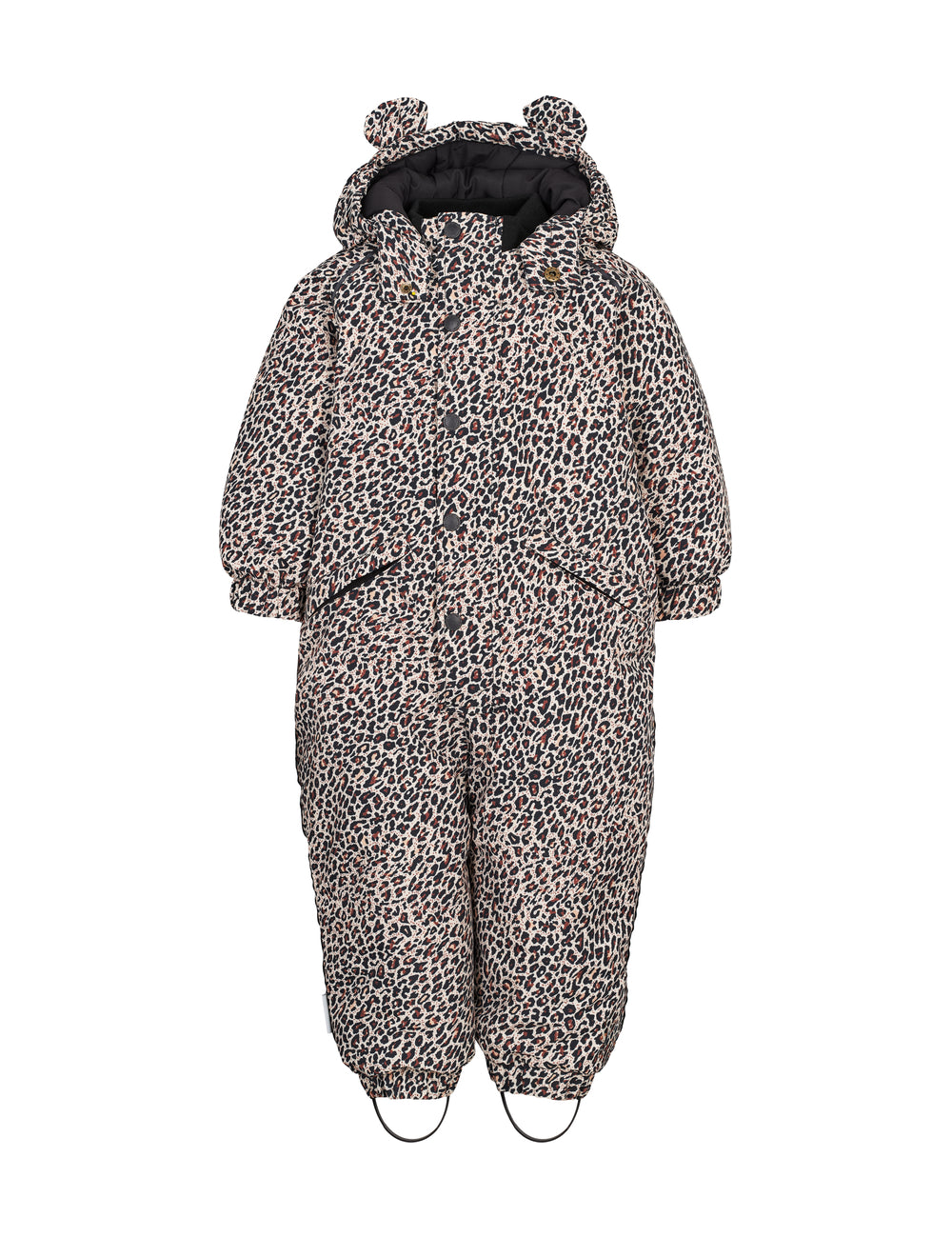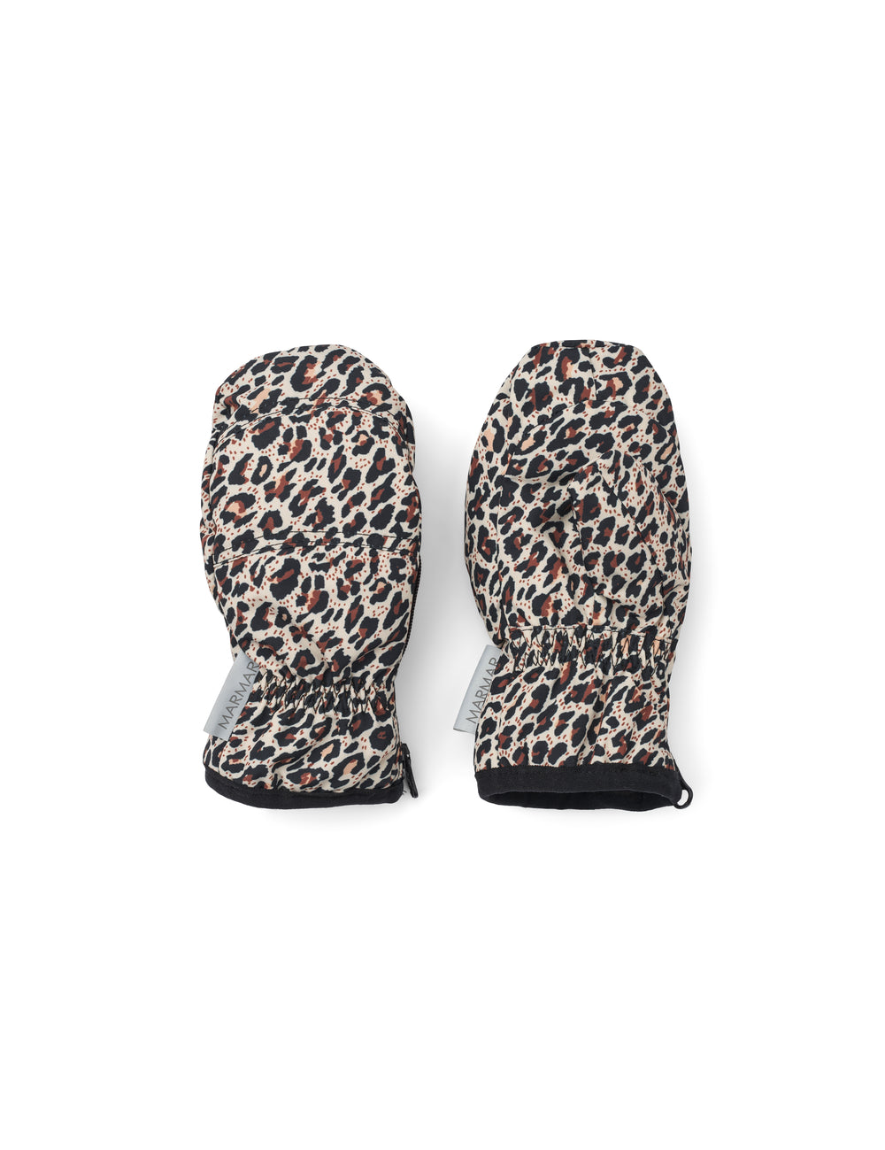Barn iført leopardmønstret regnfrakke og regnhat.