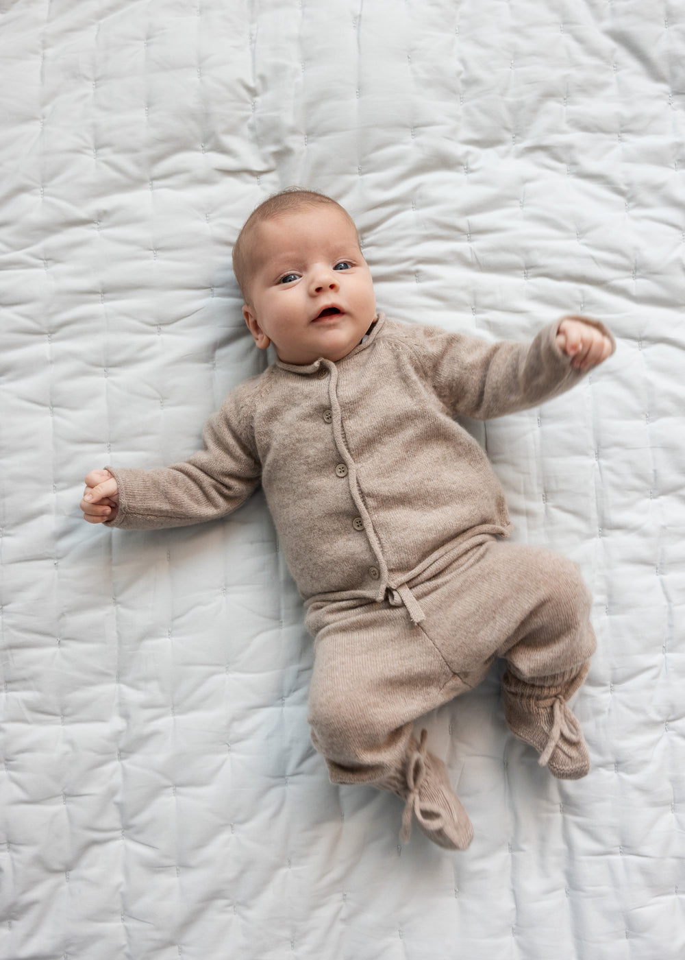 Små, bløde og varme kashmir futter med bindebånd til baby. Kashmir futterne er ultra bløde, varme og behagelige at have på og helt perfekt til de koldere dage.