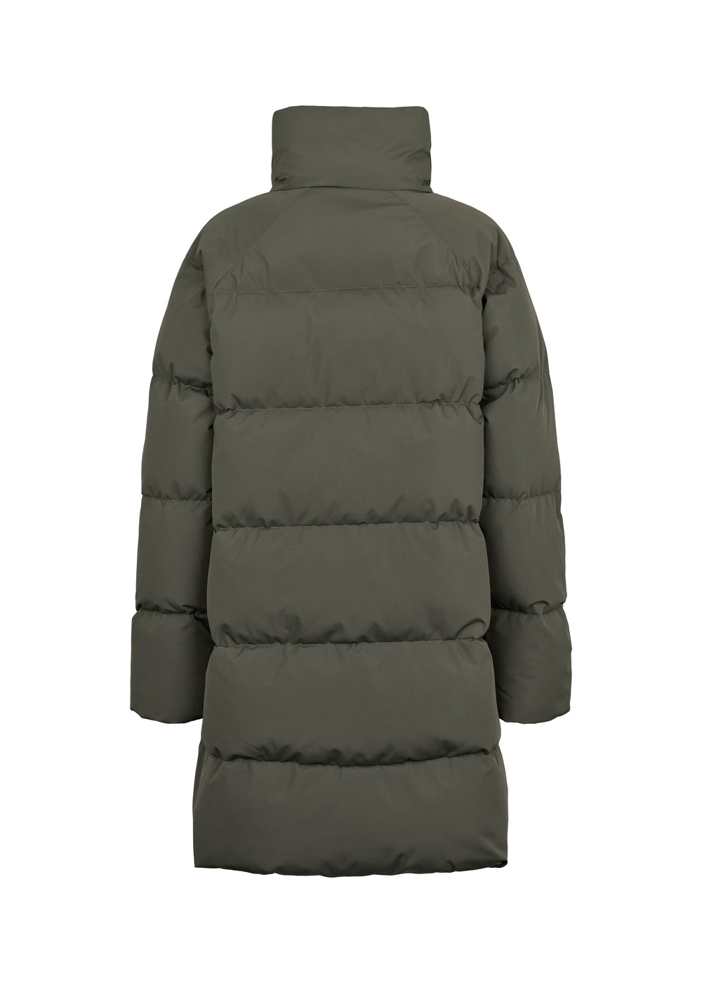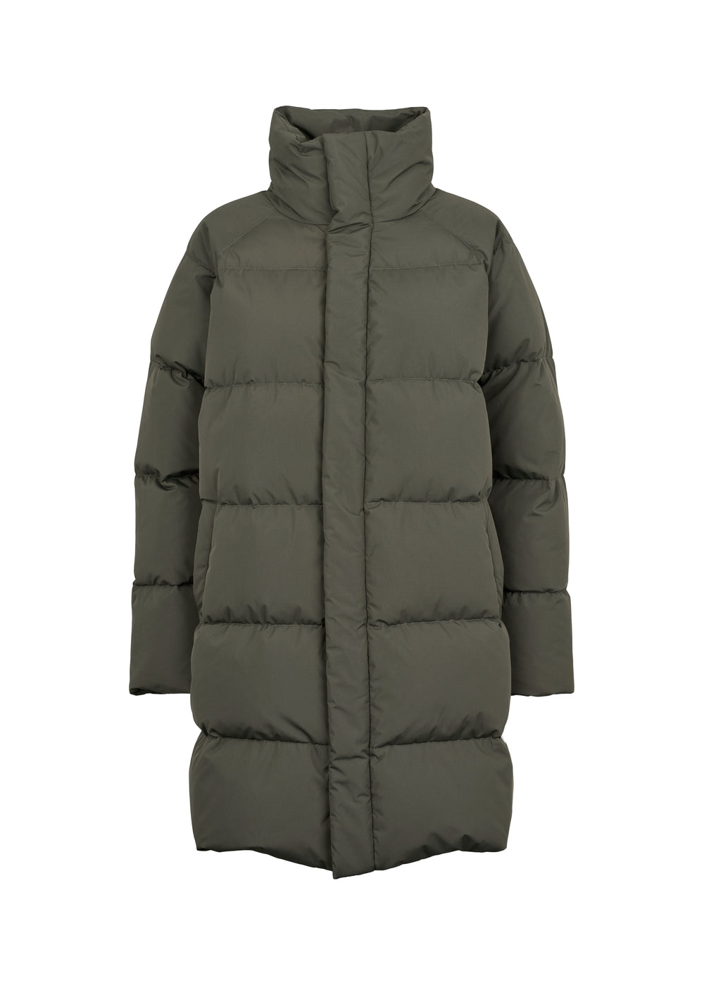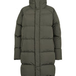 Lang og varm dunfrakke til kvinder. Frakken har to lommer, opstående krave og lukkes med lynlås og trykknapper foran.