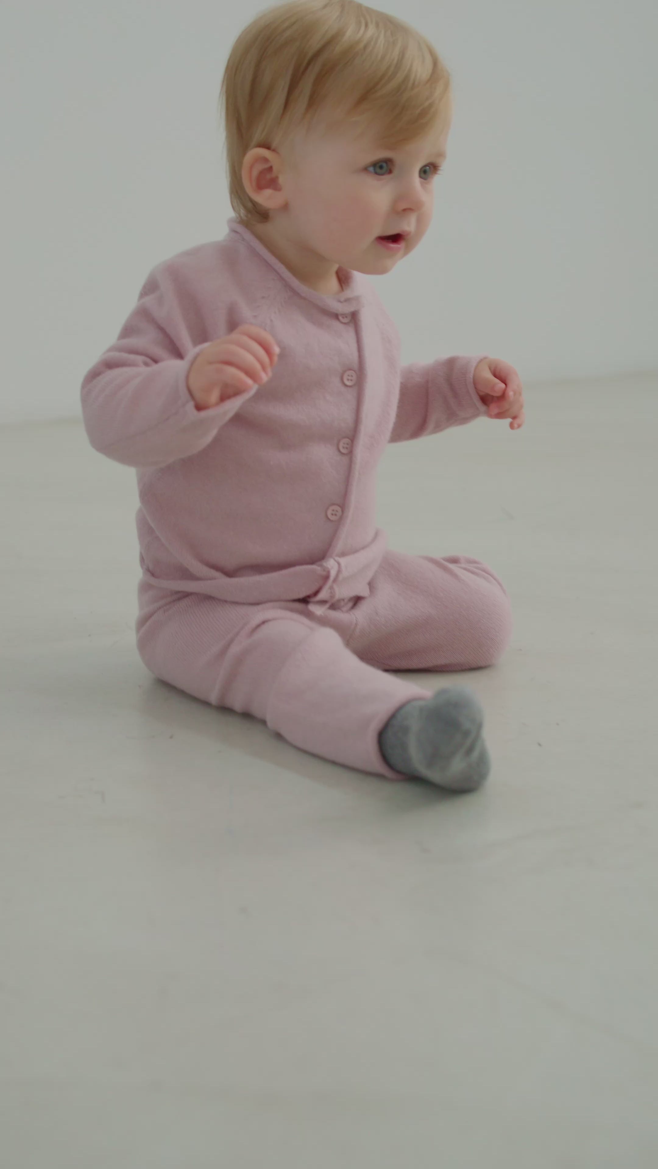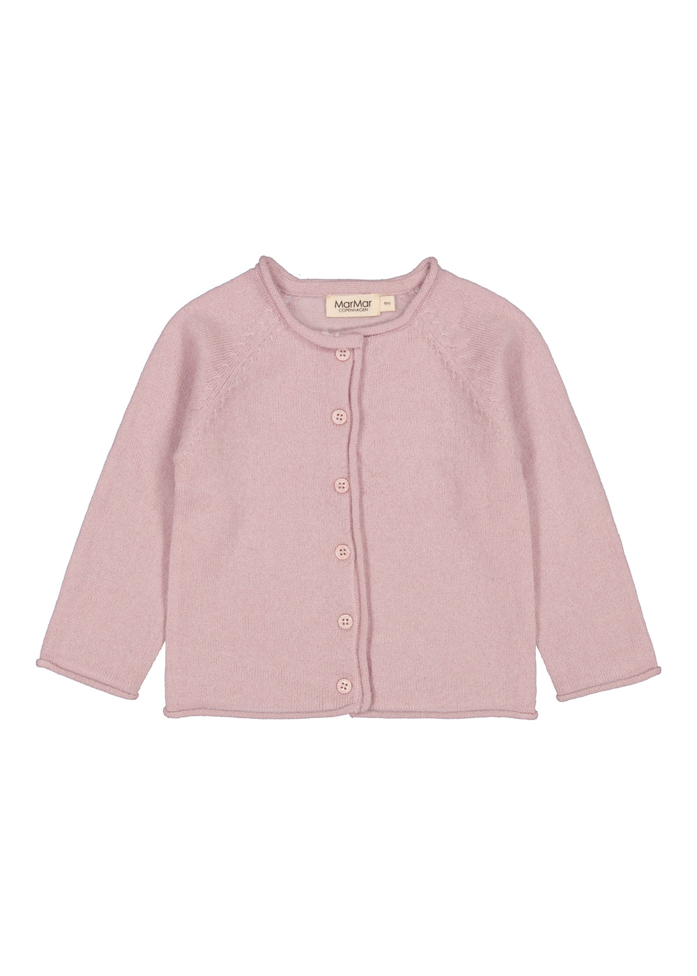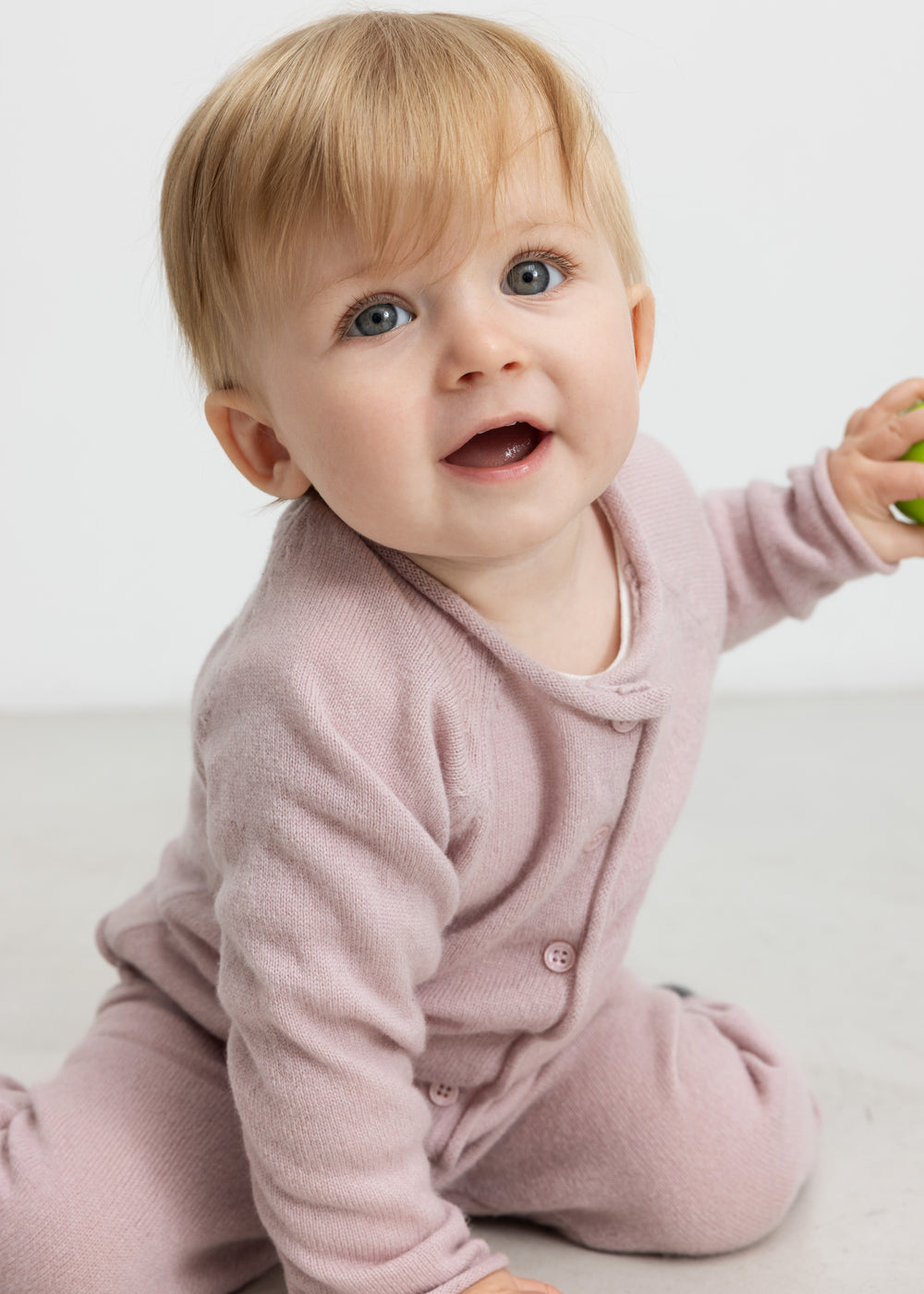 Kashmir cardigan til baby med knaplukning, rullekant og raglanærmer. Kashmir cardiganen er ultra blød, varm og behagelig at have på og helt perfekt til de koldere dage.