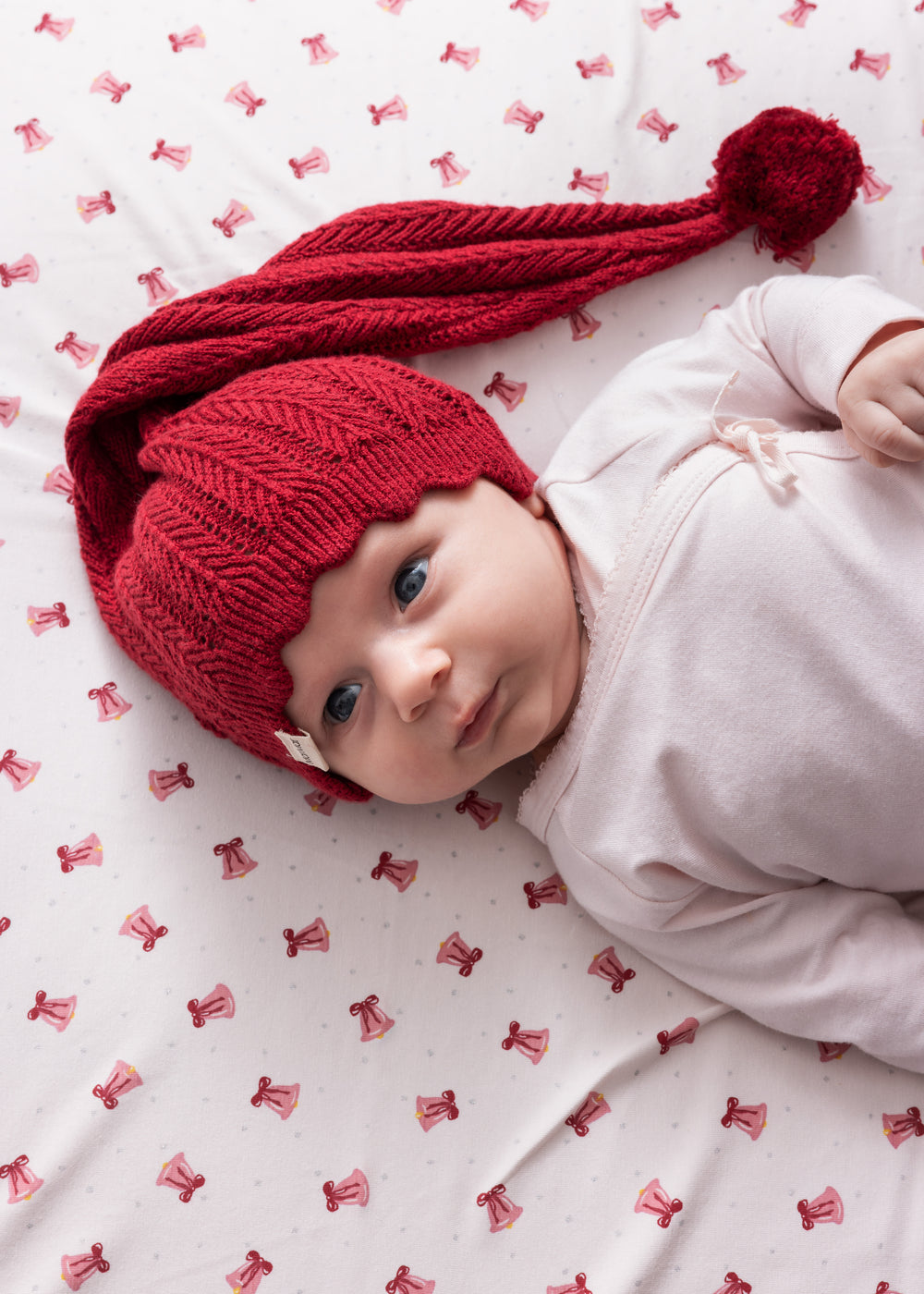 Baby iført rød strikket nissehue med kvast og lyserødt juletøj