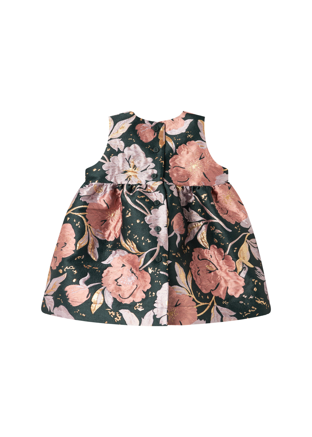 Baby iført mørkegrøn ærmeløs festkjole med blomsterprint og rosa bluse