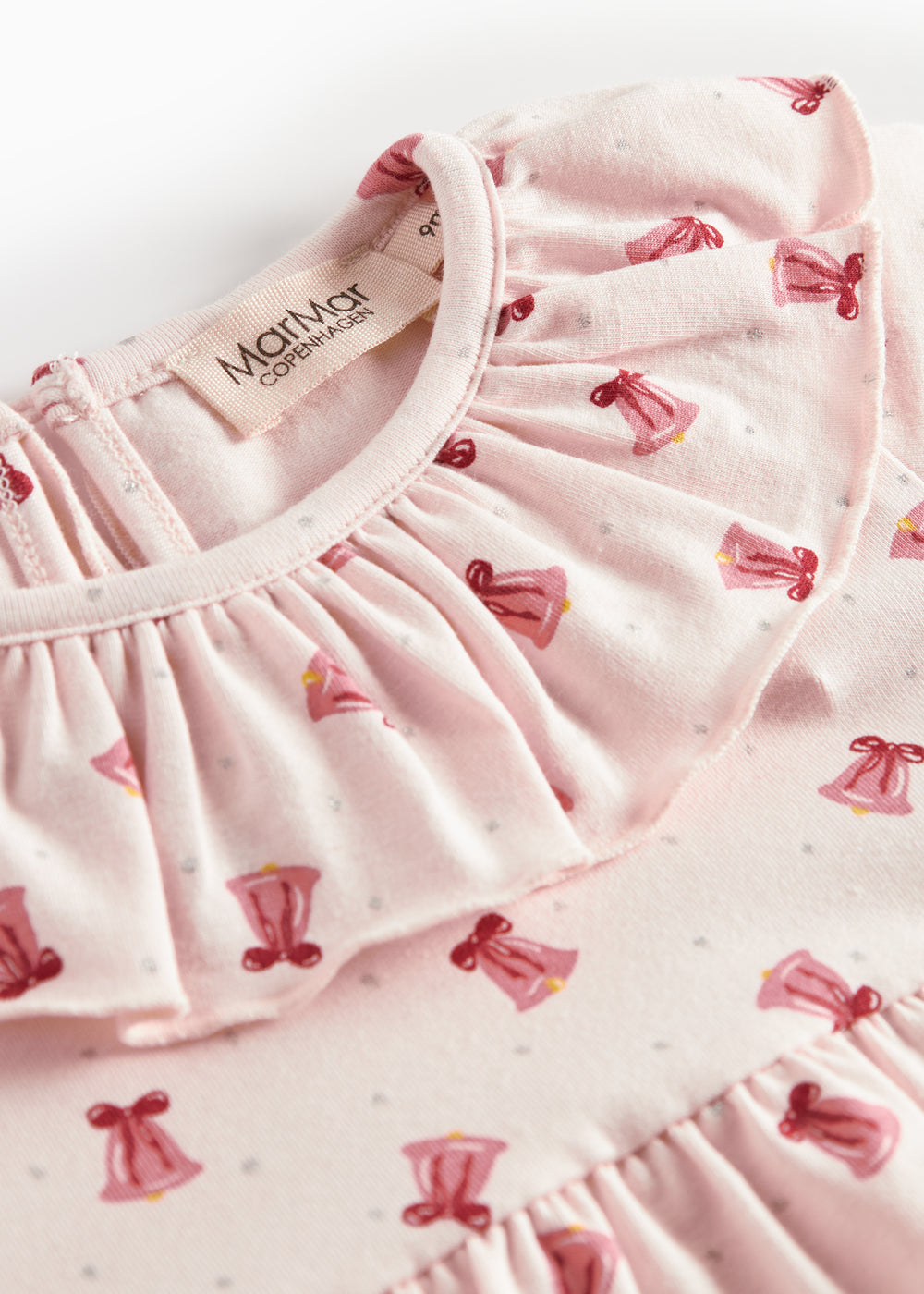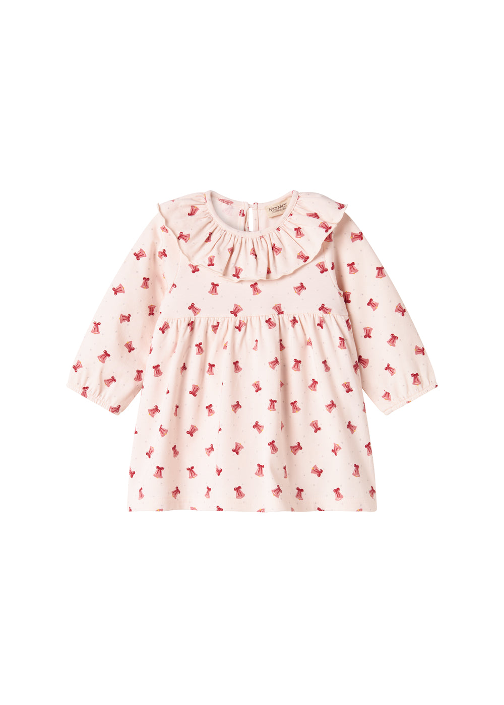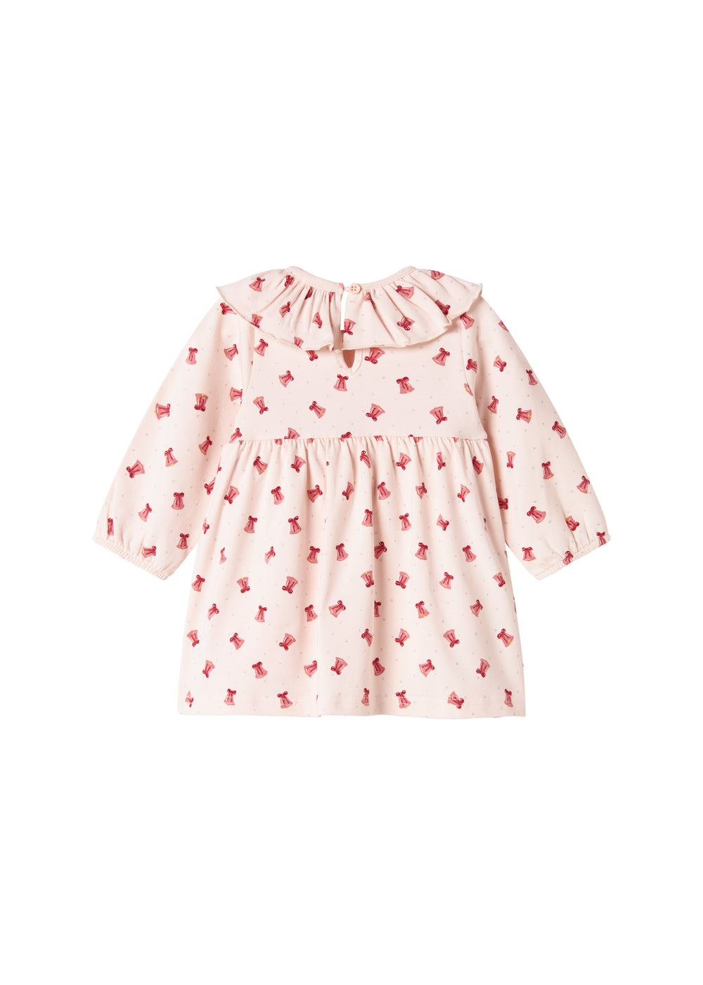 Langærmet baby kjole med fin krave og bodystocking med trykknaplukning indvendig. Kjolen har et fint print og picotkanter samt er både blød, strækbar og behagelig at have på.