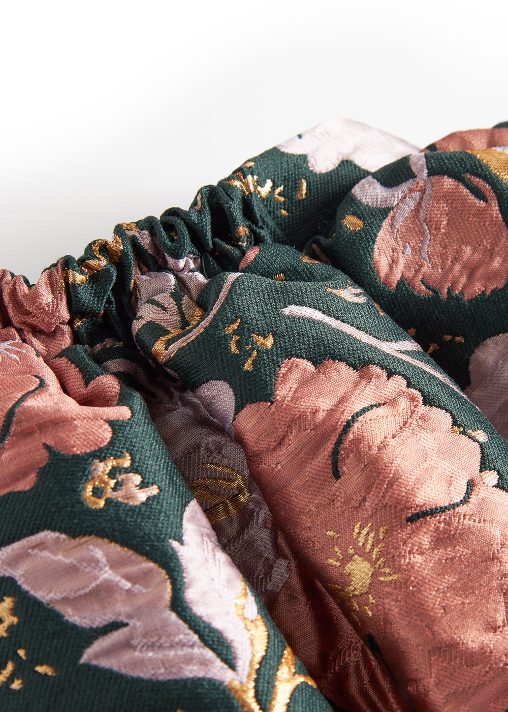 Nederdel med masser af volumen i en eksklusiv jacquard-vævet kvalitet med en elegant tekstur og et delikat blomstermønster. Nederdelen har elastik i taljen og lukkes med lynlås i siden. Perfekt til både festlige lejligheder og særlige øjeblikke. Nederdelens længde går til over knæet.