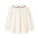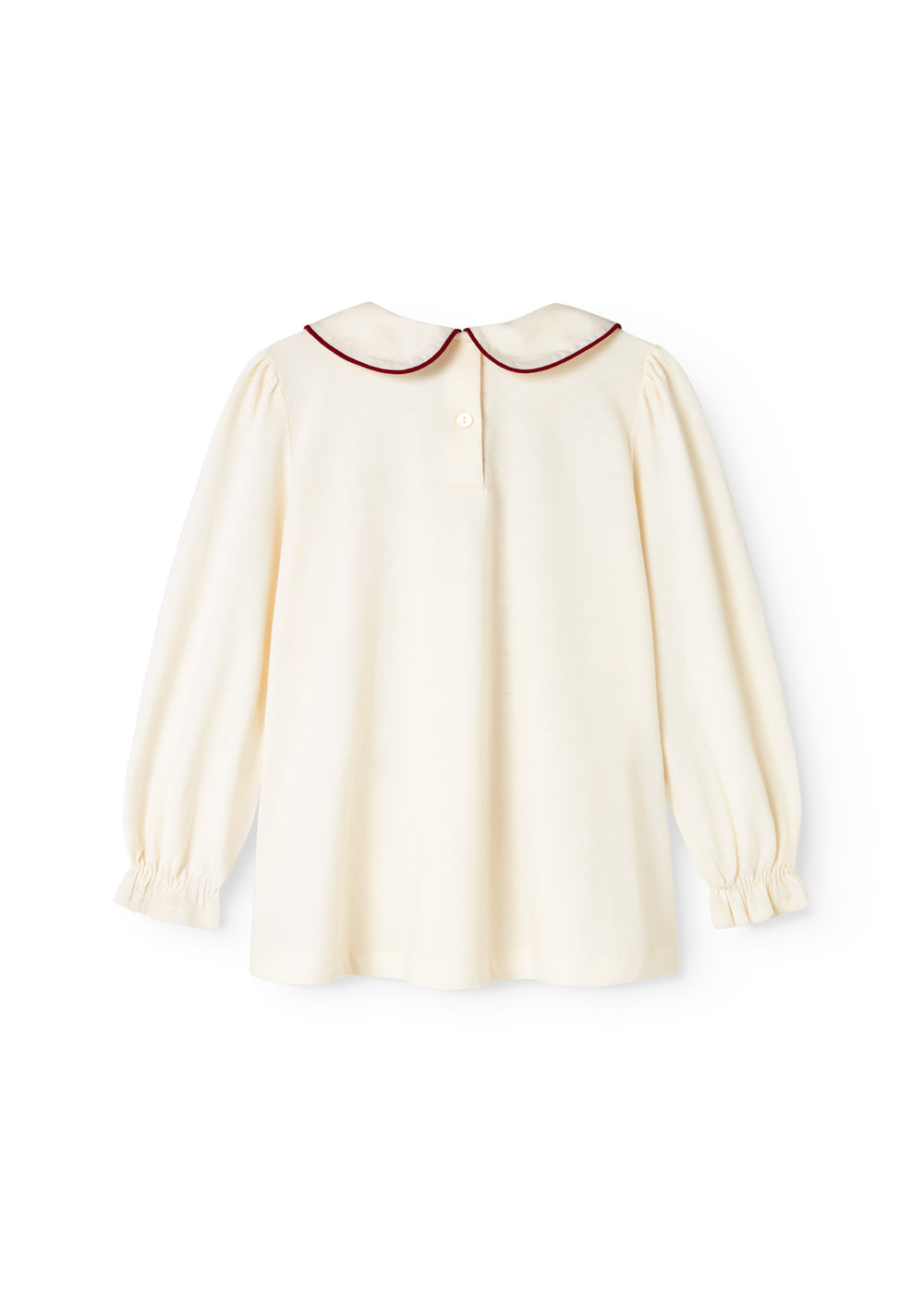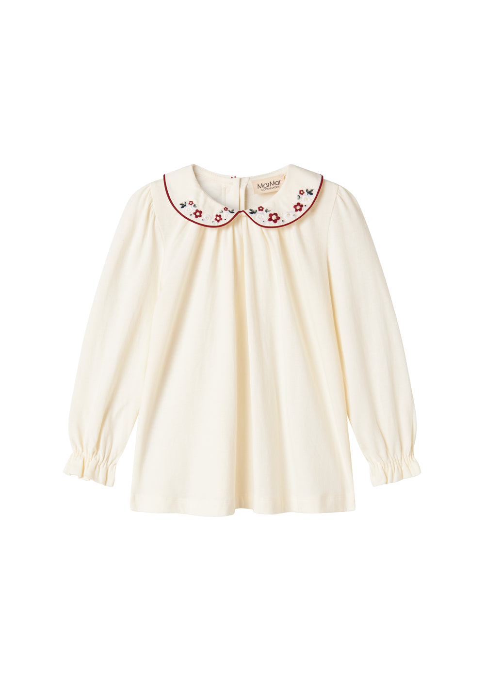 T-shirt med lange ærmer og en fin krave med detaljer blomster broderi. Blusen lukkes med knapper bagpå. T-shirten er både blød, strækbar og behagelig at have på.