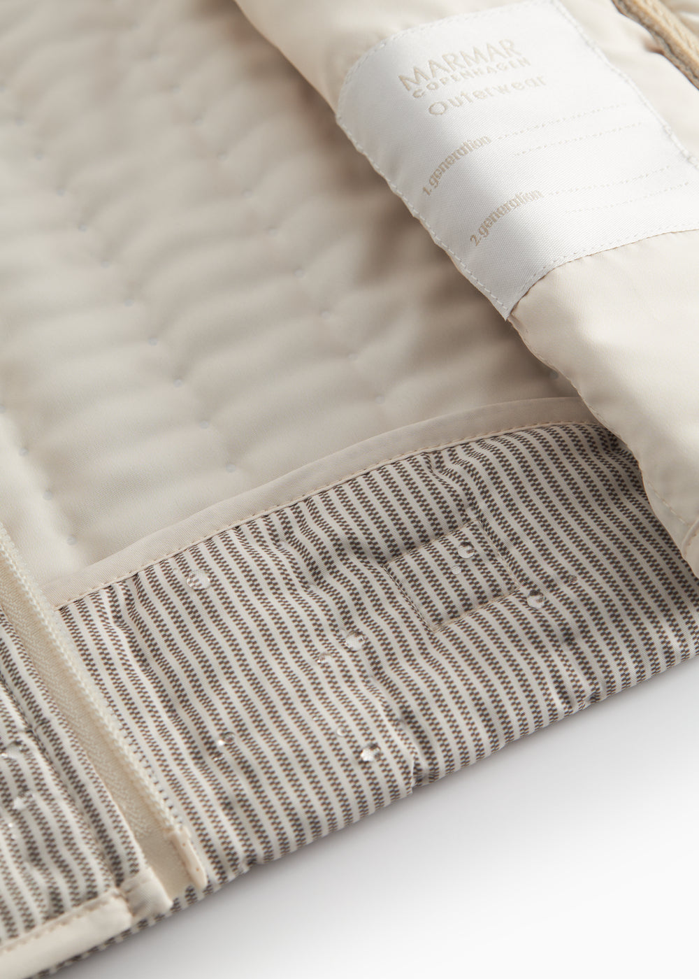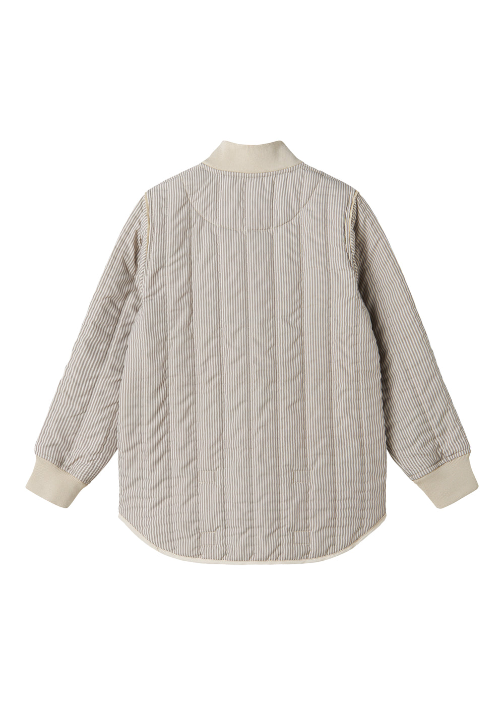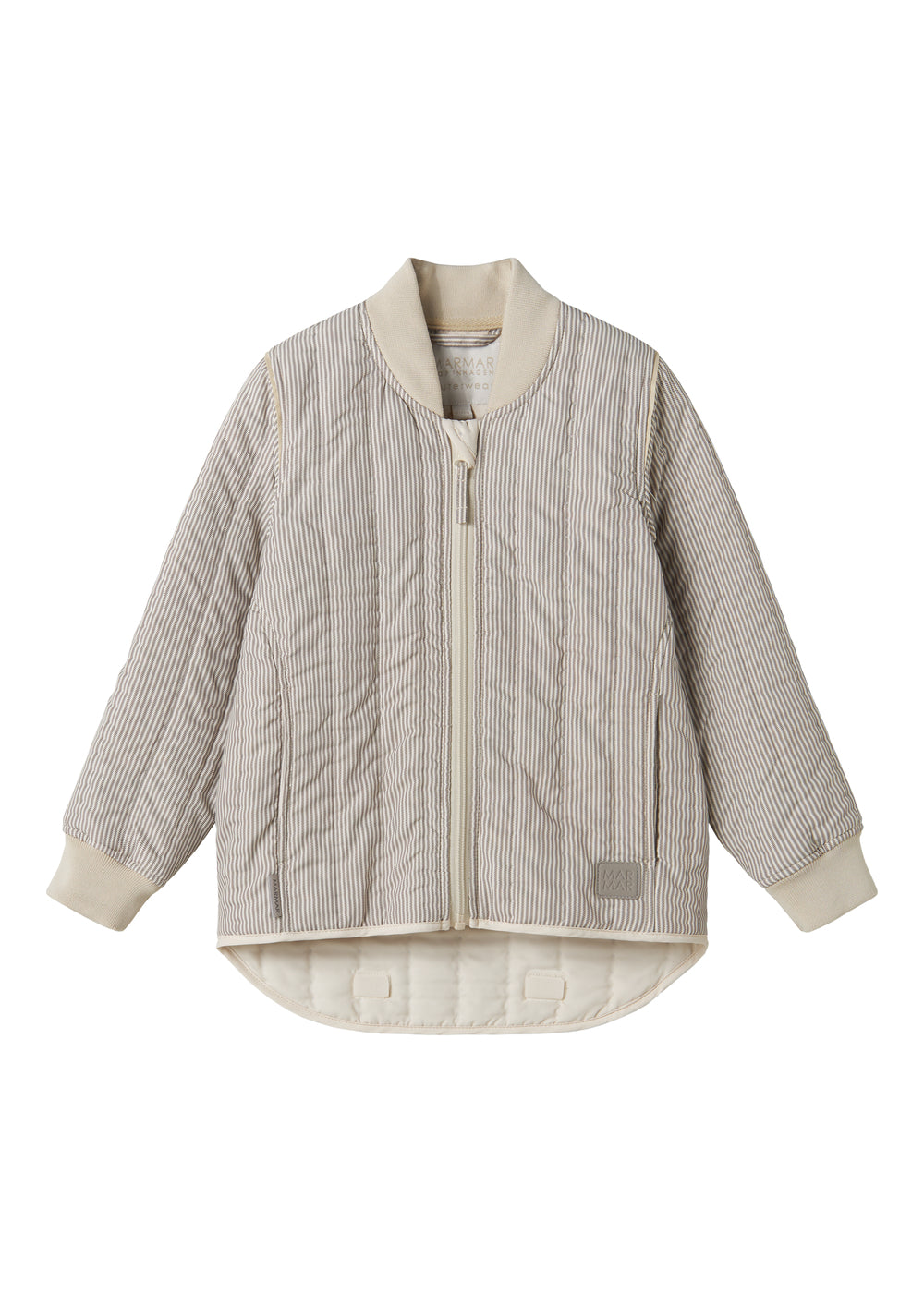 Termojakke til børn med smal pasform og med lommer i siden. Termojakken har et fint stribet print og kan ved hjælp af små velcro detaljer bukkes op bagpå, hvis man ikke ønsker at den er længere her. Termojakken lukkes med lynlås foran og fungerer perfekt som lun og praktisk overgangstøj.