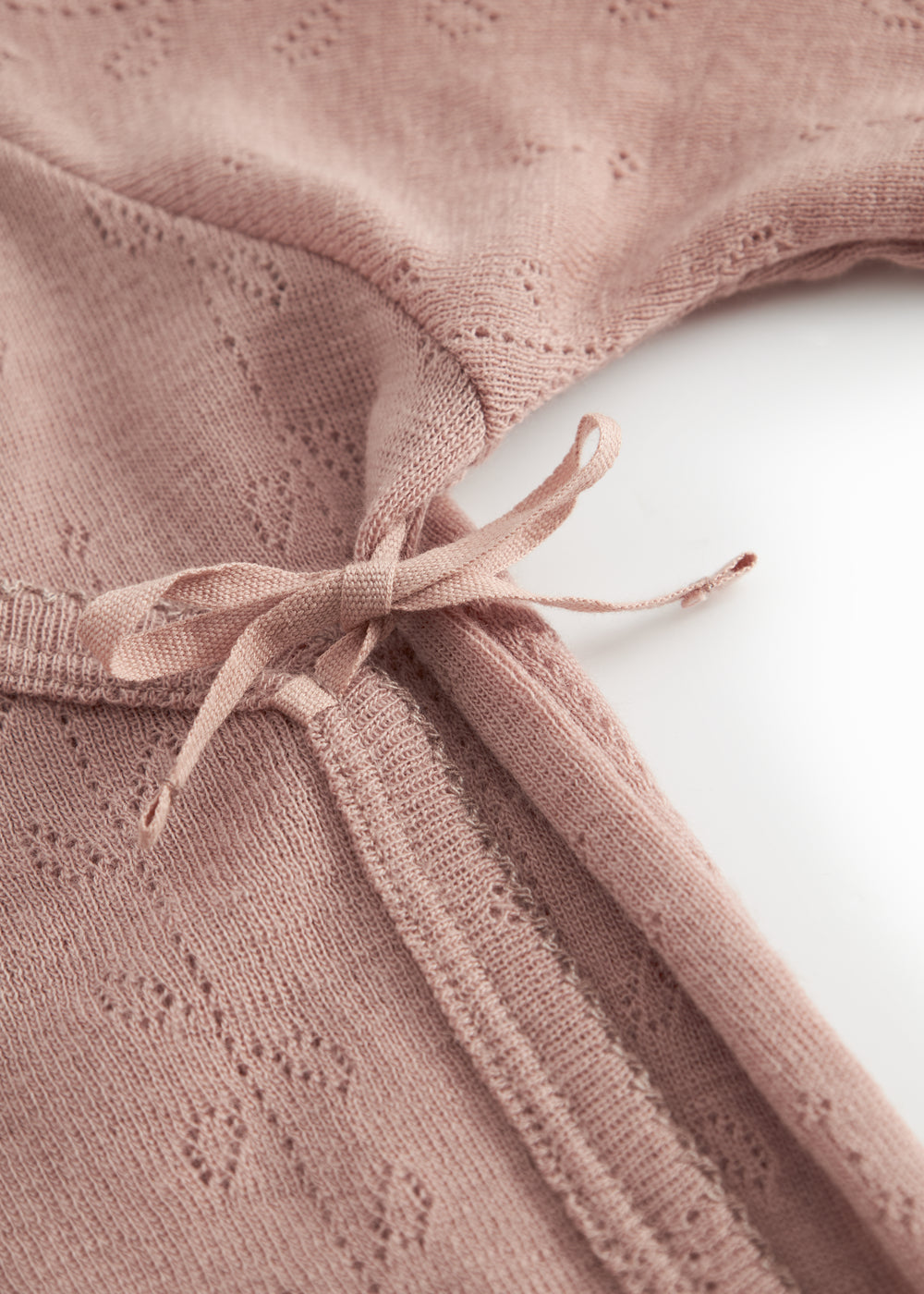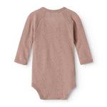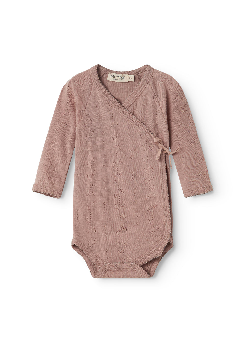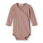 Langærmet bodystocking til nyfødte med slå-om-lukning. Lukkes med trykknapper og bindebånd.