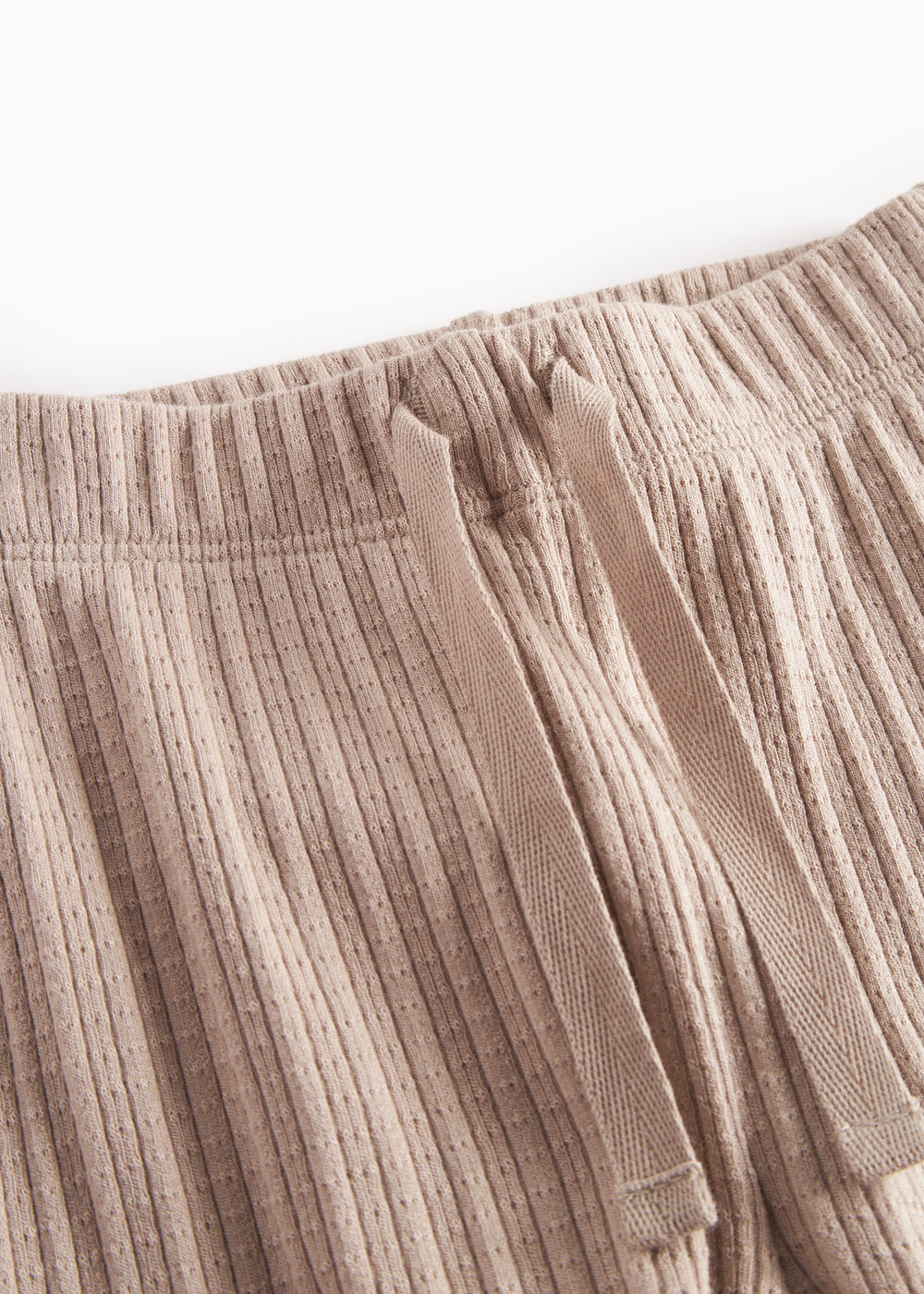 Behagelige baby pointelle bukser med elastik og et pyntebånd i livet. Bukserne er både bløde, strækbare og behagelige at have på.