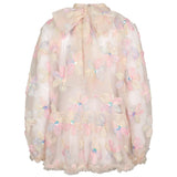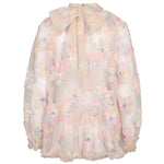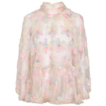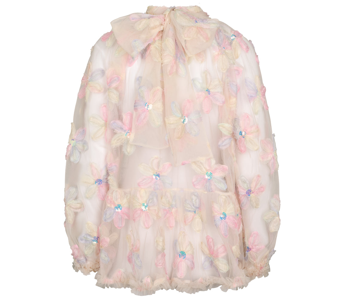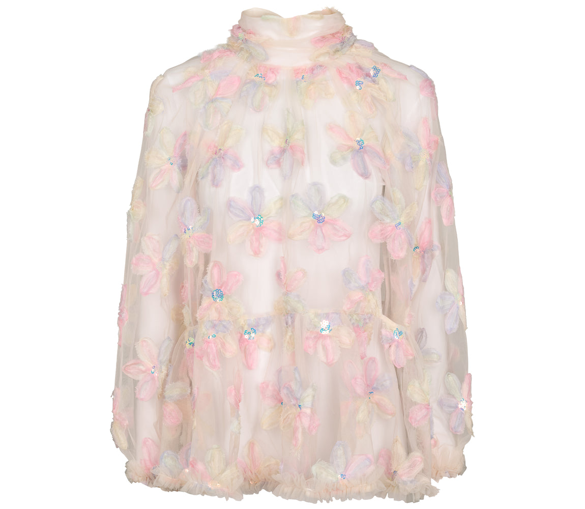 Bluse til kvinder i et let og gennemsigtigt tyl materiale, dekoreret med store blomsterapplikationer i smukke pastelnuancer. Hver blomst er udsmykket med en skinnende paillet i midten, som giver blusen et elegant og festligt udtryk. Blusen har en høj hals med en let rynket kant, som tilfører en sofistikeret stil. Den løse pasform skaber en let og luftig effekt, mens kanten forneden afsluttes med en fin tyl flæsekant for ekstra elegance. Ærmerne er lange og gennemsigtige, hvilket bidrager til det feminine og romantiske design. Blusen er perfekt til særlige lejligheder eller festlige begivenheder og kan nemt styles med en nederdel eller bukser for at fuldende looket