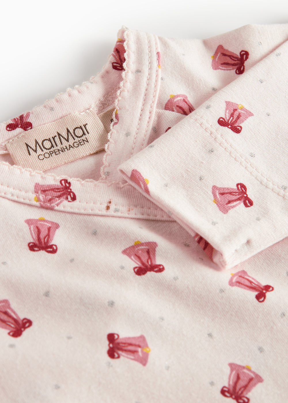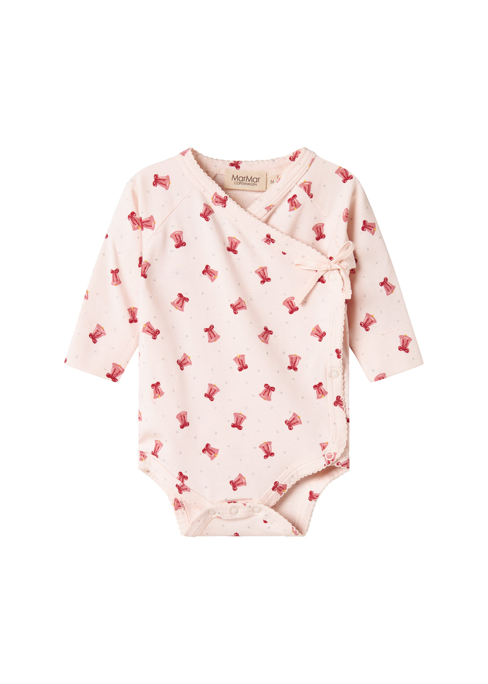 Langærmet bodystocking til nyfødte med slå-om-lukning. Bodystockingen lukkes med trykknapper og bindebånd, har et fint print samt picotkanter, og er både blødt, strækbart og behageligt at have på.