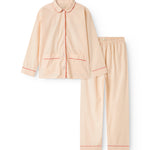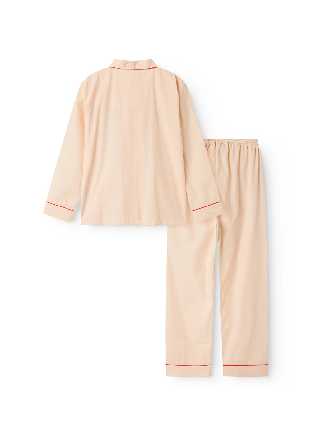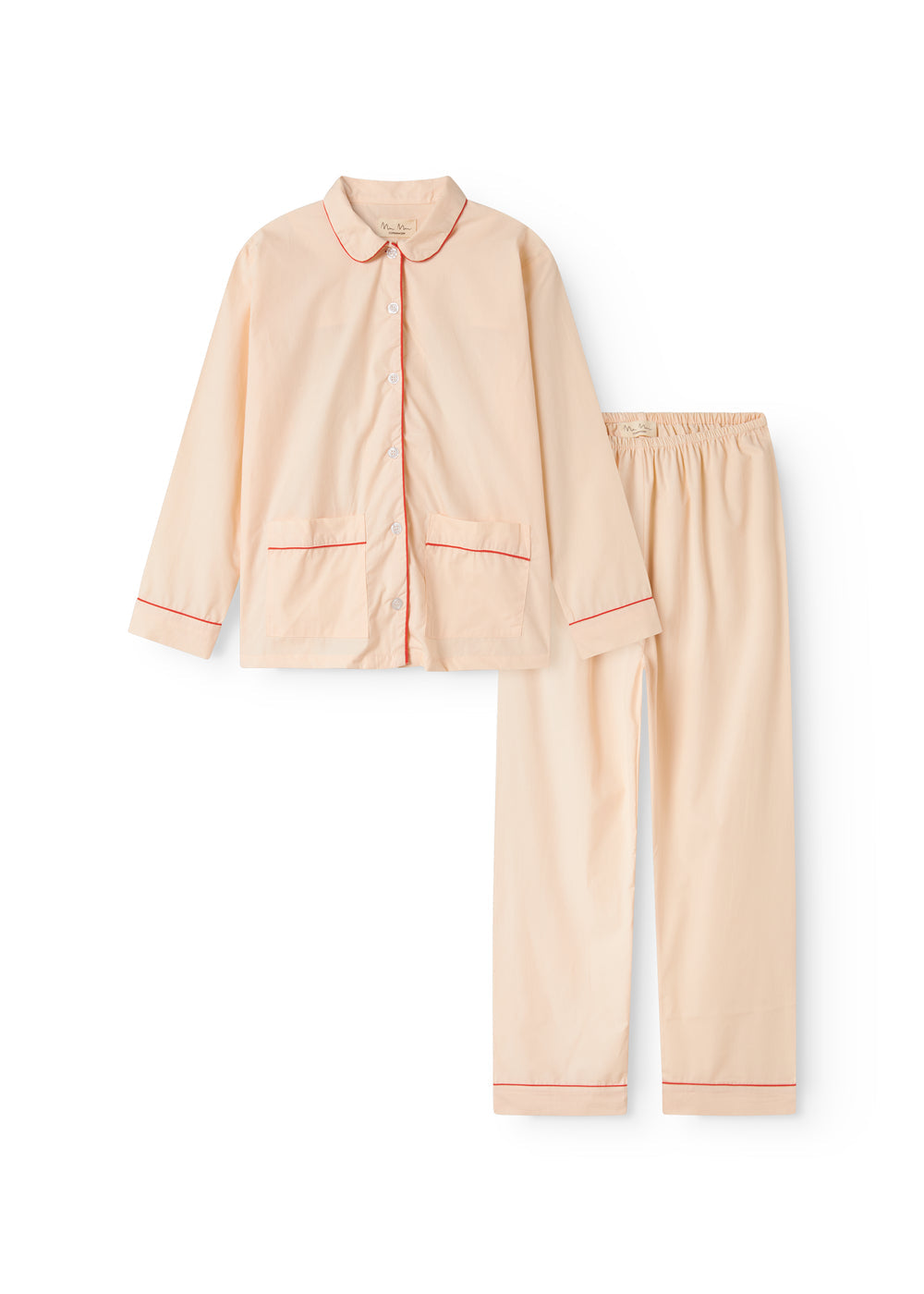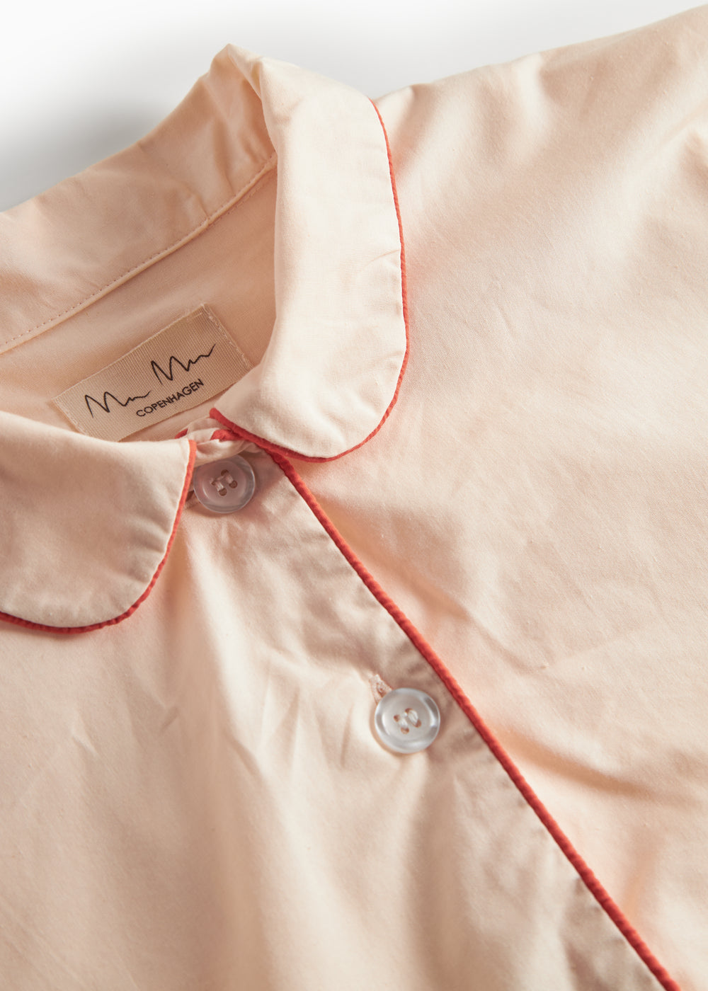 Pyjamassæt til kvinder med skjorte og bukser i en løs pasform. Skjorten har knaplukning samt to lomme foran og bukserne har elastik i taljen. Pyjamassættet har fine kontrast piping detaljer.