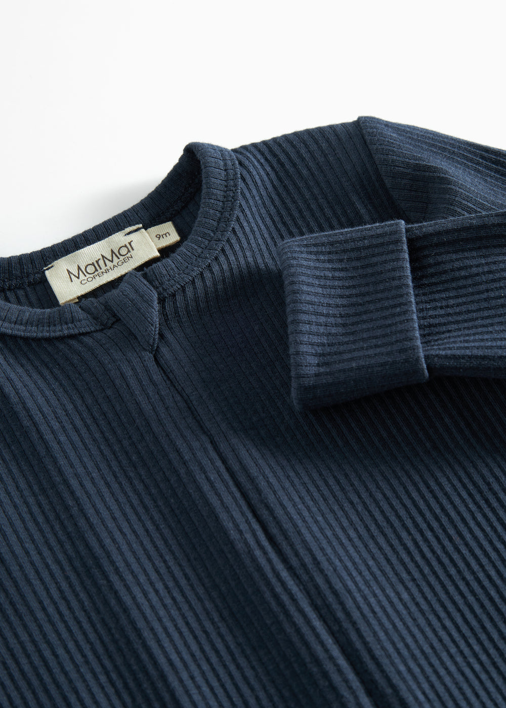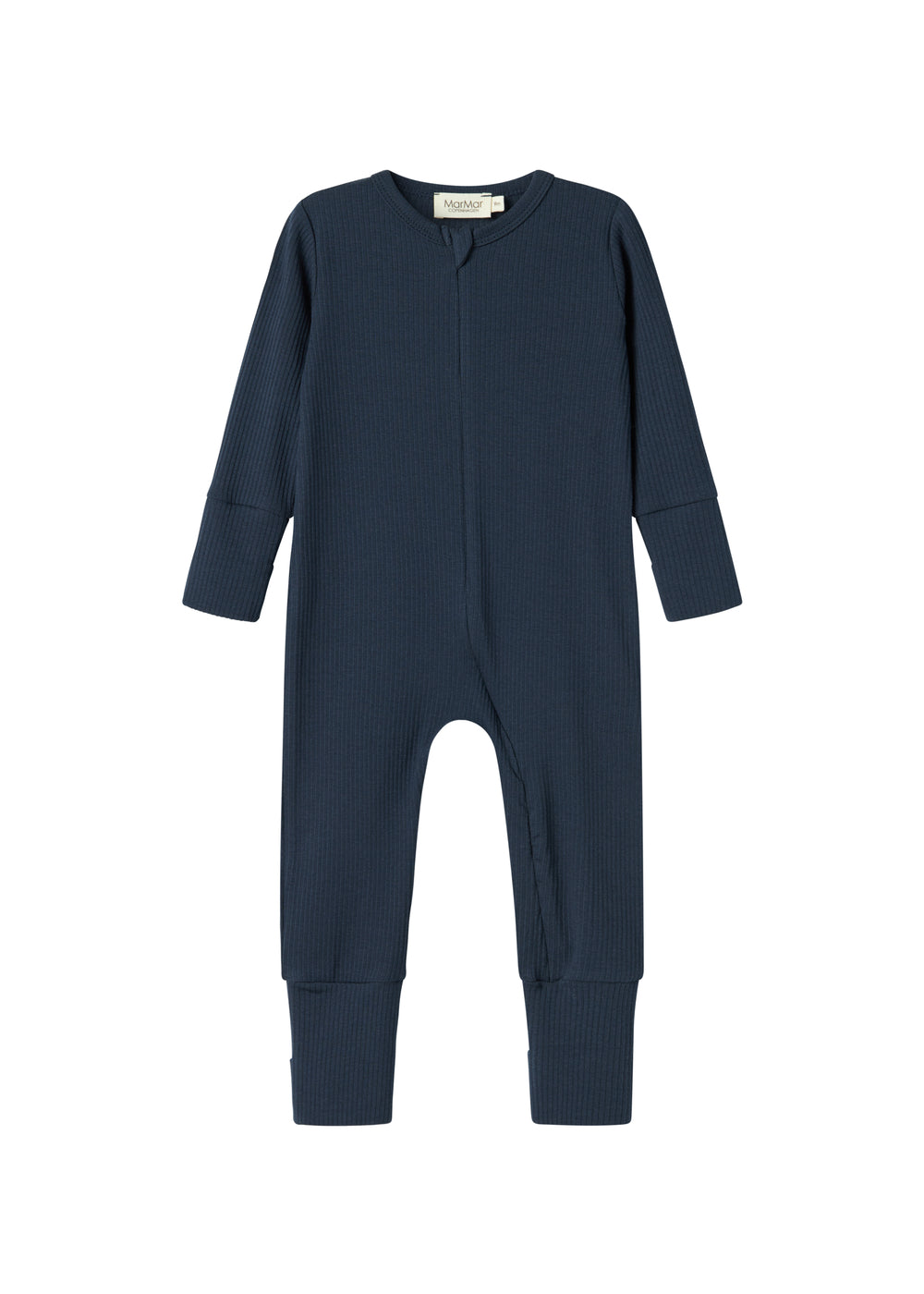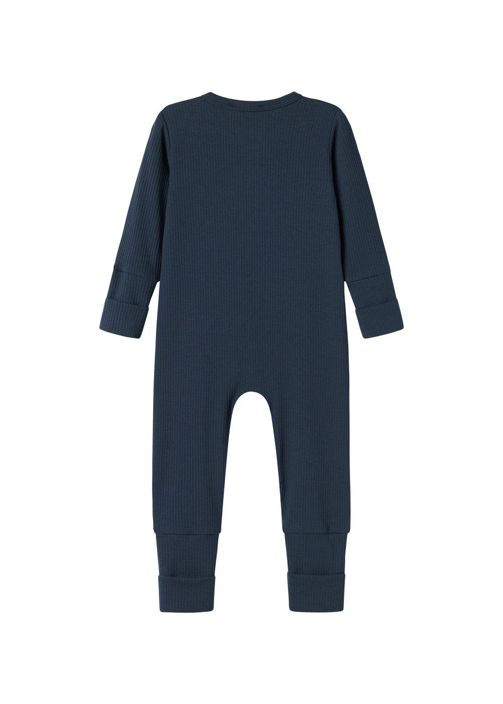 Enkel langærmet heldragt der kan lynes helt fra hals og ned langs det ene ben med lynlås for nem bleskiftning. Heldragten har ombuk ved både ærmer og ben, som kan justeres i takt med barnets vækst. Heldragten har ydermere foldbar vante/strømpe funktion fra str. 2-4M. Heldragten er ribstrikket, blød, strækbar og behagelig at have på.