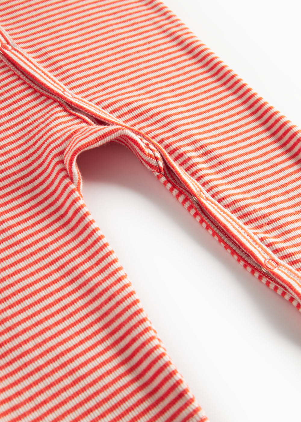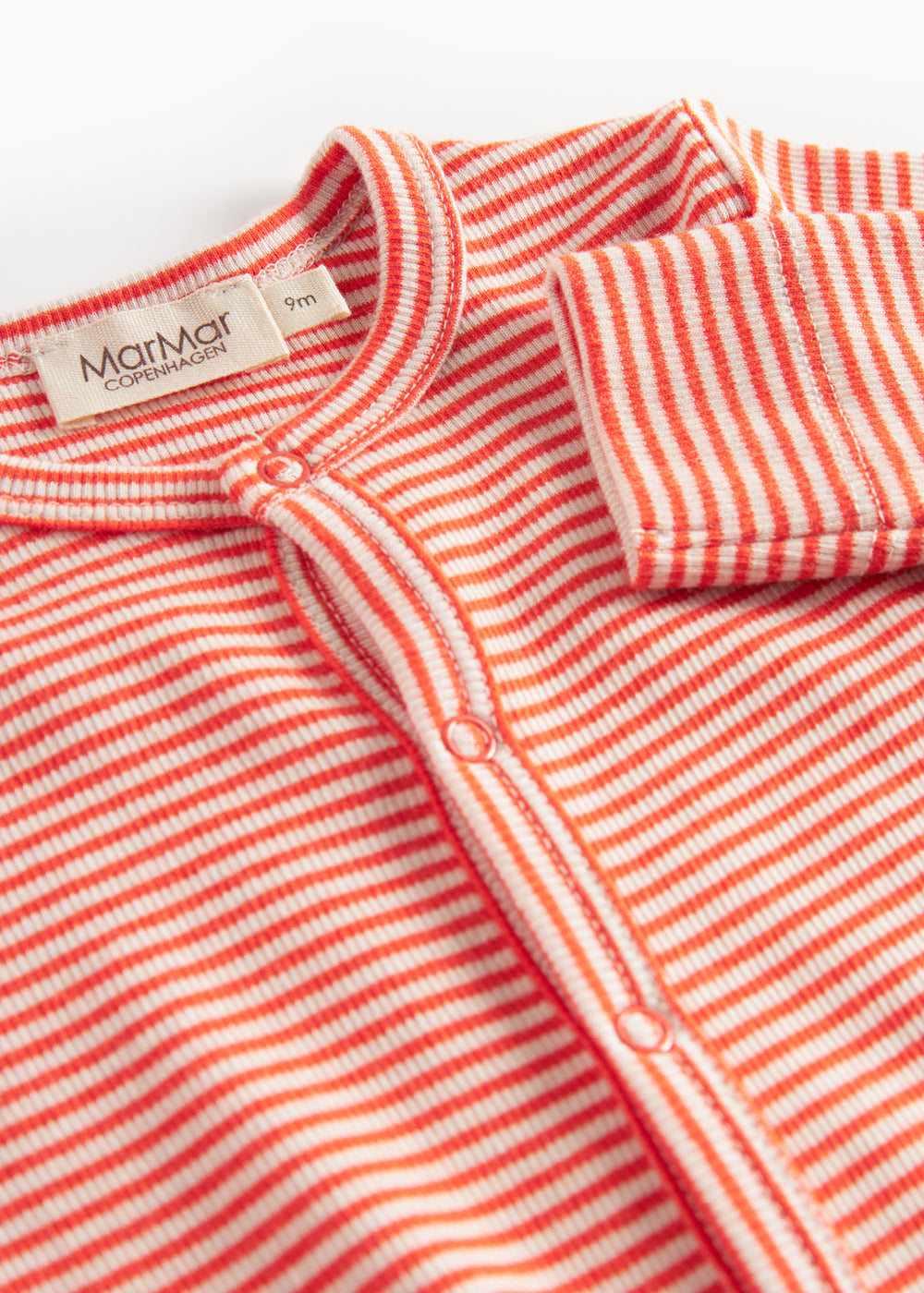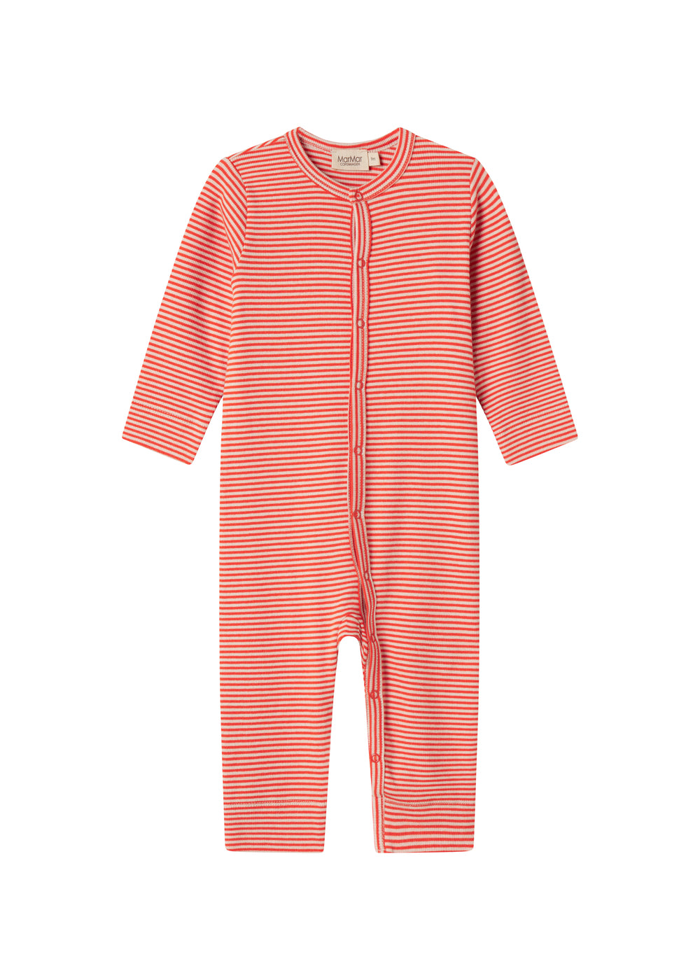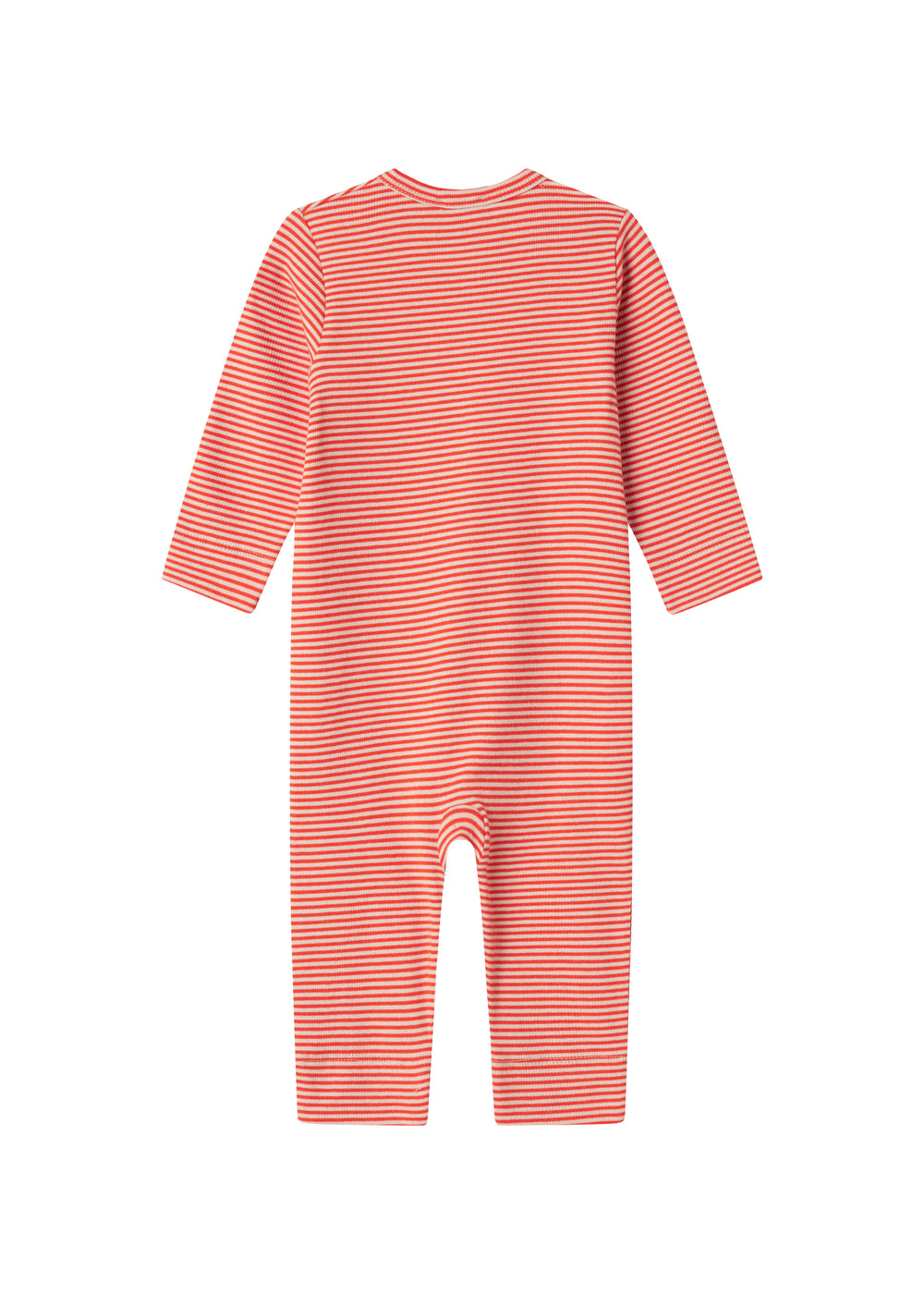 Rummelig baby heldragt med fine striber, trykknaplukning hele vejen fra halsåbning til bukseben. Heldragten kan knappes helt op på det ene ben for nem bleskiftning. Heldragten er både blød, holder form og farve og har elastan i sig som gør den strækbar og behagelig at have på.
