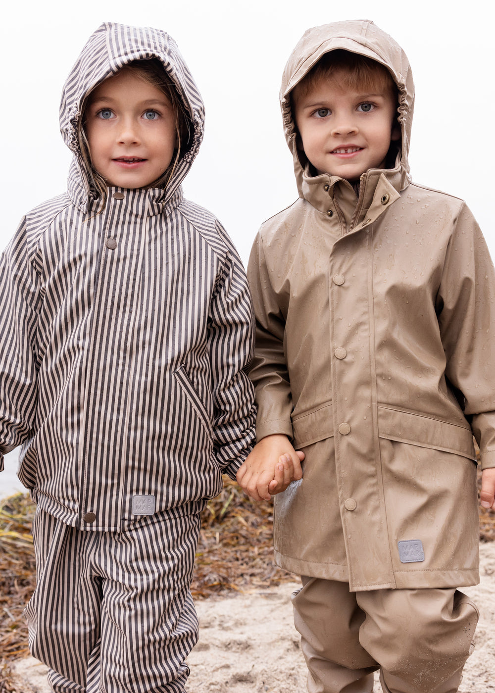 To børn iført regntøj, det ene barn bærer beige regnbukser og jakke
