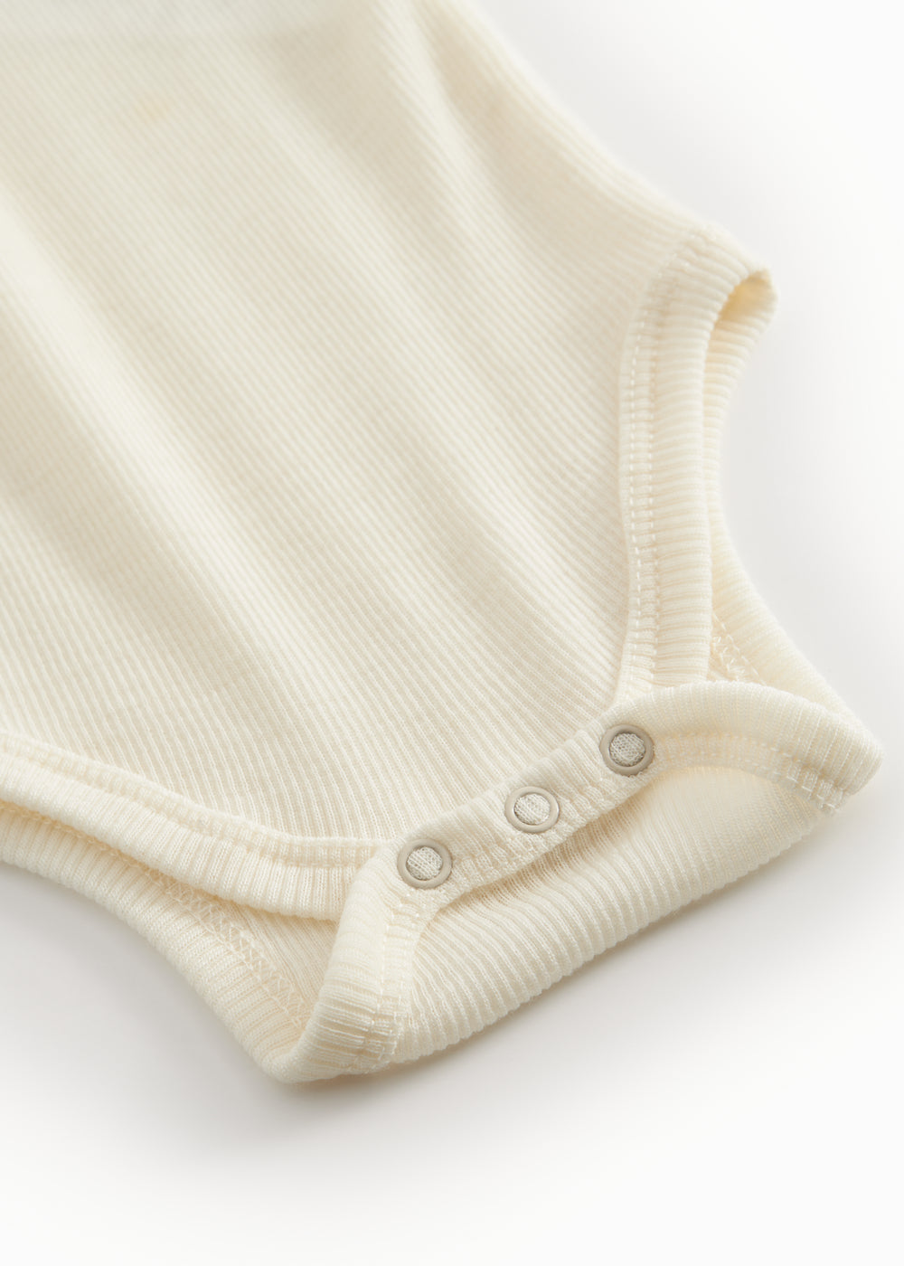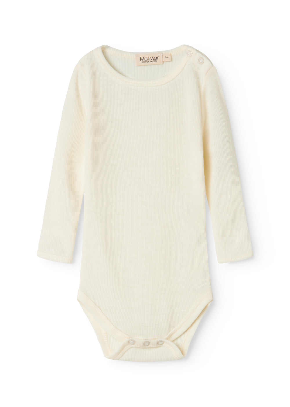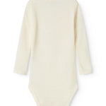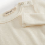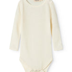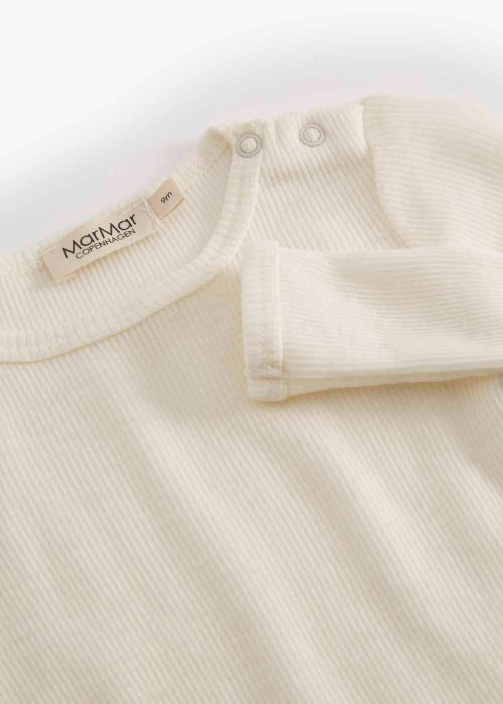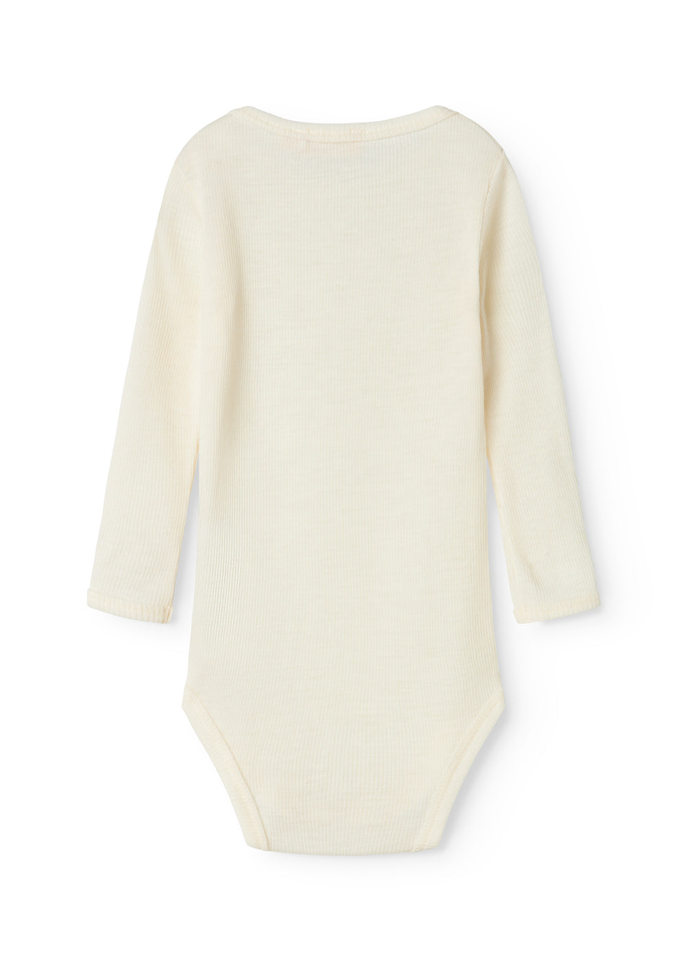 Enkel langærmet bodystocking, der bliver lukket med trykknapper på venstre skulder samt mellem benene for nem bleskiftning.