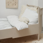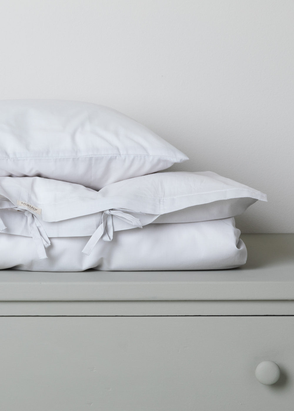 Sengetøj med betræk til dyne og hovedpude. Dynebetrækket lukkes med bindebånd i fodenden