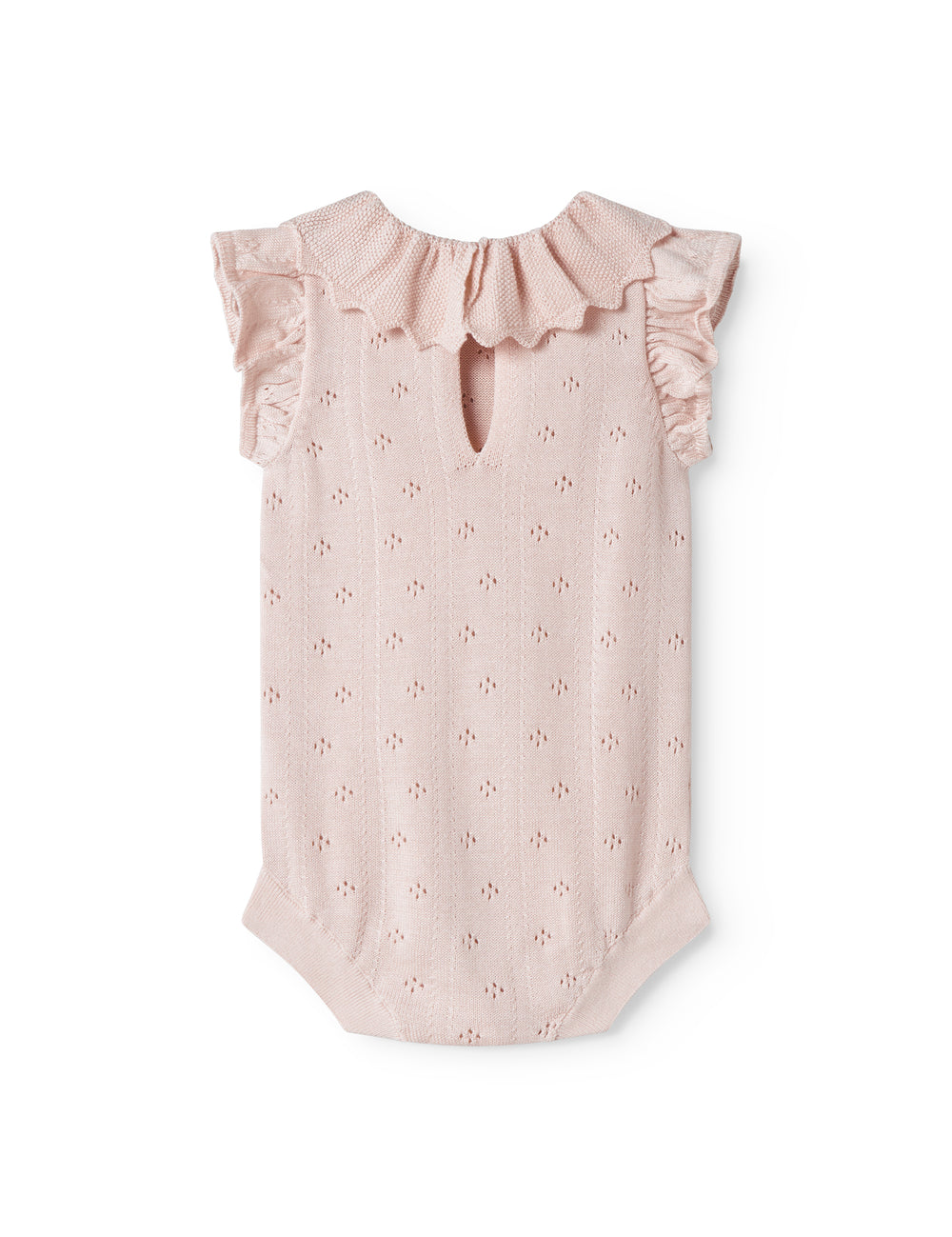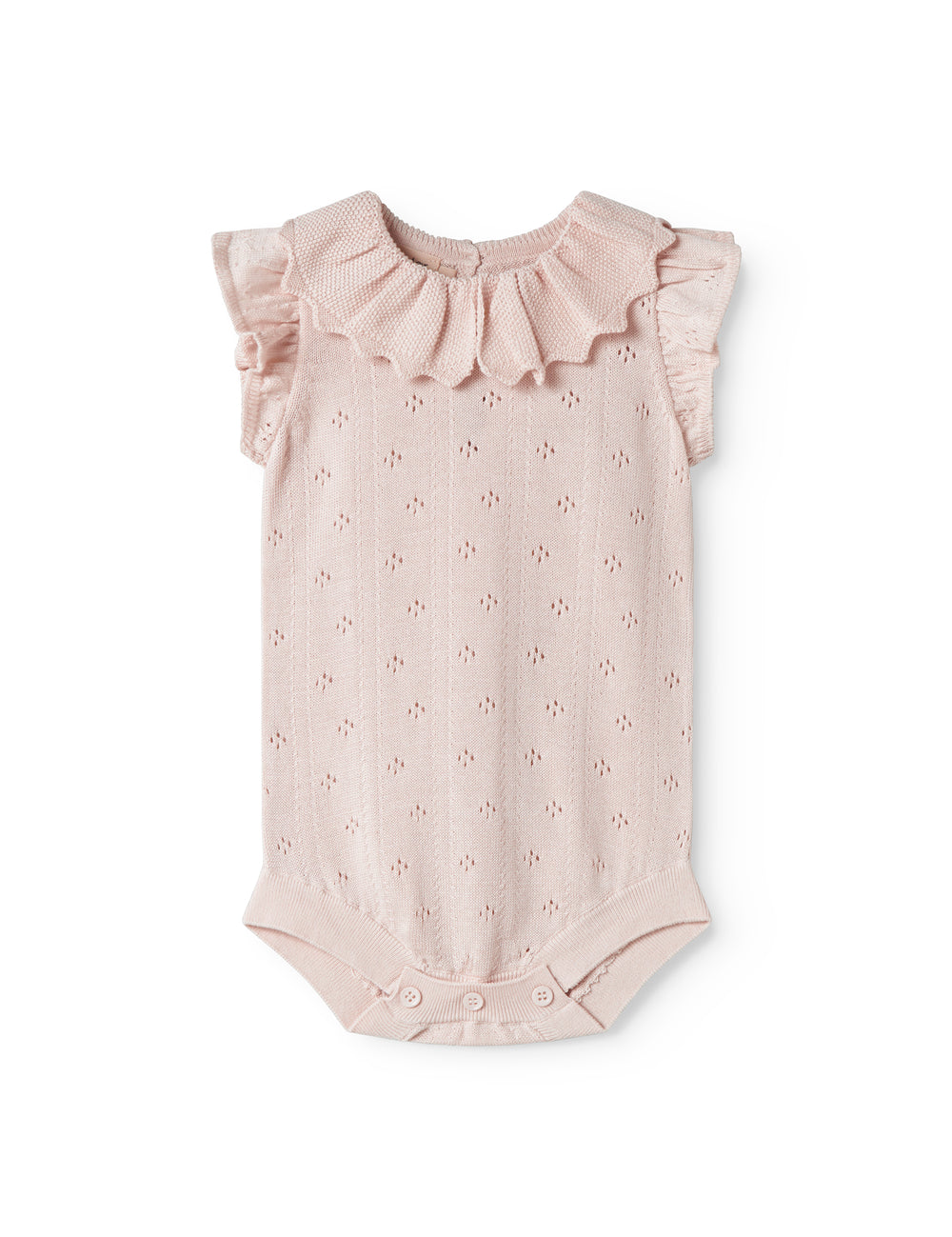 Baby iført Kortærmet lyserød strikket  bodystocking med hulmønster og flæsekrave